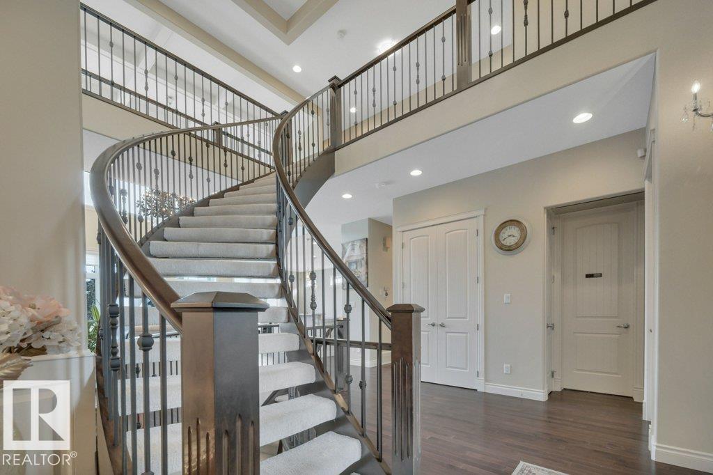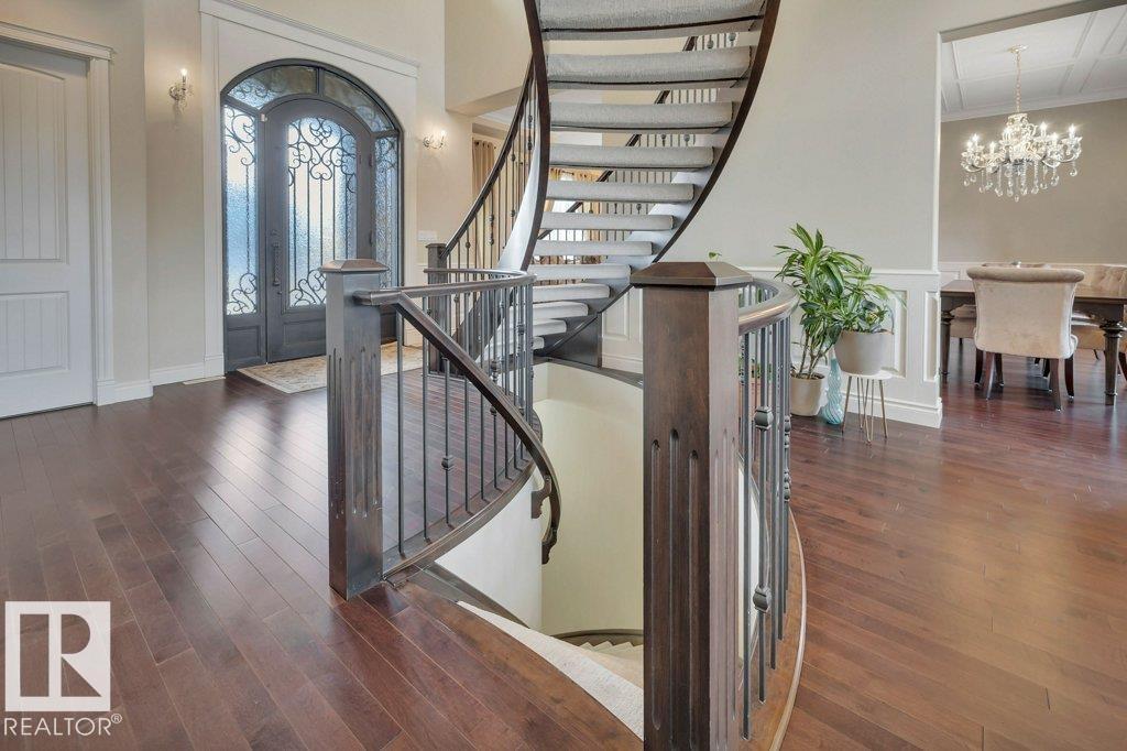 Backing onto the ravine on prestigious Howatt Drive in the golf community of Jagare Ridge, this 3575 sqft custom walkout estate offers privacy, space, and timeless craftsmanship. A grand 19’ foyer and sweeping spiral staircase welcome you into elegant living and dining spaces finished with hardwood floors, custom ceilings, and detailed wainscoting. The chef’s kitchen features premium appliances, a custom hood fan, large island, and abundant cabinetry, opening to a covered deck with fireplace and peaceful nature views. A rare main floor bedroom with ensuite provides flexibility for guests or multi-generational living. Upstairs offers a bonus room, laundry, and three spacious bedrooms including a luxurious primary retreat with spa-inspired ensuite and private balcony overlooking the ravine. The walkout basement with 9’ ceilings, rough-ins, and separate garage entry is ready for future development. Oversized triple attached garage and professionally landscaped yard complete this exceptional home. A must see! (id:63190)
