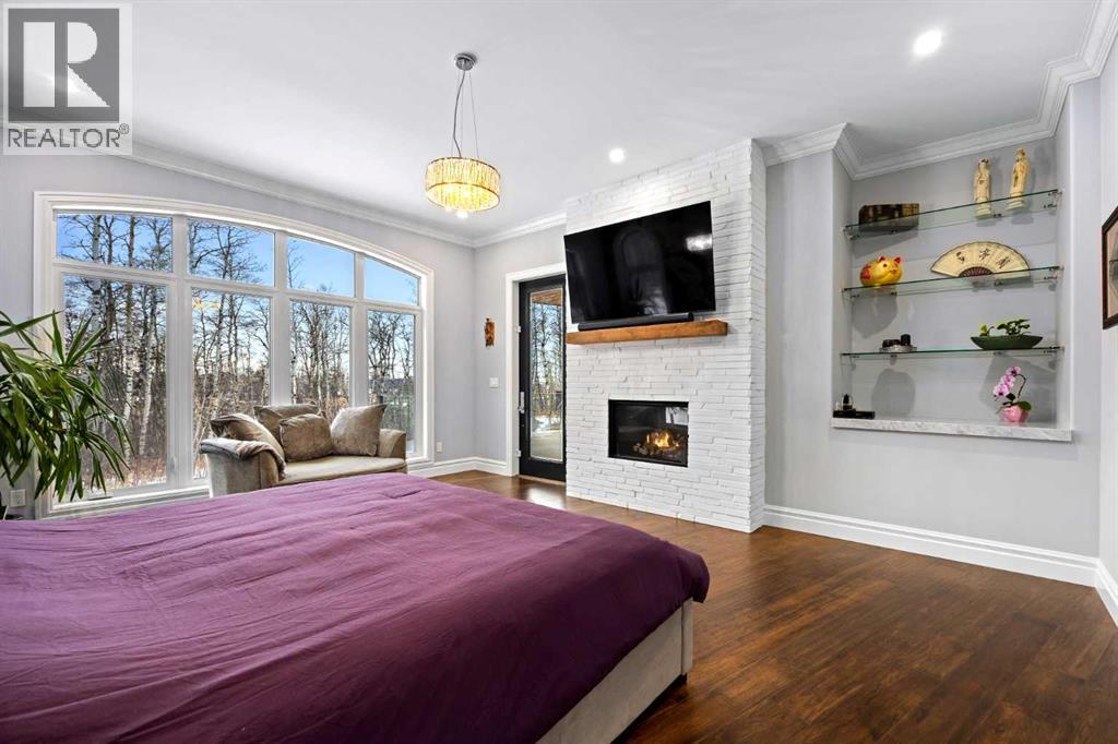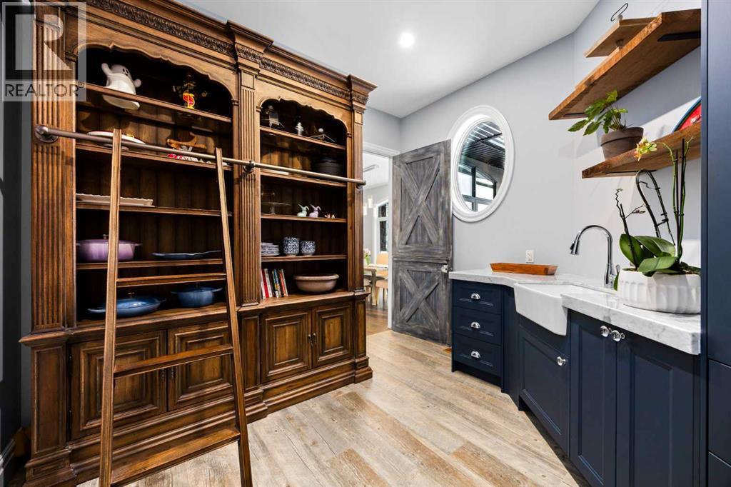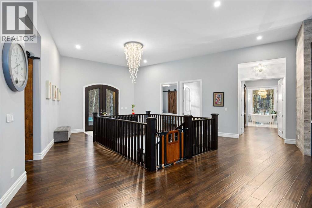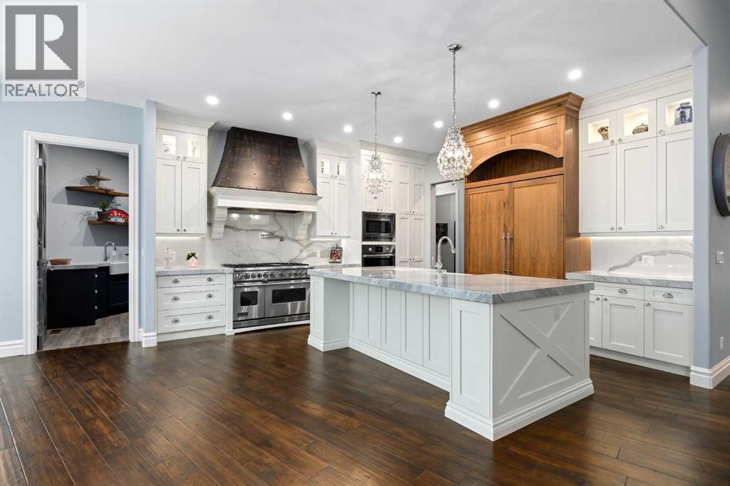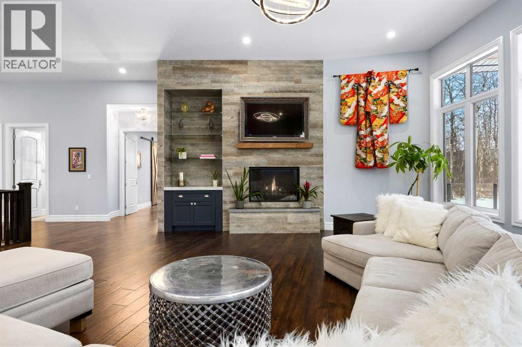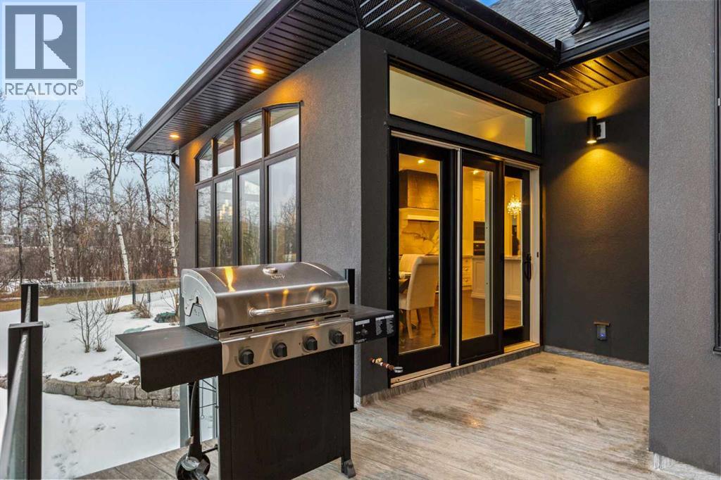 As the city fades in your rearview mirror and the trees begin to rise around you, the pace begins to change. Beyond the gates, 3.16 acres of manicured grounds unfold, bordered by environmental reserves and riding trails along two sides. What awaits is not simply an acreage, but a private estate retreat—an escape from the fast pace of the city, where space, quiet, and nature take the lead.Perfectly positioned just minutes from Calgary’s city limits and only ten minutes to Okotoks, this three-bedroom, two-bathroom walkout executive bungalow offers the rare privilege of rural tranquility without sacrificing location and urban convenience.Inside, more than 3,400 square feet of main-floor living is defined by openness and scale. Twelve-foot ceilings crown the principal living area, while ten-foot ceilings throughout the remainder of the home maintain a sense of architectural harmony, openness, and space. Expansive windows frame mature trees, filling the interior with natural light and creating a seamless connection to the surrounding landscape.At the heart of the home, the kitchen is both striking and functional. A substantial gas range with grill and copper hood anchors the space, complemented by a built-in wall oven, warming drawer, and full-size refrigerator and freezer wrapped in custom maple-stained cabinetry. The oversized island becomes a natural gathering place, equally suited to quiet morning coffee or elegant entertaining, while a well-appointed butler’s pantry with sink provides additional prep space, generous storage, and seamless flow for hosting.The primary suite offers a retreat within the home. Enter through double doors to a serene space warmed by a gas fireplace framed in sandblasted Italian marble, with windows overlooking the aspen canopy beyond. The ensuite feels reminiscent of a private spa, finished in marble tile with a deep soaker tub beside an oversized picture window, a walk-in glass-enclosed shower, dual vanities, and an expansive walk -in closet with illuminated built-in cabinetry. Direct access to the stunning covered rear deck invites relaxed moments outdoors beneath open prairie skies—an inviting place to unwind and take in the surrounding landscape. The walkout lower level presents an opportunity to expand the estate further, offering ten-foot ceilings, rough-ins for three additional bathrooms, a separate furnace, and access to a stamped concrete patio with pine ceiling and recessed lighting. A dedicated podcast studio is already in place, ideal for entrepreneurs, executives, or creators seeking a private professional space at home.An oversized triple garage, RV parking, paved driveway, gated entry, and a discreet fenced dog run complete the property.This is country living redefined—where privacy, craftsmanship, convenience, and space come together to create a home that feels both grounded in nature and effortlessly refined. (id:63190)