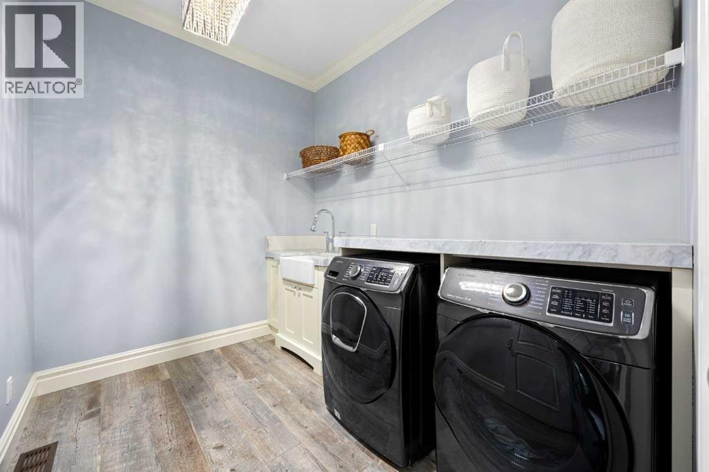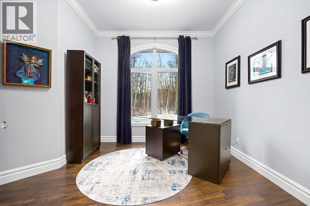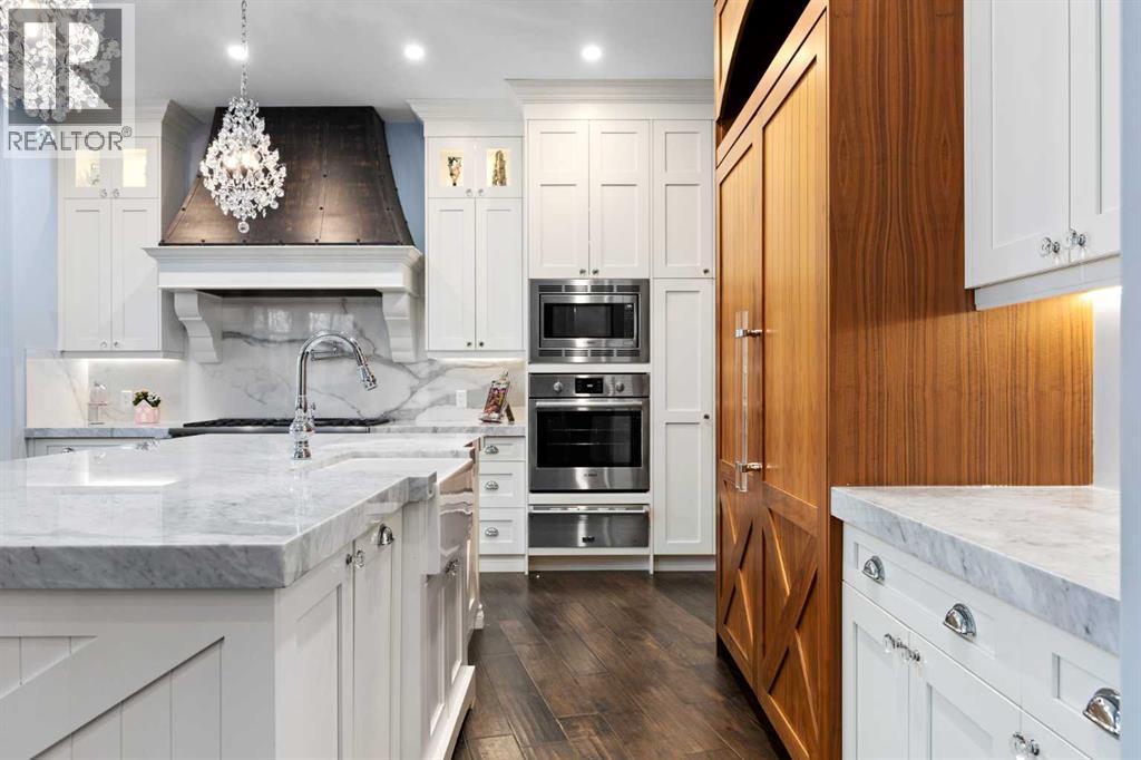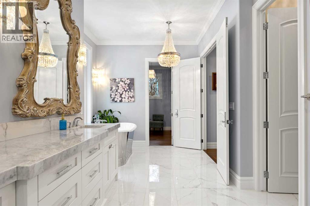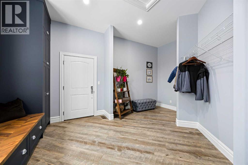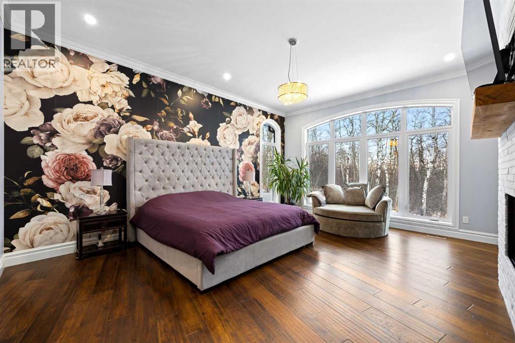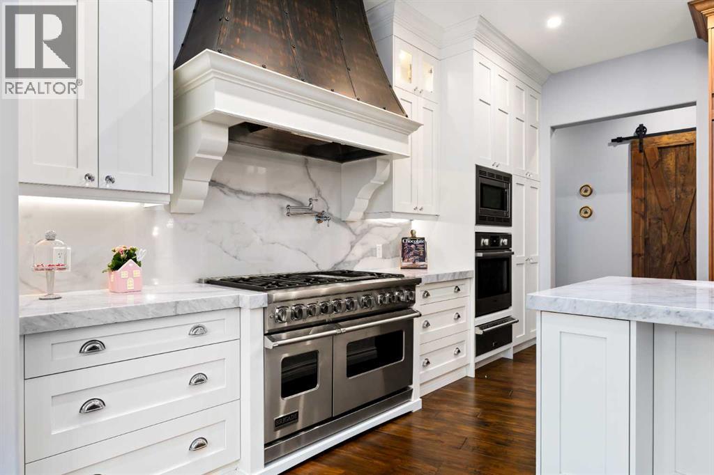 As the city fades in your rearview mirror and the trees begin to rise around you, the pace begins to change. Beyond the gates, 3.16 acres of manicured grounds unfold, bordered by environmental reserves and riding trails along two sides. What awaits is not simply an acreage, but a private estate retreat—an escape from the fast pace of the city, where space, quiet, and nature take the lead.Perfectly positioned just minutes from Calgary’s city limits and only ten minutes to Okotoks, this three-bedroom, two-bathroom walkout executive bungalow offers the rare privilege of rural tranquility without sacrificing location and urban convenience.Inside, more than 3,400 square feet of main-floor living is defined by openness and scale. Twelve-foot ceilings crown the principal living area, while ten-foot ceilings throughout the remainder of the home maintain a sense of architectural harmony, openness, and space. Expansive windows frame mature trees, filling the interior with natural light and creating a seamless connection to the surrounding landscape.At the heart of the home, the kitchen is both striking and functional. A substantial gas range with grill and copper hood anchors the space, complemented by a built-in wall oven, warming drawer, and full-size refrigerator and freezer wrapped in custom maple-stained cabinetry. The oversized island becomes a natural gathering place, equally suited to quiet morning coffee or elegant entertaining, while a well-appointed butler’s pantry with sink provides additional prep space, generous storage, and seamless flow for hosting.The primary suite offers a retreat within the home. Enter through double doors to a serene space warmed by a gas fireplace framed in sandblasted Italian marble, with windows overlooking the aspen canopy beyond. The ensuite feels reminiscent of a private spa, finished in marble tile with a deep soaker tub beside an oversized picture window, a walk-in glass-enclosed shower, dual vanities, and an expansive walk -in closet with illuminated built-in cabinetry. Direct access to the stunning covered rear deck invites relaxed moments outdoors beneath open prairie skies—an inviting place to unwind and take in the surrounding landscape. The walkout lower level presents an opportunity to expand the estate further, offering ten-foot ceilings, rough-ins for three additional bathrooms, a separate furnace, and access to a stamped concrete patio with pine ceiling and recessed lighting. A dedicated podcast studio is already in place, ideal for entrepreneurs, executives, or creators seeking a private professional space at home.An oversized triple garage, RV parking, paved driveway, gated entry, and a discreet fenced dog run complete the property.This is country living redefined—where privacy, craftsmanship, convenience, and space come together to create a home that feels both grounded in nature and effortlessly refined. (id:63190)