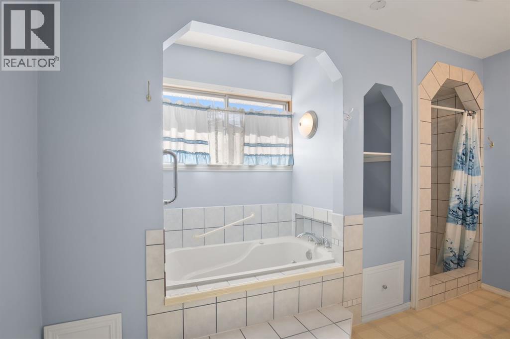 Great curb appeal on this bungalow with a newer front deck, located on a quiet street. The home offers an open floor plan with the kitchen looking onto the living room. There are 2 bedrooms on the main level. For your convenience there is main floor laundry. You'll appreciate the large bathroom with a separate shower and jet tub. The basement is finished with plenty of rec room and storage space + a 2 piece bathroom. The home sits on a large lot and offers a detached single garage with an attached shed + a second shed. Excellent walkability to downtown. (id:63190)