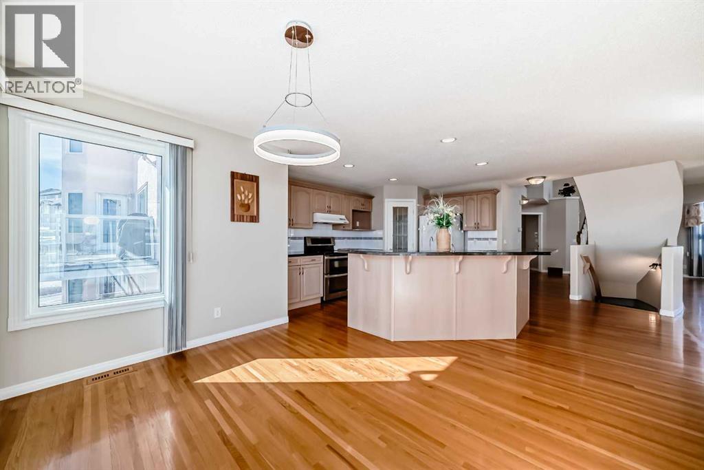 Offering ~3,200 sq. ft. of developed living space in a well-established NW Calgary community Hamptons. This meticulously maintained move-in-ready home sits on a premium corner lot with newly painted stucco siding and recently upgraded triple-glaze windows with 25-year warranty.The main floor features open-to-above ceilings, large windows for natural light, and an open-concept layout. The kitchen includes granite countertops, raised eating bar, and walk-in pantry, and connects to the formal dining room, breakfast nook, and living room with fireplace.Upstairs offers a primary bedroom with walk-in closet and 4-piece ensuite with jetted corner tub, plus two additional bedrooms and a full bathroom.The fully developed walk-out basement features a large family room with second fireplace, ceramic tile flooring, and two additional rooms suitable for guests or office use. A full-sized 8-ft rich cherry wood pool table is included.Outdoor space includes a maintenance-free upper deck with glass railings and gorgeous views, plus a lower patio with built-in wood pergola and lattice trellis, designed for outdoor seating and BBQs. The home is close to schools, parks, golf, shopping, and major routes. (id:63190)