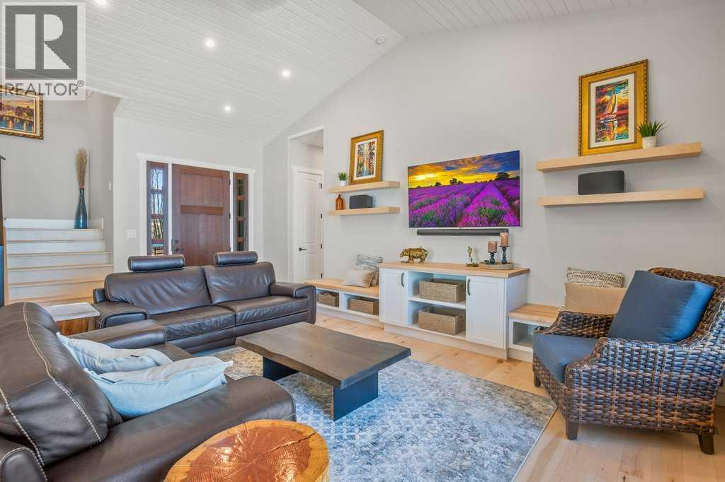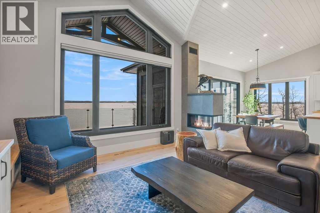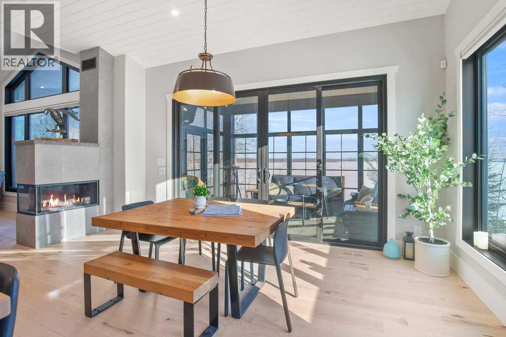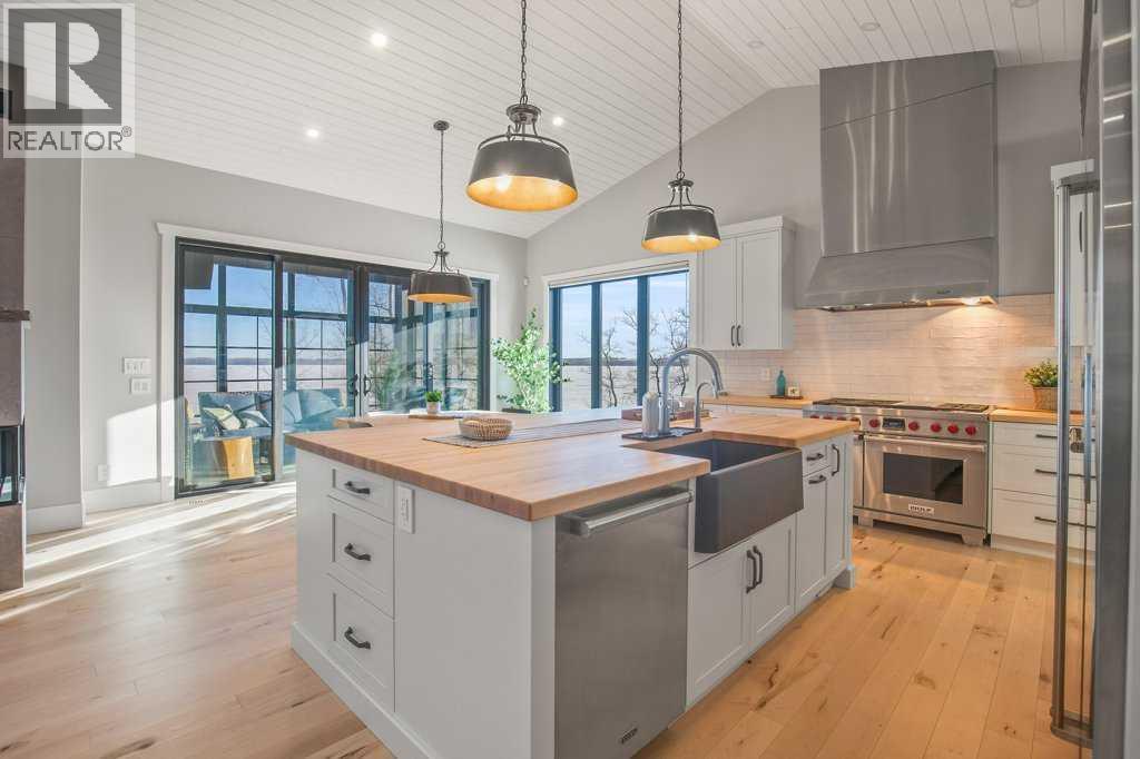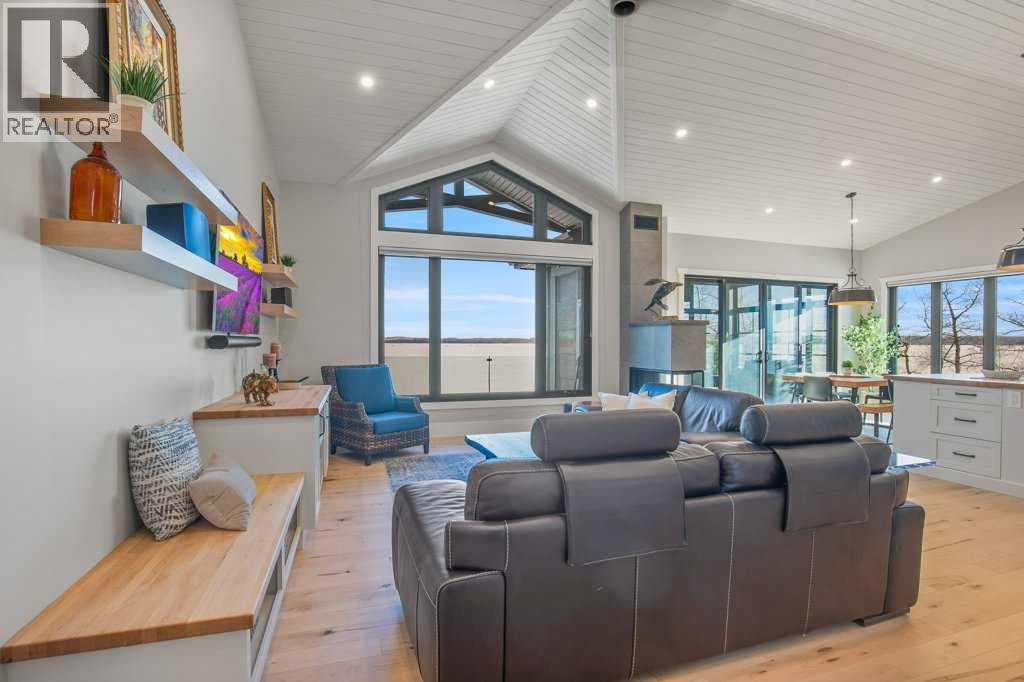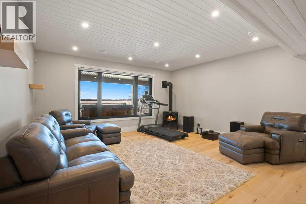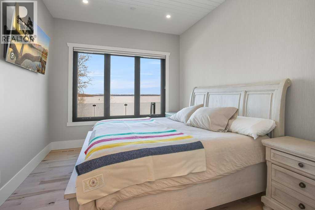 Experience luxury lakefront living in this exceptional property on the shores of Sylvan Lake. Situated on a quiet, no-exit close, this private and beautifully landscaped property offers 78 feet of pristine lakefront with level, easy access to the water, making it ideal for enjoying everything lake life has to offer.The home welcomes you through a stunning exposed aggregate entry that sets the tone for the craftsmanship found throughout. Inside, the main living area is open, bright, and spacious, highlighted by vaulted shiplap ceilings that create a warm lake-house feel. A striking three-sided fireplace anchors the living room, while massive windows frame spectacular lake views.The main floor features maple hardwood flooring and upgraded 8-foot doors, leading into a chef’s kitchen designed for both entertaining and everyday living. High-end Wolf appliances, a built-in Miele coffee machine, and upgraded treated wood countertops elevate the space with style and function. Just off the living area is a heated sunroom with TV, the perfect spot to relax and take in the views year-round.A practical and well-designed garage entry includes laundry, a sink, and a butler’s pantry—ideal for coming in from the lake or the garage. The spacious primary bedroom offers incredible views along with his-and-hers walk-in closets and a beautiful ensuite featuring in-floor heat, dual sinks, and an oversized shower. A second bedroom and a full 4-piece bathroom complete the main level.Step outside onto the oversized deck with seamless glass railing, providing uninterrupted lake views and stairs leading to the lower level.Above the triple garage is a huge bonus room complete with surround sound—perfect for movie nights, a games area, kids’ play space, or hosting extra guests. This level also includes a half bath and dedicated office space.The fully finished walkout basement is designed for lake life. It opens to a large covered exposed-aggregate patio, complete with an outdoor shower fo r rinsing off after a swim or hot tub. There are two additional bedrooms, both with walk-in closets, a 3-piece bathroom, cozy gas fireplace, and an inviting wet bar with full fridge.A standout feature is the lake-toy storage room, fully finished with epoxy flooring and accessible through a large garage door, making it easy to store and clean gear.Car enthusiasts and hobbyists will appreciate the triple heated garage, equipped with in-floor heat, drains, epoxy flooring, and even a dog wash station.Additional features include Gemstone exterior lighting, central air conditioning, and central vacuum. This luxury lakefront home is turn key and ready to go. Just bring your boat and start living the lake life! (id:63190)
