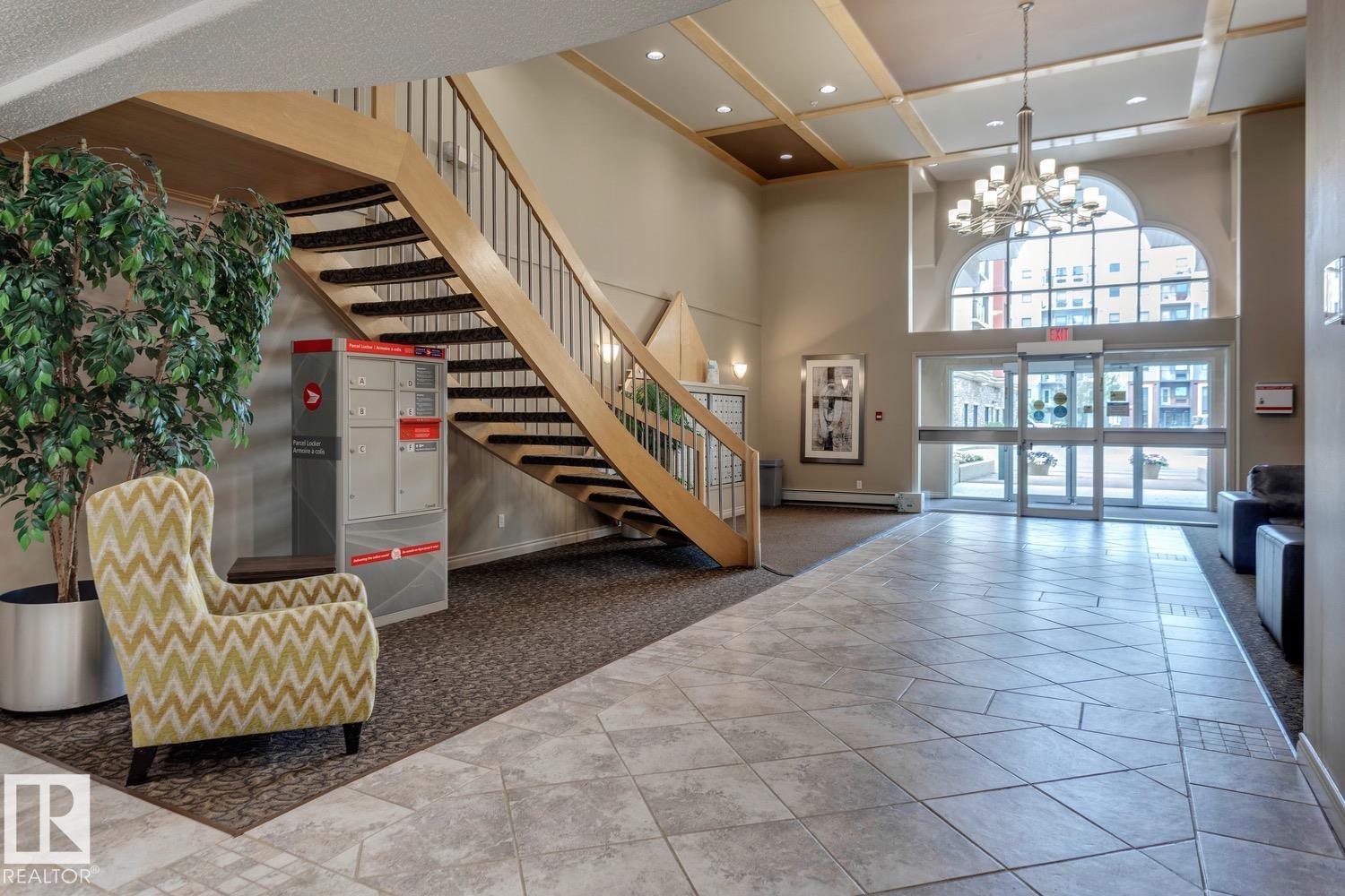 Welcome to this beautifully situated condo in downtown Edmotnon. This well-maintained home features an open-concept layout with a modern kitchen, complete with a central eat-up island, quartz countertops, tile backsplash, upgraded appliances, and vinyl plank flooring. The living area opens onto a large, west-facing covered patio with a gas line for your BBQ, perfect for enjoying sunny evenings. The generous primary bedroom offers his-and-hers closets with direct access to the full bathroom. A versatile den, along with a roomy in-suite laundry and storage area, adds to the functionality. Freshly painted throughout, this unit is move-in ready. Enjoy the convenience of a titled, heated underground parking stall with a storage cage. The building is well-managed with professional management and offers excellent amenities, including a fitness center and guest suite. Ideally located in the heart of the city—just steps to shops, restaurants, public transit, Grant MacEwan, and the Ice District. Virtually staged. (id:63190)