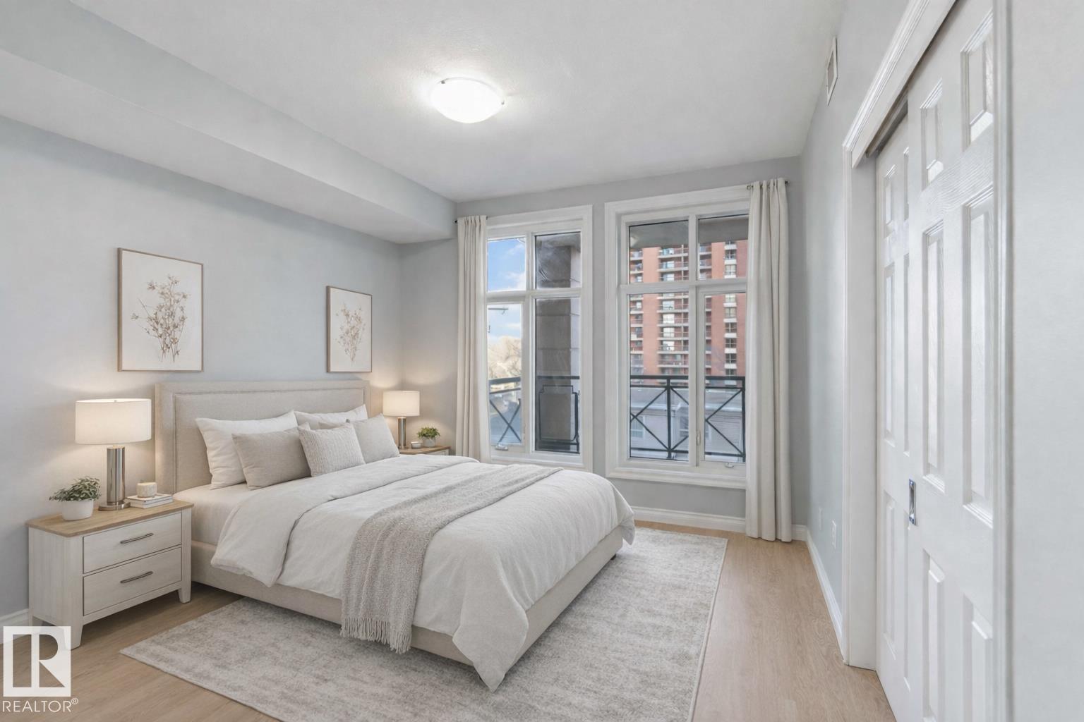 Welcome to this nearly 1,100 sq. ft. 4th-floor condo, featuring 9-foot ceilings that create a bright, open, and airy atmosphere in an excellent location. The open-concept kitchen boasts ceiling-height cabinetry and a pantry for excellent storage, while new vinyl plank flooring in a warm light wood tone flows into the spacious living room with floor-to-ceiling windows that fill the space with natural light. The primary bedroom includes a private 5-piece ensuite, while the second bedroom works perfectly as a guest room or home office, with another full bathroom nearby. This home also offers in-suite laundry, ample storage, a private balcony, and secure underground parking. Enjoy exceptional value with condo fees that include heat, water, and electricity, making monthly budgeting simple and predictable. Located just steps from the river valley! (id:63190)