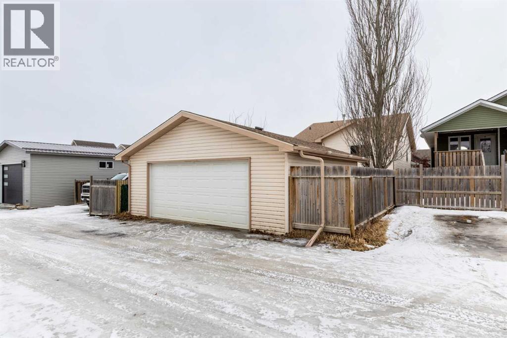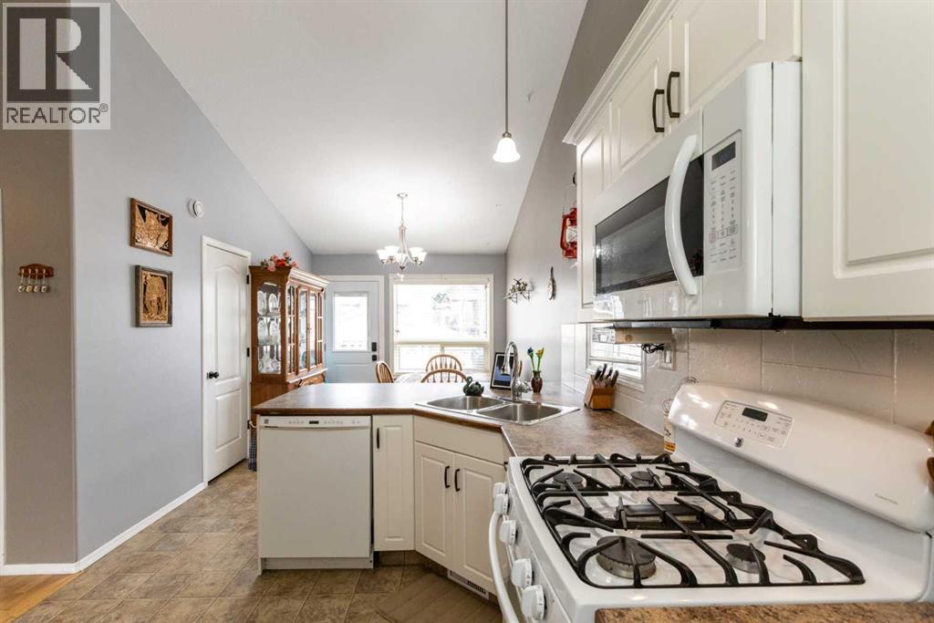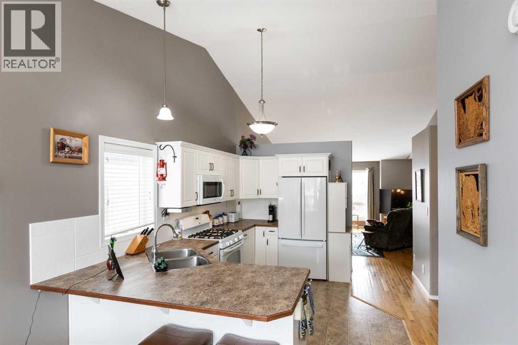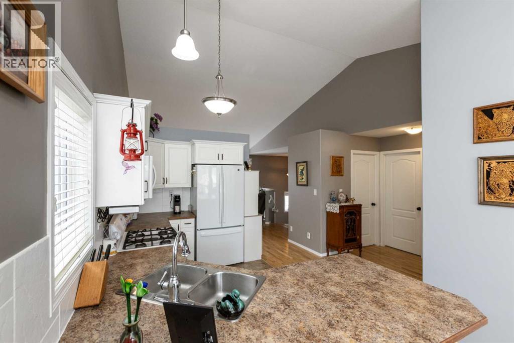 Welcome to this beautifully maintained bi-level in the growing community of Penhold, offering a functional layout, thoughtful updates, and excellent value. From the moment you arrive, the covered front porch sets the tone—perfect for morning coffee or unwinding at the end of the day.Step inside to a bright and inviting main floor featuring vaulted ceilings that enhance the sense of space and natural light. The kitchen is both practical and welcoming, complete with a pantry and adjoining dining area, making everyday living and entertaining effortless.The primary bedroom is privately located at the back of the home and features a spacious ensuite, creating a comfortable retreat. A second bedroom and full bathroom complete the main level.The recently developed basement adds impressive additional living space, highlighted by large windows and a generous recreation area. You’ll also find a third bedroom, full bathroom, and a versatile office that could easily function as a fourth bedroom, gym, or hobby space.Outside, enjoy a fully fenced yard with plenty of room for kids and pets, along with a rear deck ideal for relaxing or hosting. The double detached garage provides ample parking and storage.Situated in a quiet location within walking distance to local amenities, this home offers the perfect blend of small-town charm and everyday convenience. (id:63190)