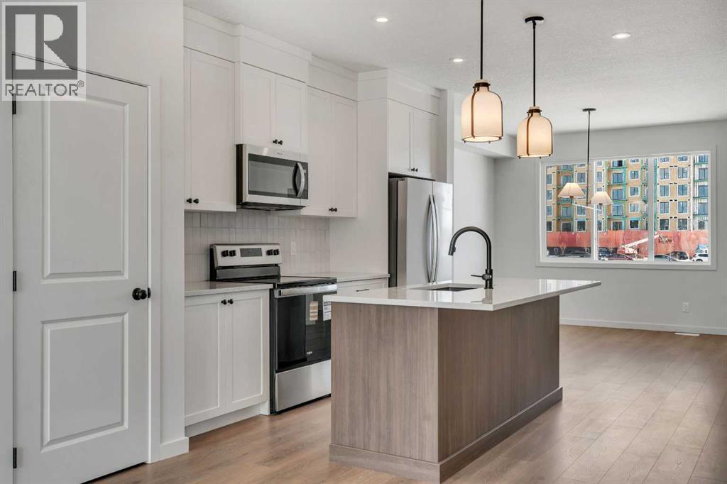 Welcome to 231 Bartlett Crescent SE, a stunning and contemporary haven nestled in the vibrant community of Rangeview. This bright and spacious home offers a seamless blend of modern design and functional living. Step through the inviting front porch into the sun-drenched open-concept great room, where expansive windows bathe the space in natural light. At the heart of the home is the beautifully designed center kitchen, featuring cabinets extended to the ceiling, a large central island perfect for casual dining and entertaining, and designer-curated finishes throughout, including quartz countertops, a silgranit sink, and sleek black plumbing fixtures. Upstairs, retreat to the expansive primary bedroom, a true sanctuary complete with an upgraded ensuite featuring double sinks, a glass shower, and a spacious walk-in closet offering ample storage. The upper level also includes a convenient laundry room, a full bathroom, and generously sized additional bedrooms, perfect for family living or hosting guests. The basement includes a 3-piece rough-in, offering excellent potential for future development. Additional thoughtful upgrades include a side door entrance with upgraded laminate landing, providing flexibility for future basement access or separate living space. A separate traditional rear entrance can be used for direct access to the yard and future garage. Enjoy outdoor living with an east-facing backyard, ideal for morning sun and relaxing evenings. Perfectly situated in the growing community of Rangeview, this home is just steps from the future Commercial Village, Harvest Hall, and Community Greenhouse—connecting you to convenience, culture, and a vibrant community lifestyle. (id:63190)