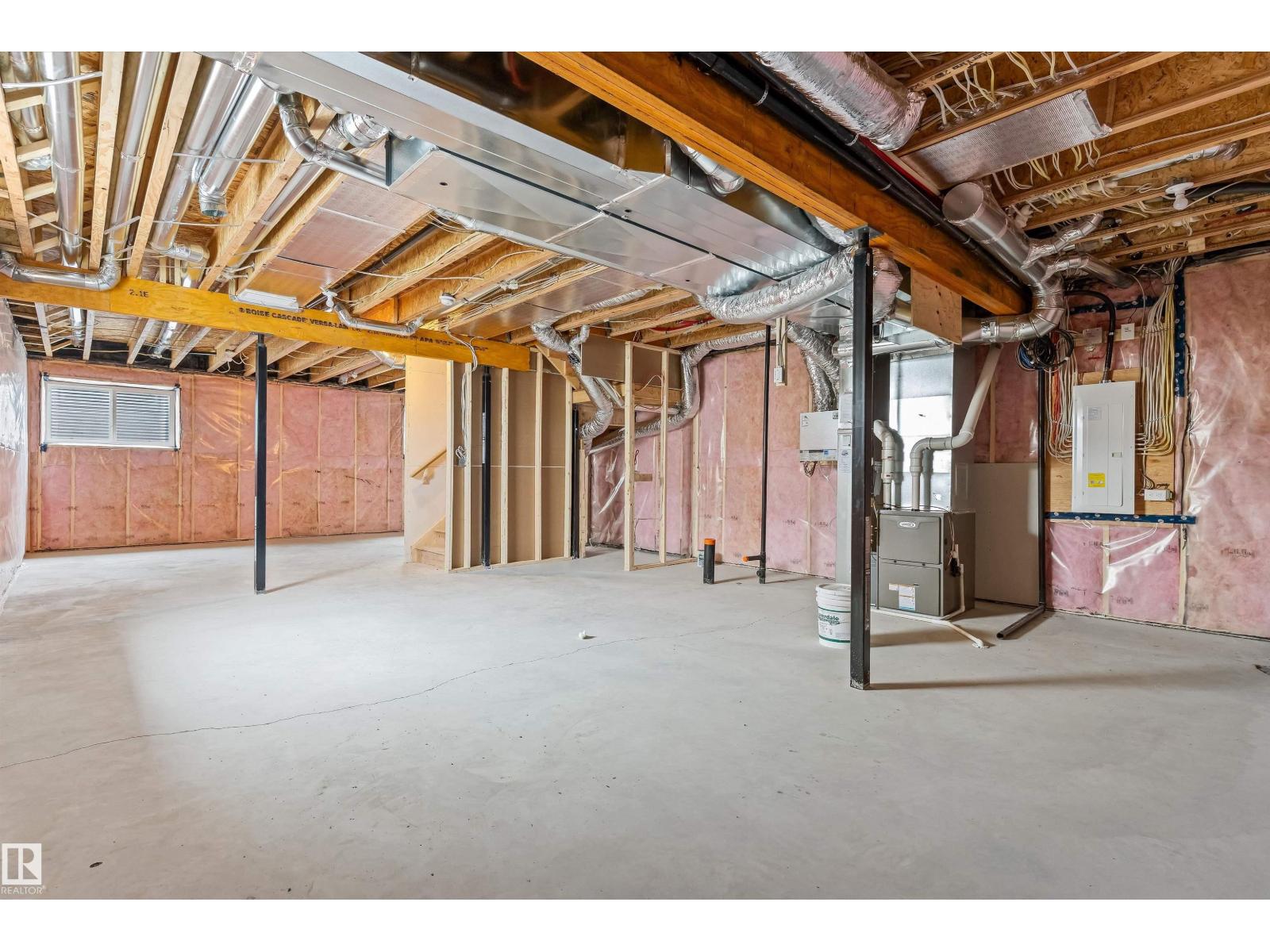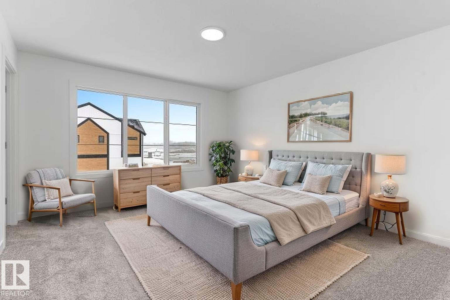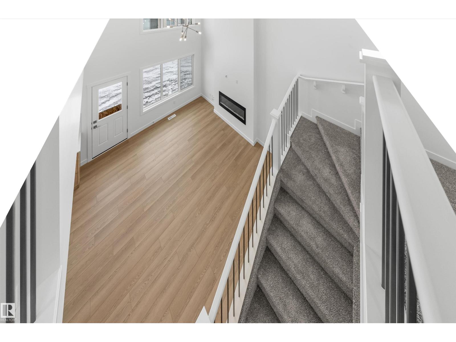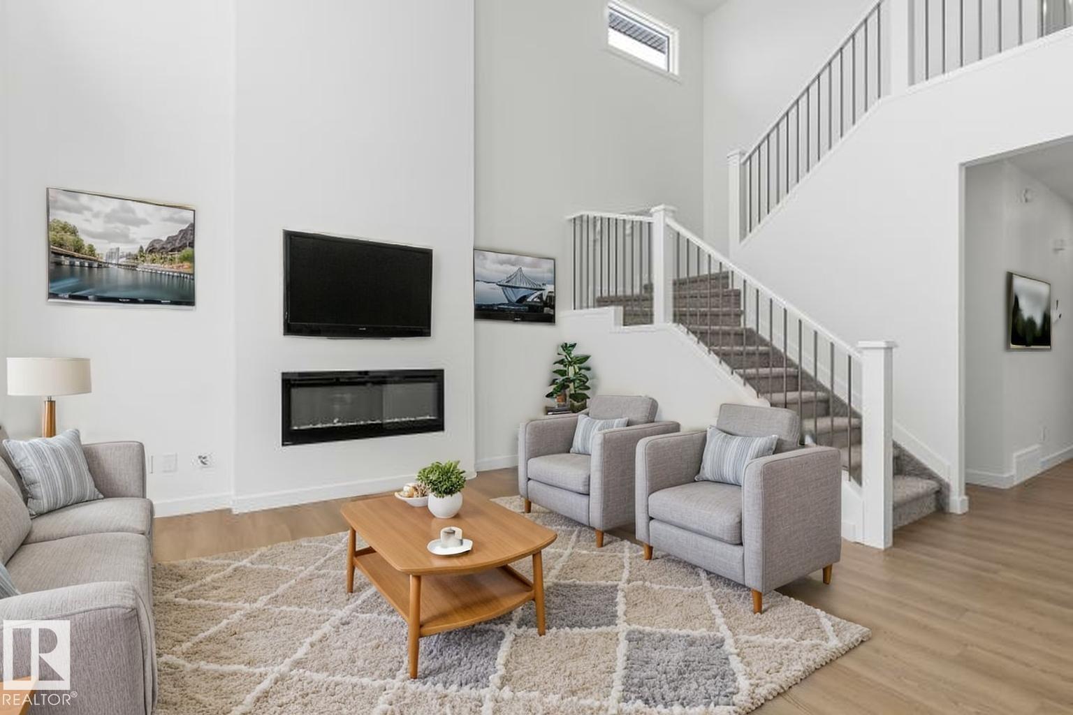 Built by Sterling Homes, this front-attached home in Rivers Edge offers exceptional space, flexibility, and upscale finishes—ideal for large or multi-generational families. Triple pane windows and 9’ ceilings create a bright, open main floor with a front bedroom and full 3-piece bath. The kitchen is paired with a fully equipped spice kitchen and features quartz countertops, a large island, chimney hood fan, built-in microwave, and 48” pantry. The great room showcases a stunning 17-ft open-to-below ceiling, electric fireplace, and oversized backyard-facing windows. Upstairs offers two primary suites with private ensuites, plus a bonus room, upper-floor laundry, full bath with double sinks, and another bedroom. Finished with luxury vinyl plank flooring, upgraded railings, side entrance, garage floor drain, and basement rough-ins for future development. (id:63190)