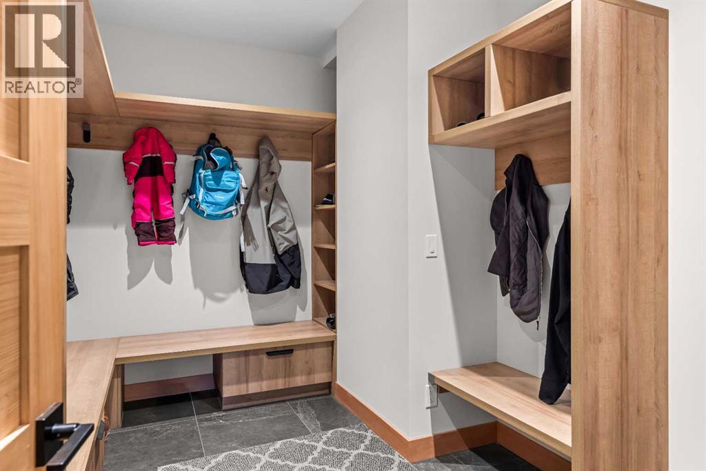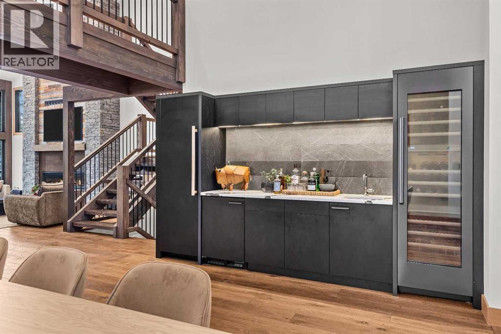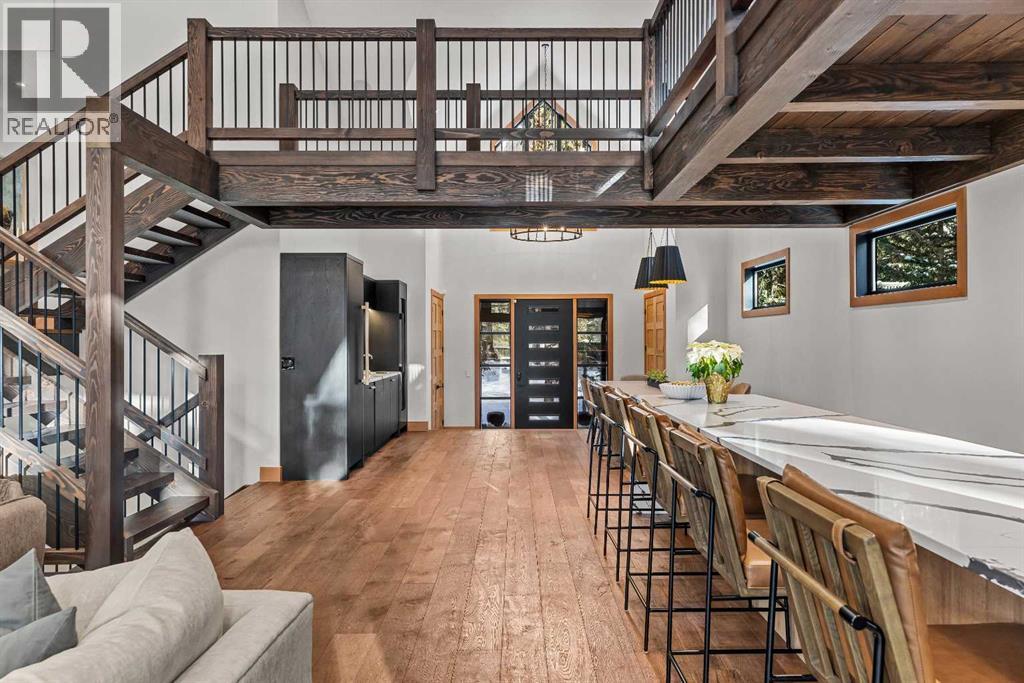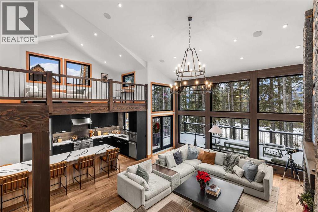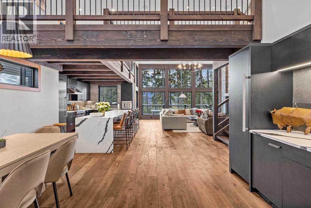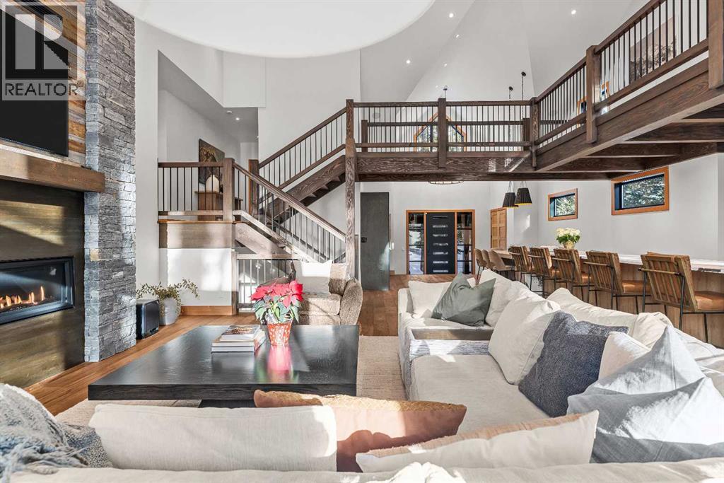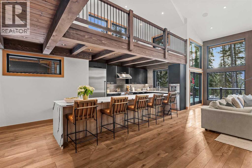 Constructed by Kidner Construction, this exceptional Silvertip near new residence blends refined mountain architecture with modern comfort, backing directly onto the 8th hole of the Silvertip Golf Course. Designed for both entertaining and large gatherings, the home features 5 bedrooms sleeping up to 14 guests, 4 bedrooms with private ensuites and a large bunk room with 2 sets of bunks. At the heart of the home, a dramatic timber-frame loft crowns the living space, creating a striking architectural focal point that complements the surrounding mountain setting.Expansive living areas open seamlessly to the outdoors, where a large main deck, two additional decks, and an expansive patio overlook the golf course and surrounding alpine landscape. Inside, the home is finished with triple-pane windows, Control4 whole-home automation, and carefully designed spaces that balance luxury, comfort, and performance.Additional lifestyle spaces include a family room, dedicated gym, and a fully outfitted garage with epoxy floors, providing both functionality and high-end finishing throughout. Offering just under 4,900 SF the home is thoughtfully distributed across multiple levels to provide excellent separation for family and guests. Located in the prestigious Silvertip community, this Kidner-built home combines exceptional craftsmanship with one of Canmore’s most sought-after golf course settings. Surrounded by world-class golf, mountain scenery, and the natural beauty that defines Silvertip, this property offers elevated mountain living in one of the Bow Valley’s most exclusive neighbourhoods. (id:63190)