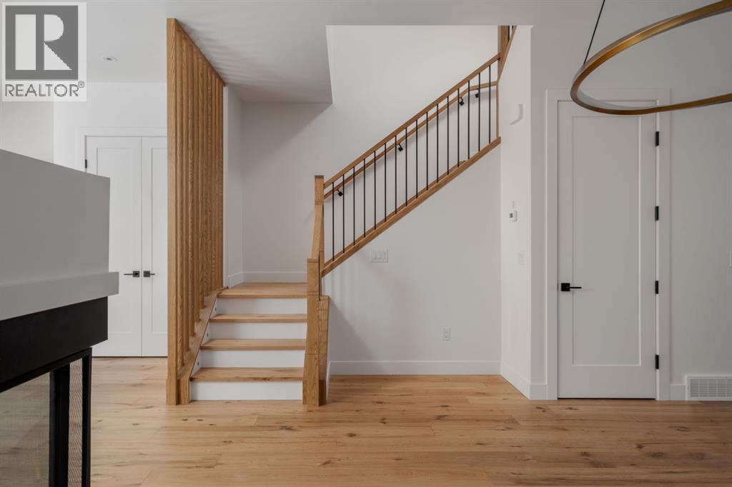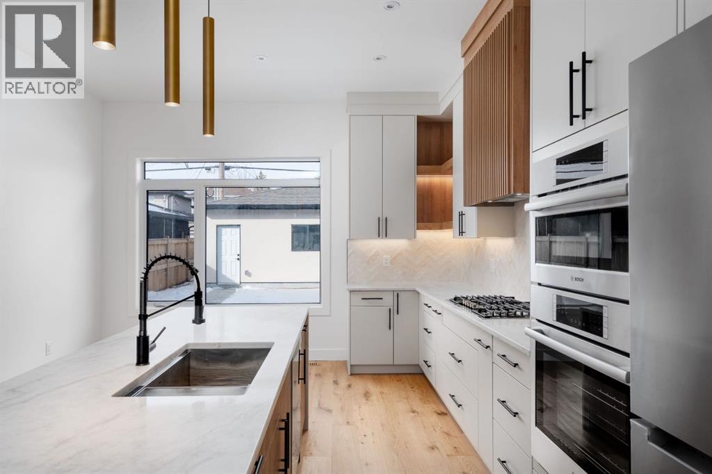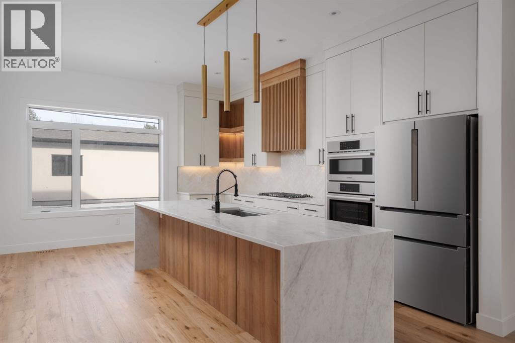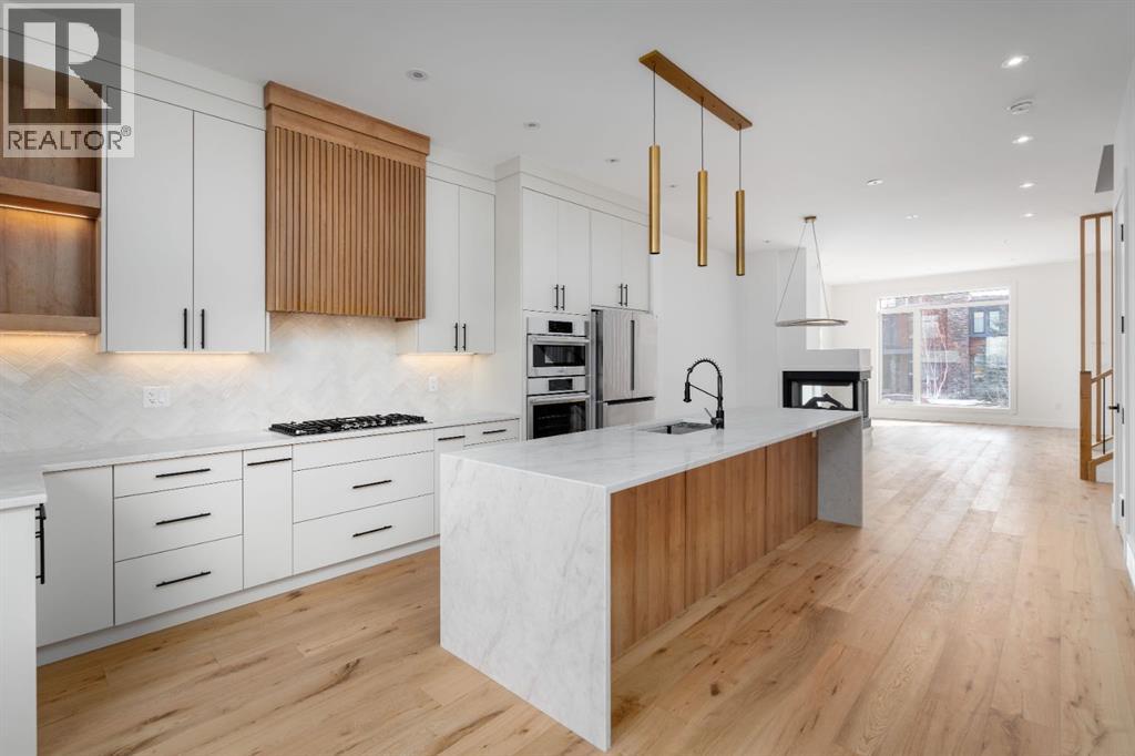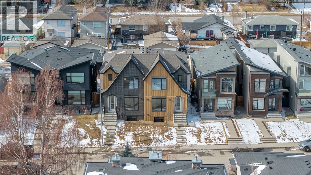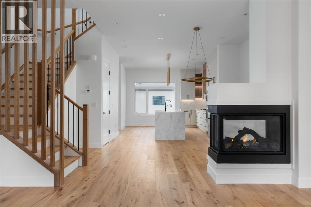 | Open House Saturday April 25th from 2-4pm and Sunday April 26th from 2-5pm | Welcome to The Killarney Collection in SW Calgary—thoughtfully crafted on a quiet street, this fully upgraded duplex infill offers a refined balance of scale, texture, and modern comfort. From the moment you arrive, the home makes a striking first impression with its sleek, contemporary exterior, pairing oversized triple-pane windows for abundant natural light with warm natural tones of true brick detailing and stucco accenting stands out. Inside, 10-foot main floor ceilings create a grand sense of arrival, setting the tone for the interior designer–curated colour palette carried throughout the home. Every detail has been intentionally explored, with the heart of the main floor anchored by a chef-inspired gourmet kitchen. Featuring a premium Bosch appliance package, fully custom-painted cabinetry, and an oversized waterfall granite island, the space effortlessly blends luxury with everyday functionality. A dedicated central dining off the kitchen offers a warm setting for gatherings, while the front living room provides a more intimate retreat, both areas are anchored by the full feature-wall gas fireplace—perfect for evenings spent unwinding. Thoughtful storage solutions are seamlessly integrated, including built-ins at the entry and a fully custom mudroom at the rear, ensuring every inch of space is maximized. Ascending to the upper level, subtle design moments continue to impress, with a full wood feature wall, custom stair lighting, and luxury wide-plank hardwood flooring flowing continuously throughout both the main and upper levels for a seamless transition.The oversized primary bedroom is a true sanctuary, showcasing a vaulted and peaked ceiling design with expansive windows that welcome morning light. The spa-inspired ensuite features a dual vanity, an expansive full-tile shower, and a calming, private retreat. Two additional bedrooms offer generous proportions, each complete w ith custom closet built-ins. The upper-level laundry room maintains the home’s commitment to efficiency and design, offering full cabinetry, a folding counter, side-by-side washer and dryer, and a laundry sink. A versatile work-from-home alcove completes the upper floor, easily functioning as a den or secondary living space.The lower level further extends the home’s flexibility with an oversized 2-bedroom, 1-bath legal suite (900+SQFT), centered around a spacious open kitchen—ideal for rental income, guests, or multi-generational living. A separate full laundry room, understair storage, and built-ins throughout each closet to ensure the same level of thoughtful design continues below.Perfectly positioned close to inner-city Calgary, recreation centres, shopping, and public transit, this Killarney residence offers a timeless blend of form and function—designed to live beautifully today and adapt effortlessly for tomorrow. (id:63190)