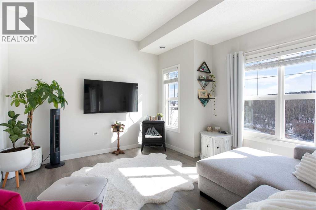 Enjoy breathtaking pond and wetland views from this like-new 2-storey townhome offering over 1,000 sq ft of bright, modern living space. Tucked away at the quiet back of the complex, this beautifully finished home combines peaceful surroundings with convenient access to everyday amenities.Step inside through your private entrance to an open and thoughtfully designed floor plan featuring gorgeous laminate flooring, upgraded lighting, and large windows that fill the home with natural light.The stylish U-shaped kitchen is perfect for entertaining with granite countertops, subway tile backsplash, stainless steel appliances including an upgraded full-size fridge, and an oversized island with flush eating bar. The kitchen flows seamlessly into the spacious dining and living areas, creating a warm and inviting space to gather.Patio doors off the dining area lead to a generous balcony overlooking the serene pond and surrounding wetlands—an ideal place to enjoy morning coffee or evening sunsets.Upstairs offers two spacious bedrooms, including a primary retreat with its own private balcony, plus a full bathroom and convenient upper-floor laundry with a washer and dryer.Additional features include titled parking, dedicated storage, visitor parking, and low condo fees, making this home ideal for low-maintenance living.Located just minutes from local amenities with quick highway access for easy in-and-out of town, this home is perfectly position for both convenience and adventure-only about an hour's drive to Canmore, and within easy reach of Calgary, Ghost Lake, and the breathtaking Rocky Mountains. Move-in ready and beautifully maintained — this one is not to be missed. (id:63190)