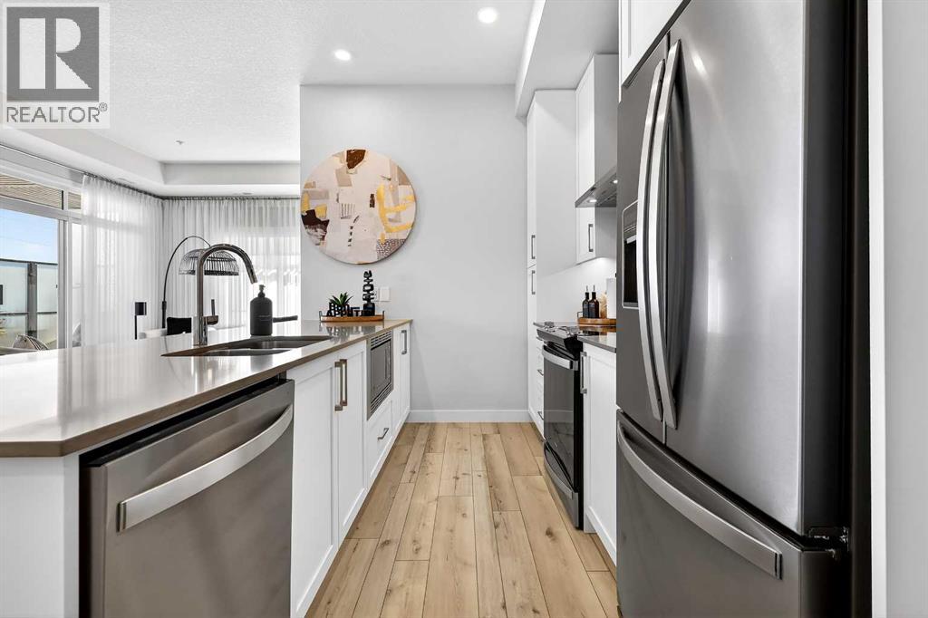 ** OPEN HOUSE EVERY SATURDAY FROM 2-4PM ** Check out this amazing main floor, former showhome, corner unit located in Les Jardins by Jayman BUILT next to Quarry Park! As you step into this highly sought after main floor suite, you will be welcomed by the soaring ceiling heights (almost 10 FEET!), exclusive only to main and top floor units, and the foyer of your dreams with storage and space to hide all jackets and shoes of yours and your guests! As you walk around the corner you are greeted by the beautifully maintained dining room, living space and kitchen. With UPGRADED appliances like the Whirlpool Range, Fridge, Hood Fan and dishwasher, you’ll be sure to enjoy family dinners from the comfort of your new home. Appreciate the ease of the extra-large peninsula for extra dining along side of the designated space for a 6-person dining table. Need more room? Bask in the SOUTH FACING windows in your new living area and enjoy easy access to the 36 ft WIDE, covered, wrap around patio that makes the summer months something to look forward to! Bring yourself back to relaxation by visiting the primary bedroom that includes an ensuite with a stand-up shower and the walk through his and hers closets with sliding doors to keep organizing simple. The secondary bedroom and 4 pc bathroom are perfect for any guests or family member needing a place to stay by offering space and privacy. This amazing unit includes the Washer and Dryer, Central Air Conditioning, high end fixtures and Smart Home Tech (Kasa light switches, Weiser Smart Lock, Ring Floodlight located above the exterior patio door and the Ecobee Smart Thermostat!!) Within the common areas of the building you will find countless amenities that will peak your interest in this fascinating community! With the State-Of-The Art FITNESS CENTRE , Bike Storage room, CCTV cameras, seating areas throughout, a private dog run only for residence, and last but not least, the 2 ACRE PARK inspired by the Gardens of France, you will step into this community and IMMEDITALY feel at home! Neighboring both Quarry park and Douglas Glen, there is an endless array of shopping, restaurants, schools, daycares as well as bikes paths and walking trails to Calgary's very own Bow River and Fish Creek Provincial Park to help feed any outdoor cravings you may have. If there is anything out of reach from the community, fear not, you have access to both Deerfoot Trail and Glenmore trail within a 5 min drive - making your commute downtown only 20 minutes! Enjoy the condo life in luxury, book a showing! (id:63190)