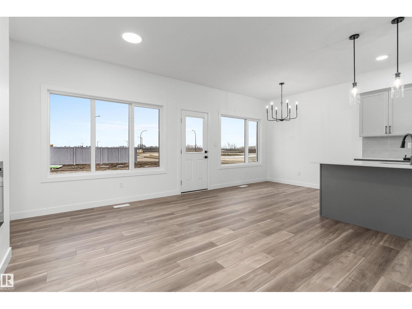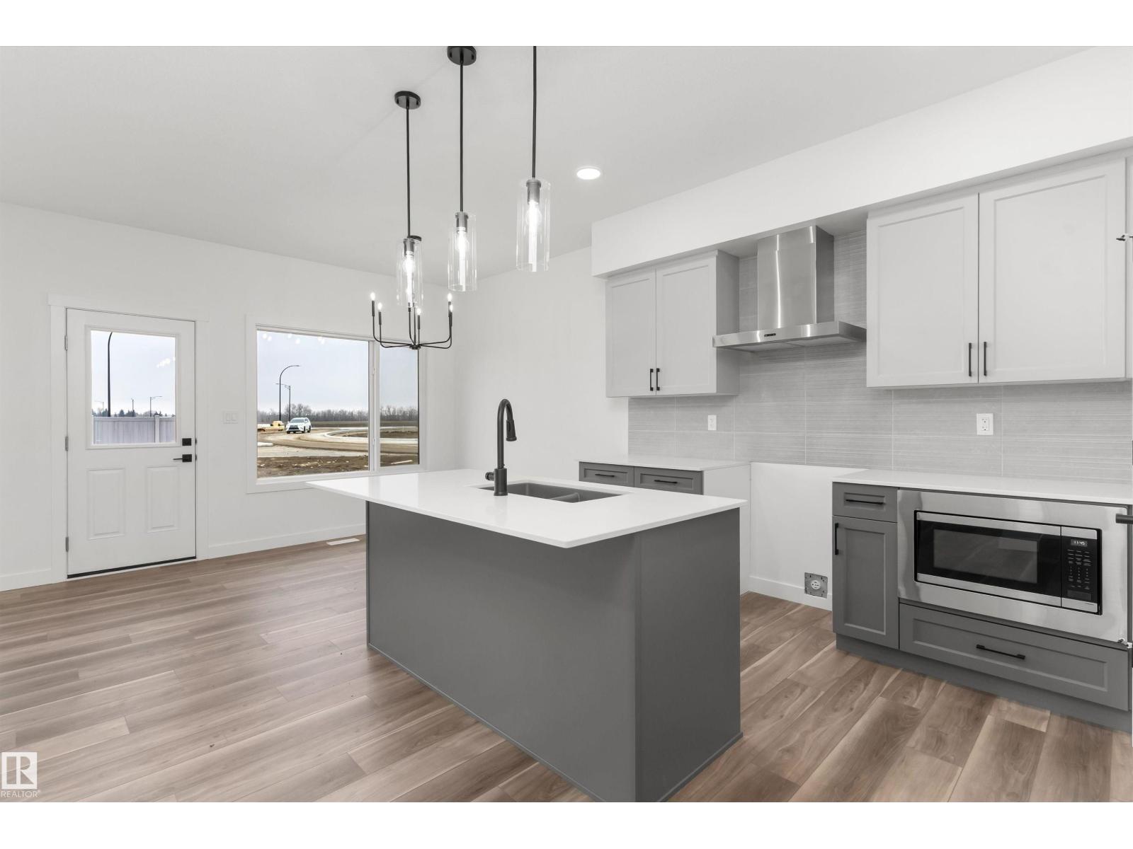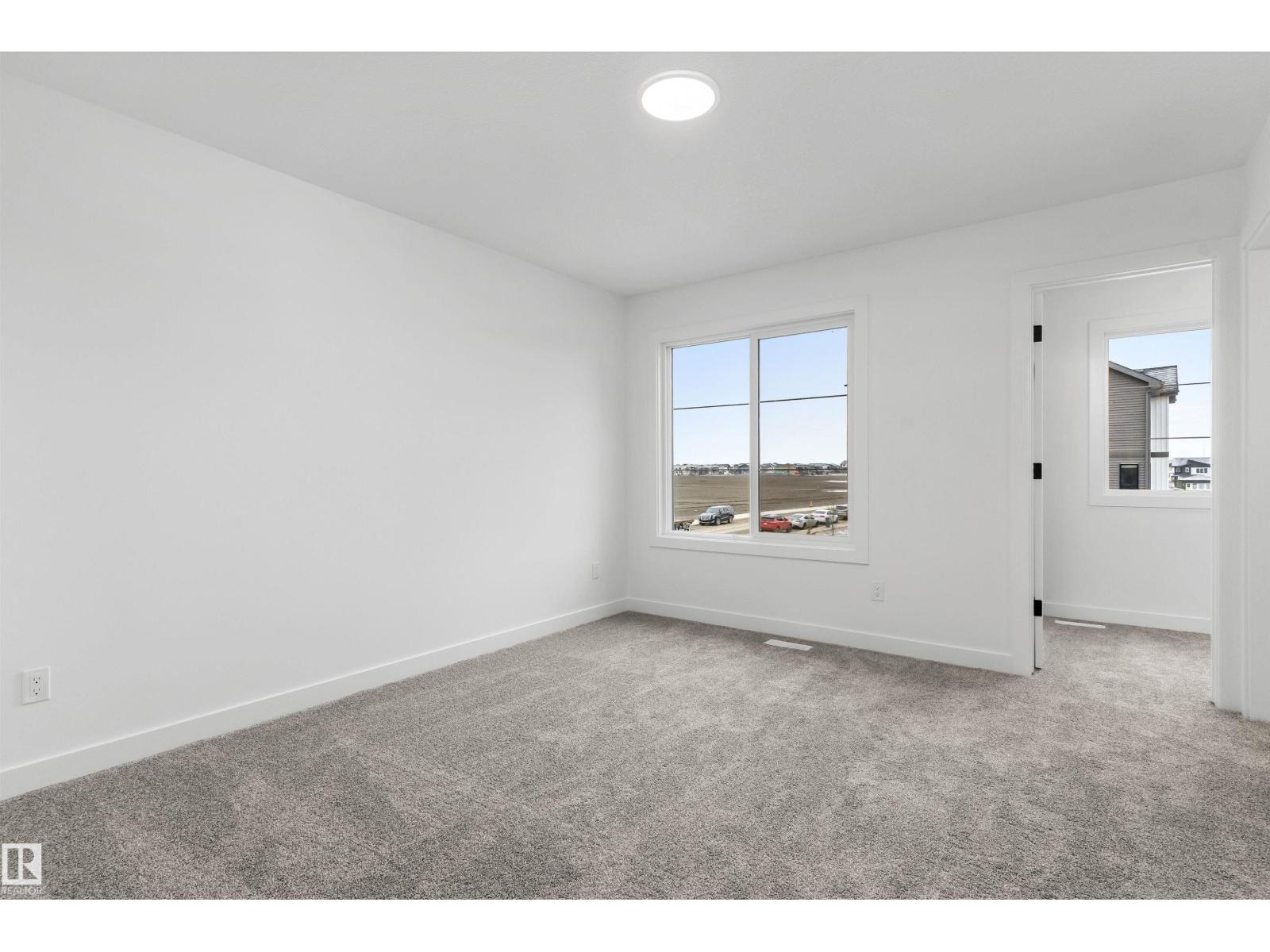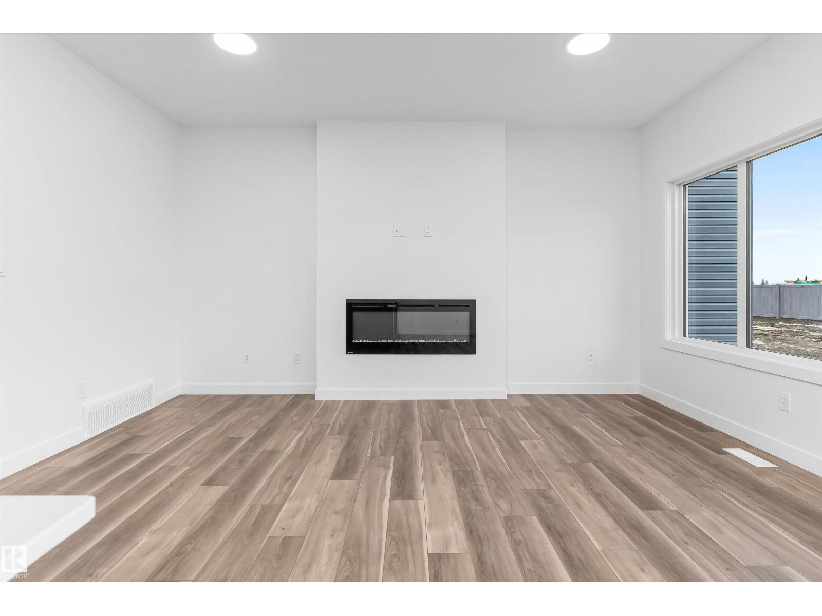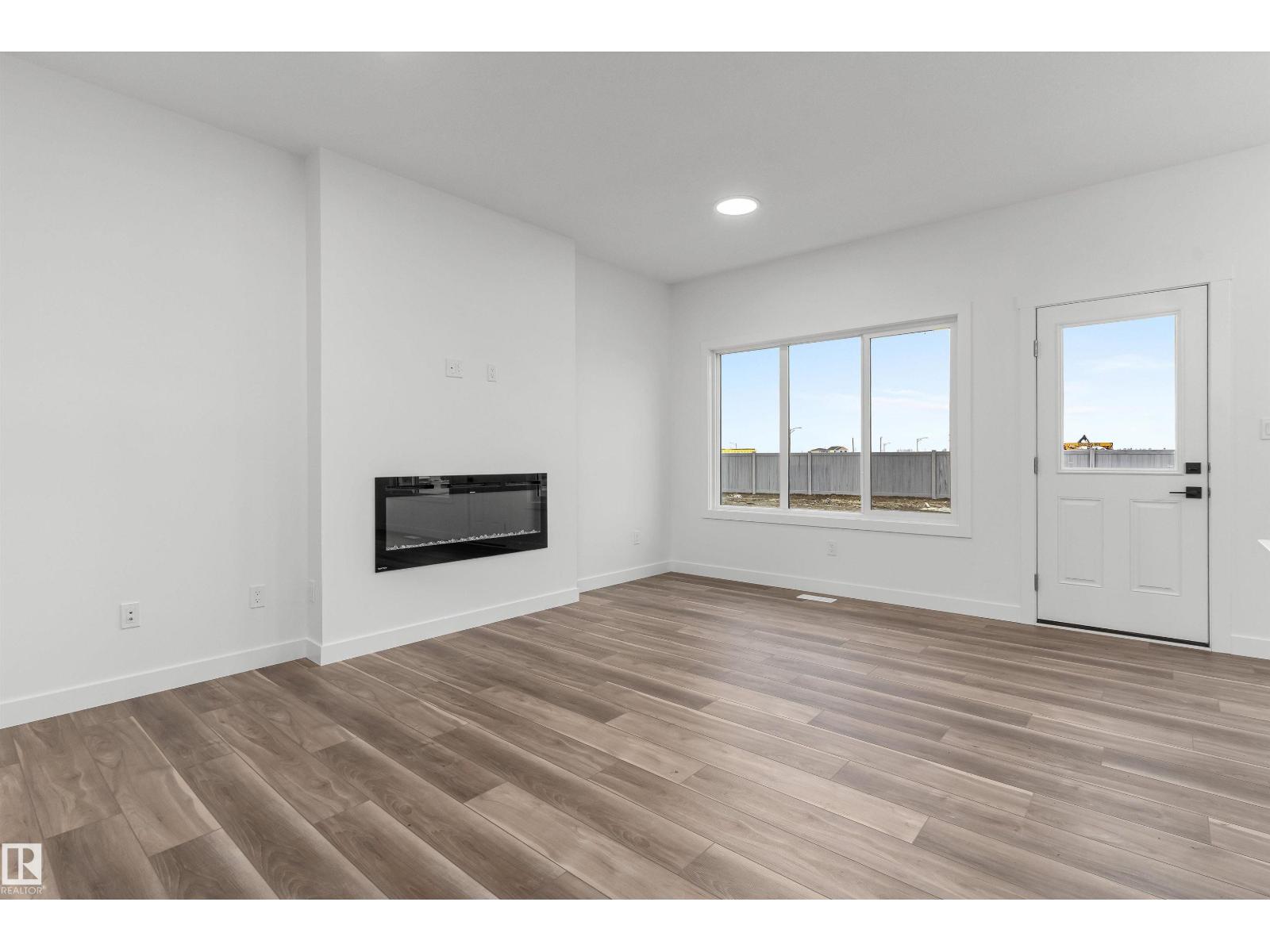 Built by Sterling Homes, this front-attached home in Rivers Edge offers bright, modern living in a nature-inspired west Edmonton community. Triple pane windows and 9’ ceilings create an airy main floor that features a welcoming foyer and an open kitchen with quartz counters, a large island, built-in microwave, chimney hood fan, full-height backsplash, and a corner pantry. The great room includes an electric fireplace and large rear windows, with a garden door leading to the backyard. A half bath completes the main level. Upstairs, the primary suite offers a walk-in closet with a window and a 4-piece ensuite with double sinks and a glass-door shower. A bonus room, full bath, upper-floor laundry, and two additional bedrooms complete the layout. With luxury vinyl plank flooring, upgraded railings, a separate side entrance, a double garage with floor drain, and basement rough-ins, this home blends comfort and convenience in a growing riverside neighbourhood. (id:63190)