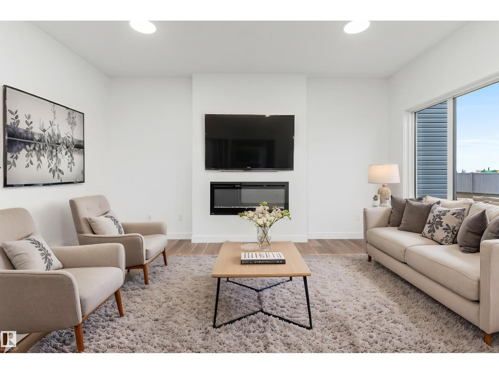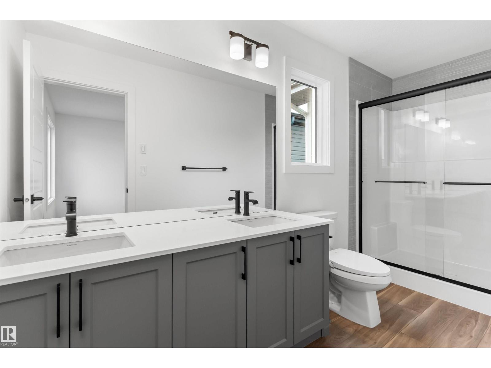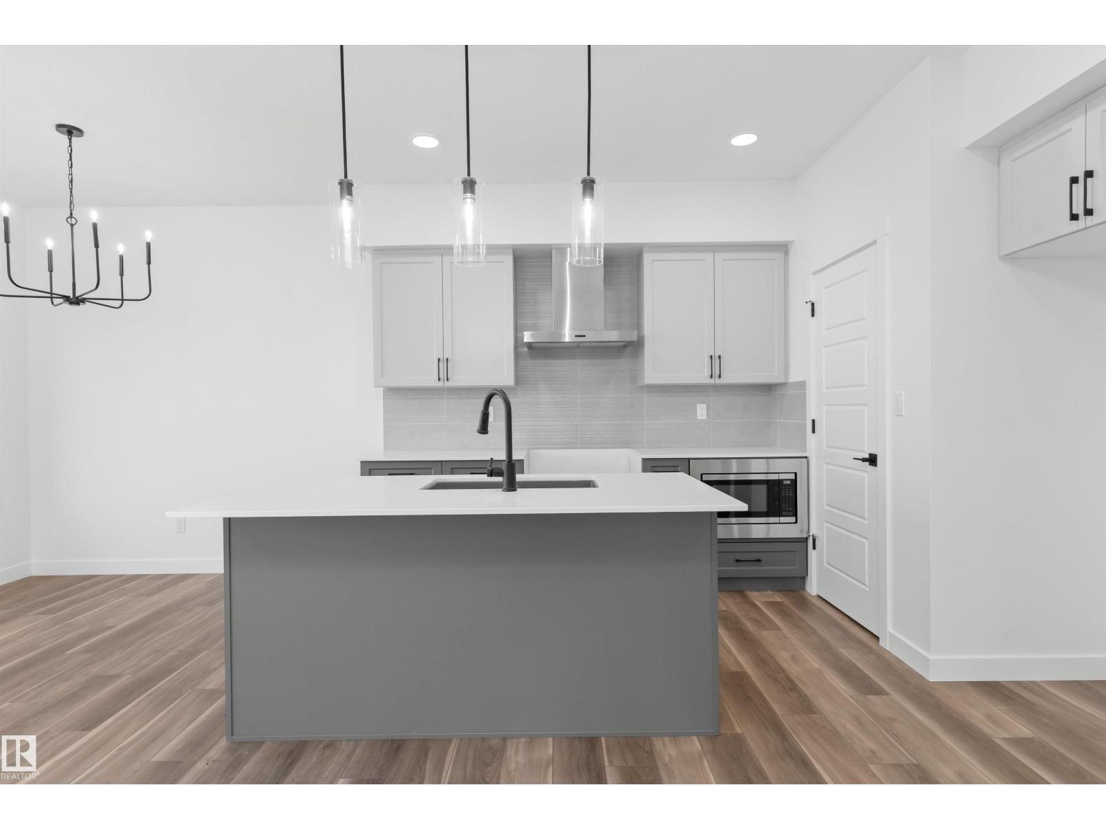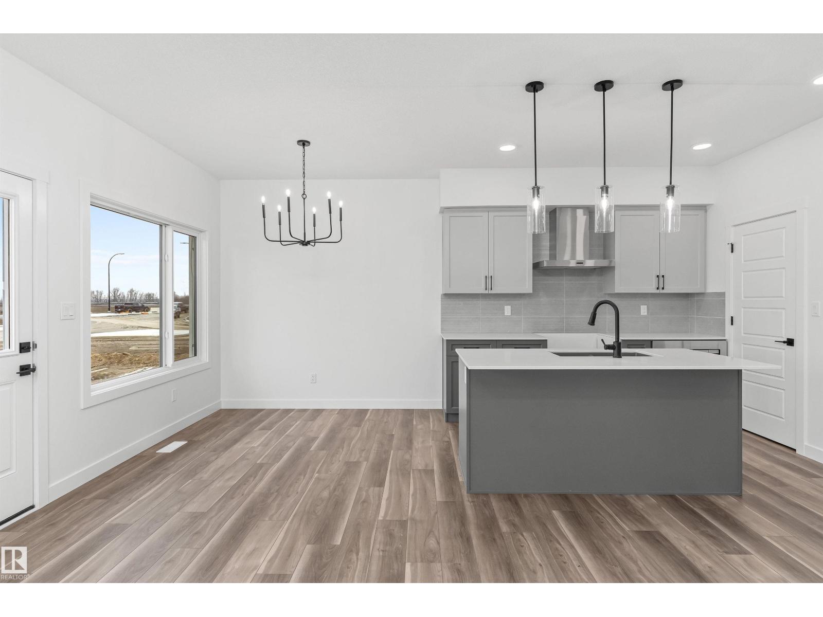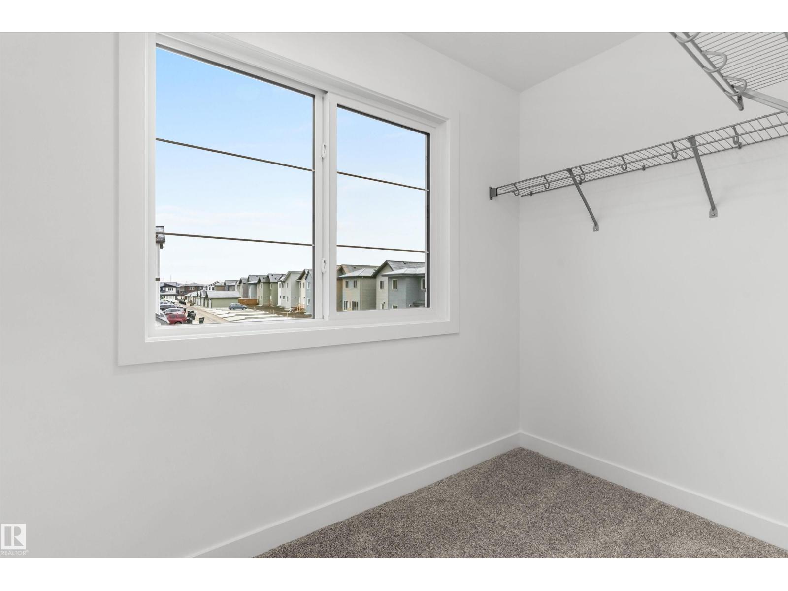 Built by Sterling Homes, this front-attached home in Rivers Edge offers bright, modern living in a nature-inspired west Edmonton community. Triple pane windows and 9’ ceilings create an airy main floor that features a welcoming foyer and an open kitchen with quartz counters, a large island, built-in microwave, chimney hood fan, full-height backsplash, and a corner pantry. The great room includes an electric fireplace and large rear windows, with a garden door leading to the backyard. A half bath completes the main level. Upstairs, the primary suite offers a walk-in closet with a window and a 4-piece ensuite with double sinks and a glass-door shower. A bonus room, full bath, upper-floor laundry, and two additional bedrooms complete the layout. With luxury vinyl plank flooring, upgraded railings, a separate side entrance, a double garage with floor drain, and basement rough-ins, this home blends comfort and convenience in a growing riverside neighbourhood. (id:63190)
