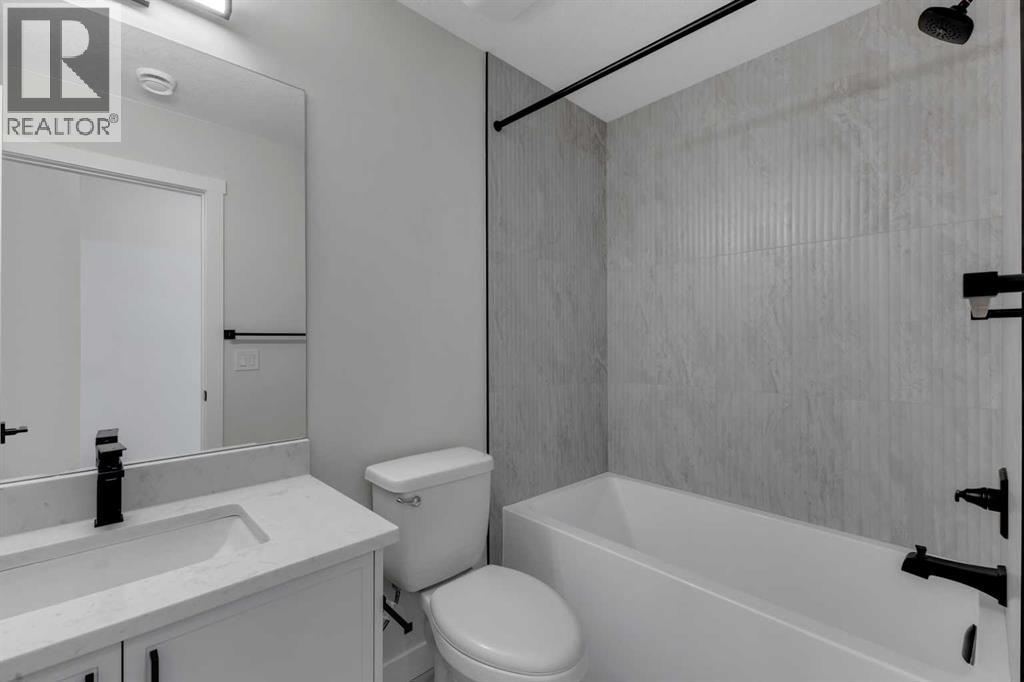 Welcome to THE SEVEN, an exclusive collection of seven luxury residences in the heart of Glenbrook, one of Calgary’s most sought-after inner-city communities. The opposite side of this semi-detached residence is also available, offering an alternate lighter designer finish palette. This particular home is a three-storey semi-detached residence (half duplex) offering 4 bedrooms and 4.5 bathrooms, including 3 private ensuites, thoughtfully designed for elevated urban living just minutes from downtown.Step inside to a spacious main floor where a generous living room welcomes you with striking dark flooring flowing throughout and a beautifully tiled fireplace that creates a warm, inviting focal point. The designer kitchen is built for both everyday living and entertaining, featuring a large statement island, built-in oven and microwave, gas cooktop, and a pantry for seamless storage. The dining area provides the perfect setting for hosting dinner parties or relaxed family meals, while the stylish powder room delivers a boutique-hotel inspired feel for guests. A functional mudroom is tucked away at the rear, offering a separate entrance to the backyard and detached garage.The second level features two spacious bedrooms, each complete with its own private ensuites providing comfort and privacy for family or guests. A dedicated laundry room with additional cabinetry adds everyday convenience.Occupying the entire third floor, the grand primary retreat is a true sanctuary. Enjoy vaulted ceilings, elegant wall sconces, and a statement chandelier above the bed, along with direct access to a private balcony—perfect for morning coffee or evening relaxation. The spa-inspired ensuite features a dual vanity, stunning tile work, and a glass-enclosed shower, while the walk-in closet is finished with custom shelving and built-in cabinetry.The fully developed basement expands the living space with a large recreation room, a stylish wet bar with under-cabinet lighting, an additi onal bedroom, and a full bathroom—ideal for guests, entertaining, or movie nights.Outside, the home’s exterior showcases a modern stucco façade accented with warm Hardie board details, creating striking curb appeal. Residents also enjoy a shared landscaped green space and access to the detached garage.Located in the vibrant community of Glenbrook, you’re just minutes from downtown Calgary while enjoying the charm of established inner-city living, with nearby parks, schools, restaurants, and everyday amenities all within easy reach.Experience sophisticated design, modern comfort, and urban convenience at THE SEVEN. Power lines digitally removed from exterior images for presentation purposes. (id:63190)