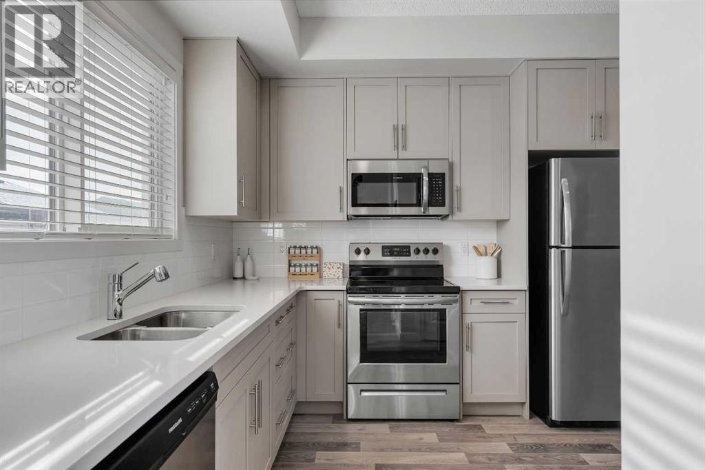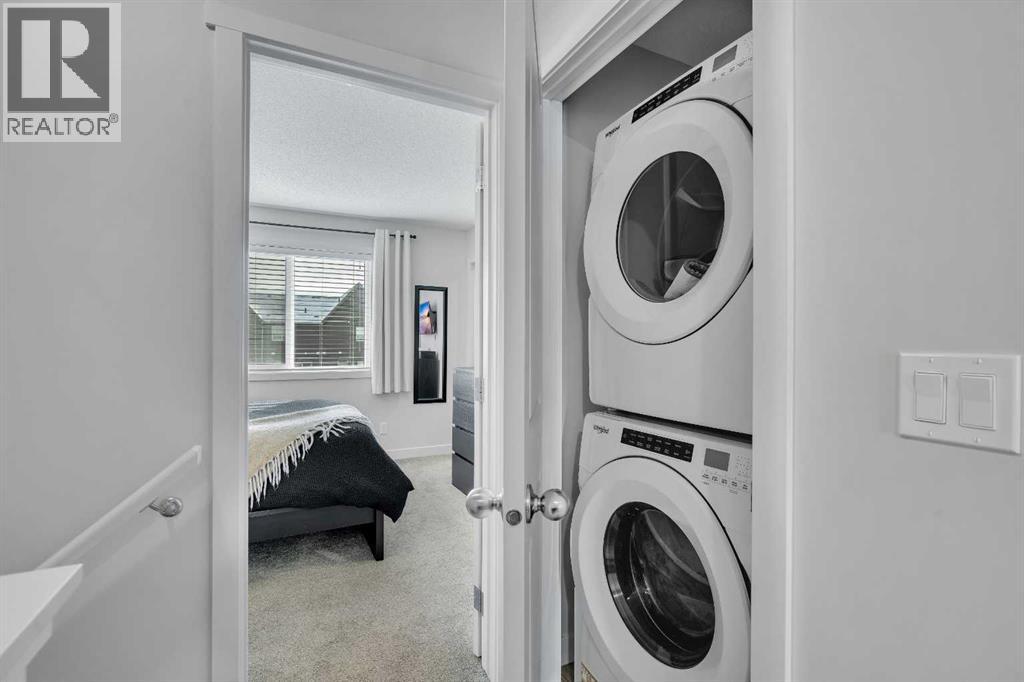 NO CONDO FEES and MOVE-IN READY, this 2021-built 3-bedroom, 2.5-bath townhome in Carrington offers 1,224 sq.ft. above grade, a professionally finished basement, private fenced yard, and private parking for 2 vehicles. With east–west exposure, the home is filled with natural light throughout the day, and the open-concept main floor features quartz countertops carried throughout the home, stainless steel appliances, high ceilings, and a functional layout designed for everyday living and entertaining.Upstairs you’ll find three bedrooms, including a primary suite with walk-in closet and private 3-piece ensuite, along with a full 4-piece bathroom. The finished basement adds valuable additional living space ideal for a second living room, home office, gym, or media room, while still offering a large storage and utility area.Outside, the low-maintenance private backyard includes a gas BBQ line and opens to the rear parking area with wiring rough-in for a future garage if desired. Located on a quiet street steps from Carrington’s pathway network, parks, and green space, with quick access to Stoney Trail and nearby shopping and amenities, this home offers a great combination of space, flexibility, and long-term value without condo fees. (id:63190)