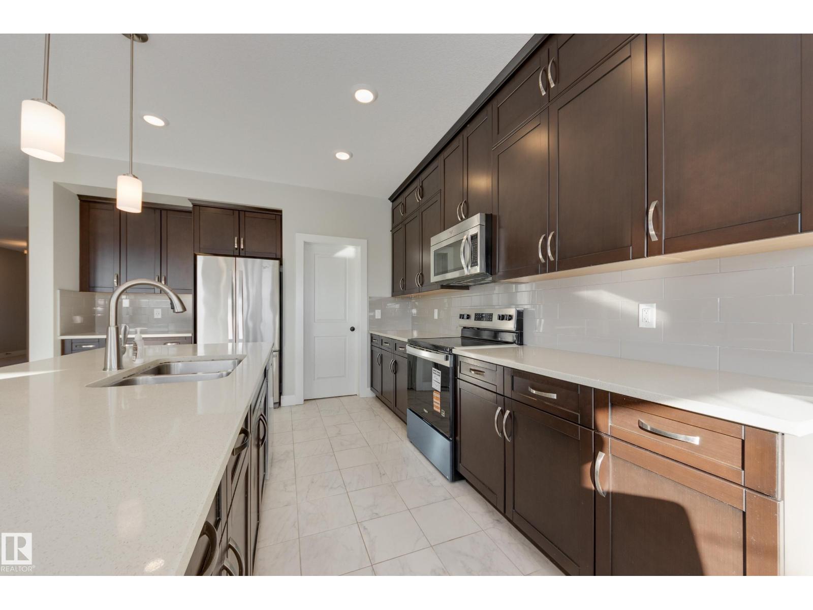 Stunning 5 bed, 3.5 bath home backing onto RCAF Playground Park. The open concept main floor offers connection and comfort with uninterrupted park views. Enjoy morning coffee and sunrises or warm summer evenings on the deck. Gourmet island kitchen has lots of cabinets and is adorned with quartz countertops, stainless appliances and a walk through pantry with laundry space. Curl up in front of the gas fireplace on cool evenings or entertain family and friends in the generous dining room. The primary retreat impresses with a spa inspired 5 piece ensuite including a tub, glass shower, dual vanities, water closet, and a huge walk in closet. You’ll also find 3 additional spacious bedrooms, a bright versatile bonus room and a 4 piece bath on this floor. On the lower you’ll find a 5th bedroom, 4 piece bath and a bright open rec area ideal for movie nights, play space or a home gym. Dble. oversized insulated garage offers more storage and parking. Griesbach, a community known for its parks, walkability, and charm (id:63190)