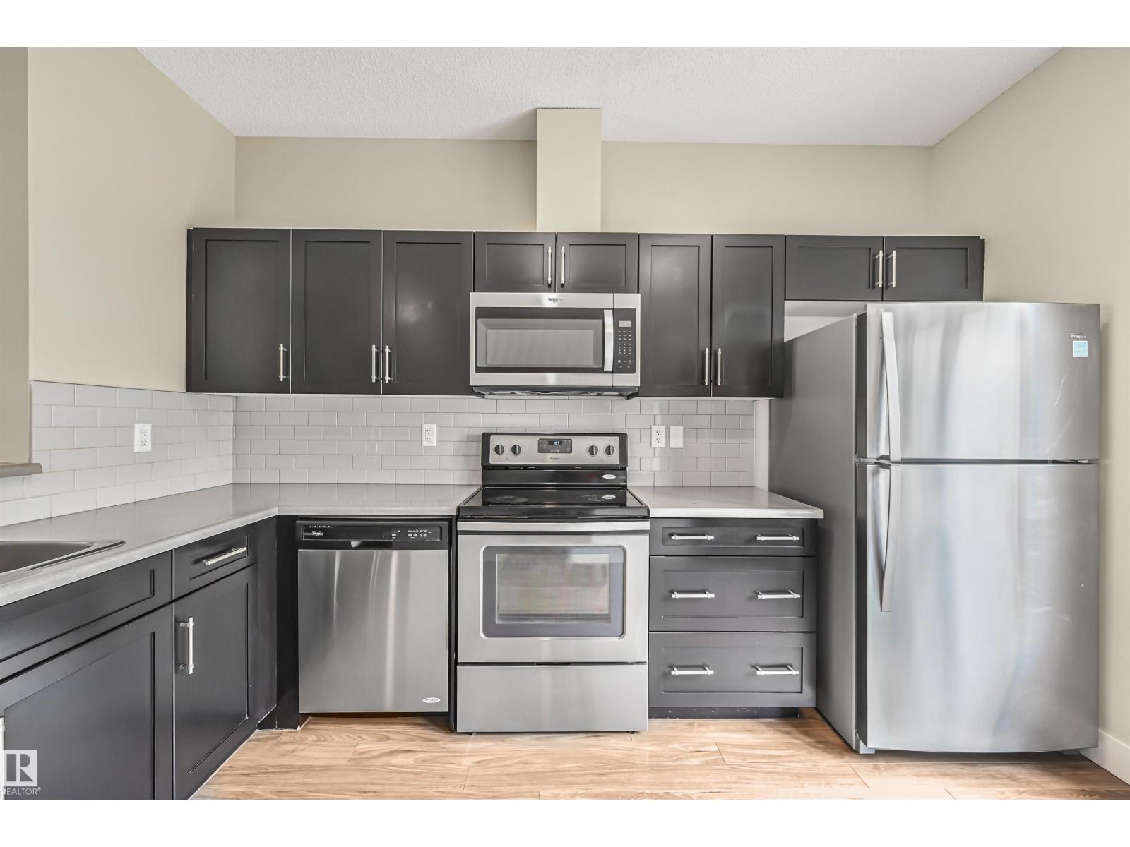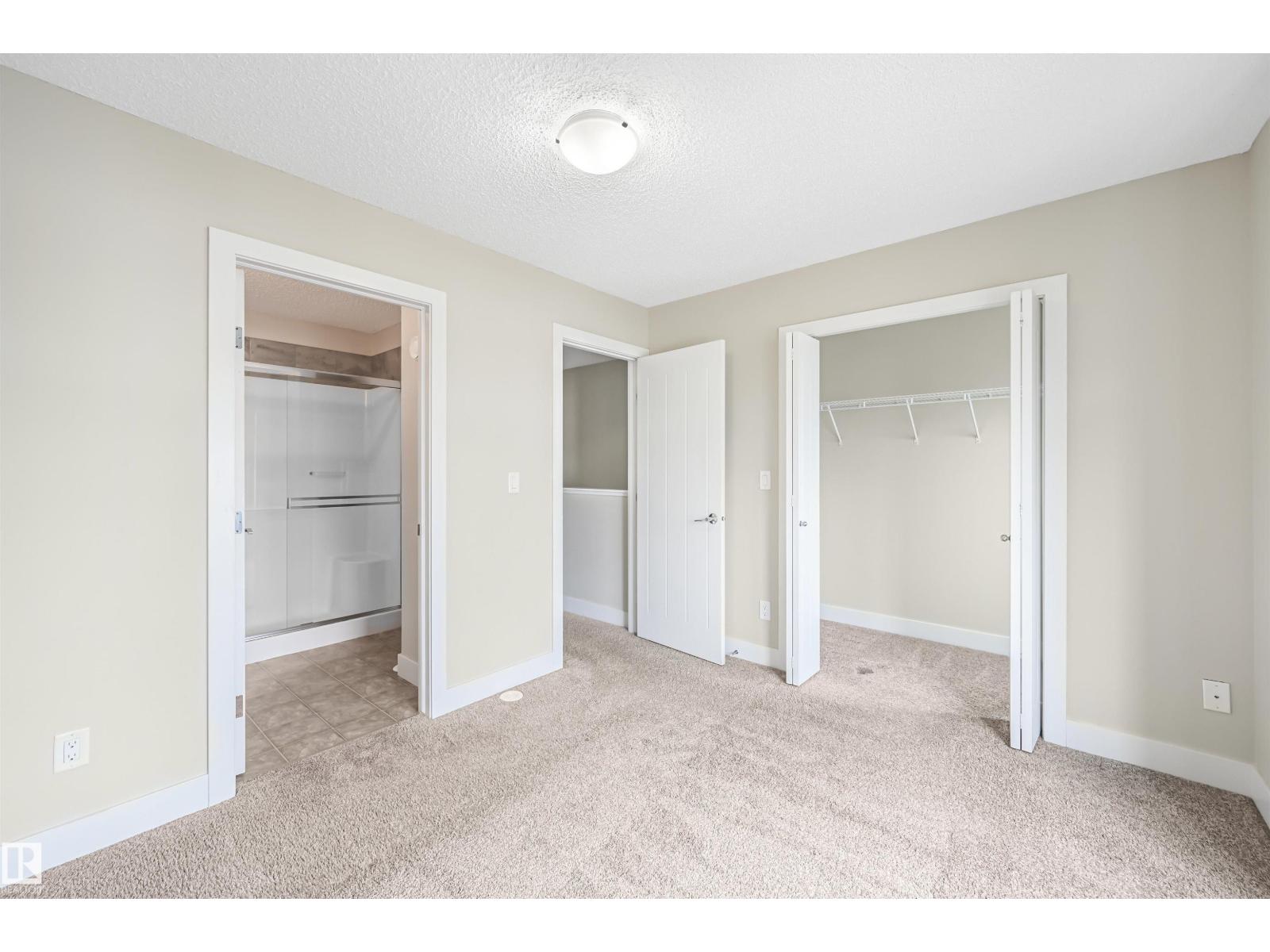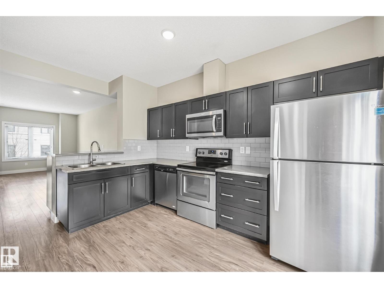 Welcome to this well-maintained spacious 2 bedroom/2.5 bath townhome in the desirable Walker. Main floor boasts a roomy open concept layout, 9' ceilings & quality finishings. The functional chef's kitchen includes S/S appliances, walk-in pantry & eating bar. Living room features an attached balcony to enjoy the fresh air & green space. The main level is equipped with a half bath & vinyl flooring. On the upper level, you'll find two well-sized bedrooms. Primary bedroom has 3pc ensuite & walk in closet. A second full bathroom and laundry closet complete the upper level. Flex room on ground level is perfect for a home office space or extra storage. Other features include a single attached garage and energy-efficient mechanical including tankless hot water for a lower utility bill. This well maintained complex offers visitor parking & is conveniently located close to shopping, walking trails & lake. Quick proximity to Anthony Henday, South Common, schools & public transportation. A must see! (id:63190)