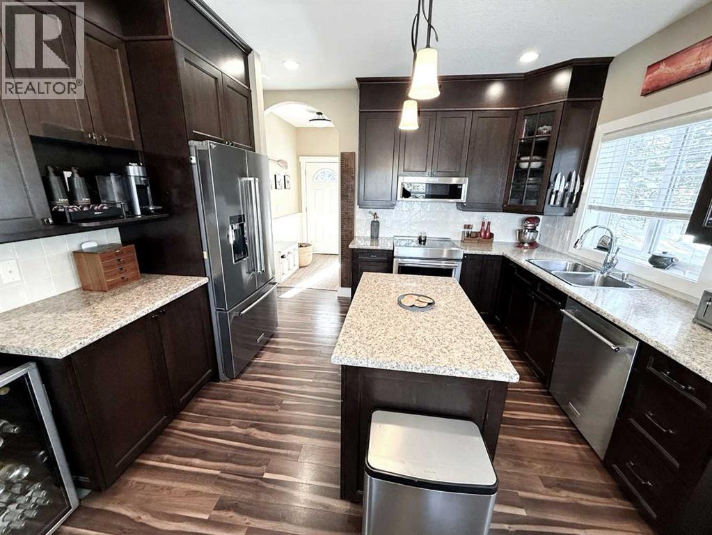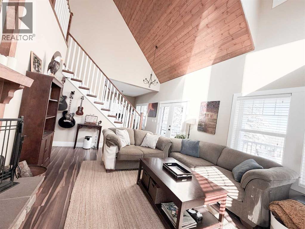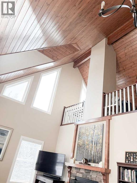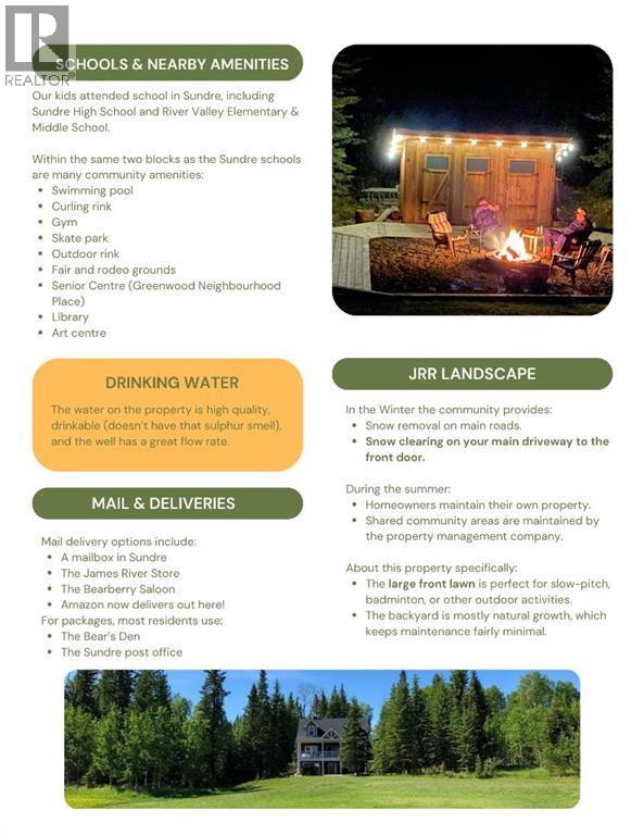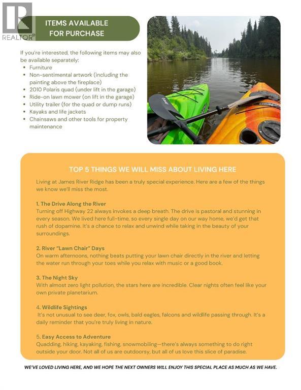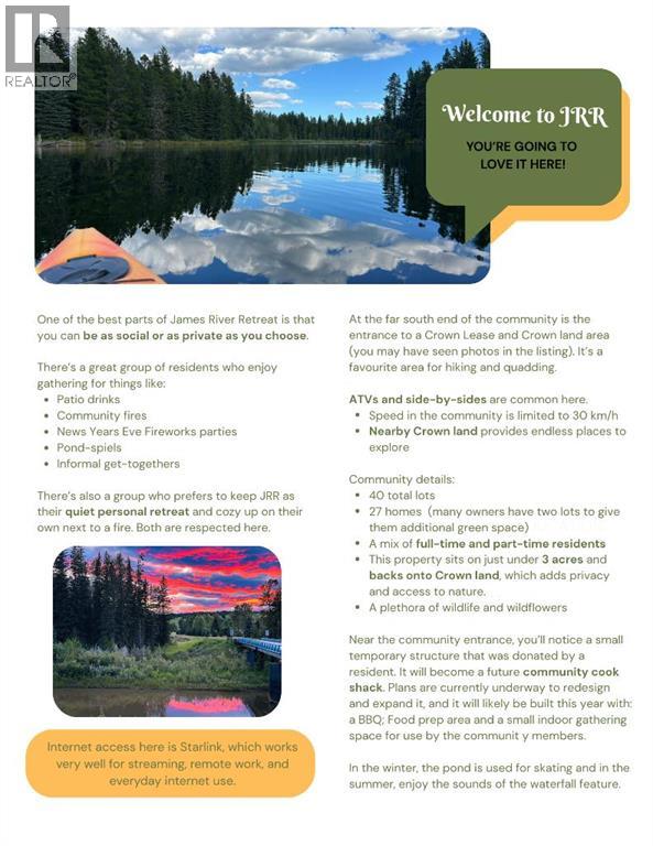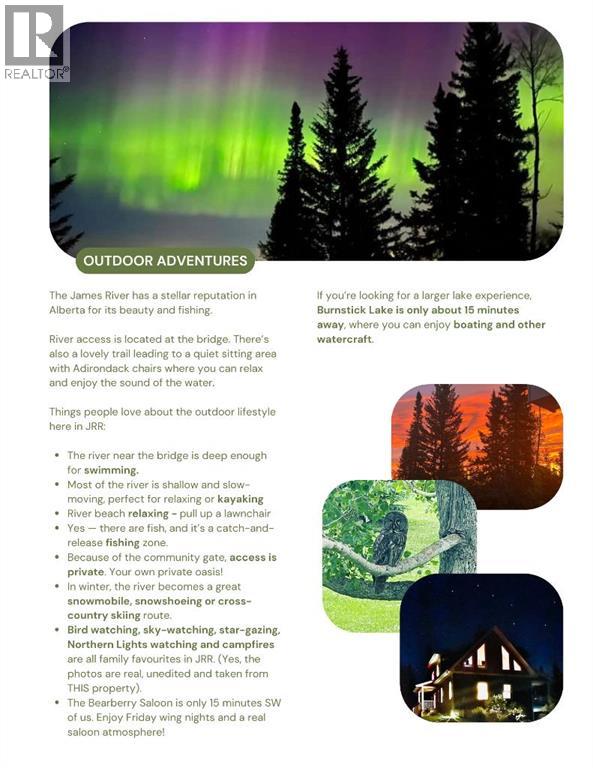 Custom-built mountain ACREAGE home, offering over 2,400 sq ft of living space in the exclusive gated community of James River Retreat, surrounded by forest and ENDLESS OUTDOOR ADVENTURE or cozy nights by the fireplace. Located just 25 minutes northwest of Sundre and about 1.5 hours from Calgary, this beautifully maintained property offers privacy, comfort, and year-round recreation in one of Alberta’s MOST UNIQUE PRIVATE COMMUNITIES. Inside, dramatic vaulted ceilings and expansive windows fill the open living space with natural light while showcasing peaceful forest views. The bright kitchen features a stainless steel induction KitchenAid induction stove and appliances (still under warranty) and flows seamlessly into the dining and living areas, creating a warm and inviting space for gathering with family and friends. Step outside onto the large covered front deck with a natural gas BBQ hookup, perfect for outdoor cooking, entertaining and relaxing while taking in the valley and surrounding trees. The main level includes a spacious primary bedroom, full bathroom, and laundry, allowing CONVENIENT SINGLE-LEVEL LIVING. Upstairs, a stunning open loft overlooking the living room leads to two additional bedrooms and another full bathroom. The lower level offers a LARGE GUEST ROOM and full bath, while the attached garage has been converted into a VERSATILE REC ROOM, currently used as a gym, hobby room, and home theatre. Comfort is exceptional year-round with in-floor heating throughout the home and a heat recovery ventilation system. Outside, enjoy your private, FORESTED 2.6 ACRES and a private backyard fire-pit area surrounded by trees, complete with two custom-built woodsheds. The property also features a detached (natural gas heated) garage with a CUSTOM ELECTRIC LIFT designed for working on or storing a quad and mower, along with extensive space-saving shelving and storage. High-speed Starlink internet makes working remotely easy, making this property ideal as a FULL-T IME FAMILY HOME, WEEKEND GETAWAY or RETIREMENT OASIS. Living in James River Retreat offers PRIVATE ACCESS to the James River for kayaking, fishing, and swimming, a COMMUNITY POND for skating in winter, and shared amenities including a cook shack, gathering tables, and horseshoe pits perfect for private gatherings and events. Conveniently located 20 minutes from BURNTSTICK LAKE and just 15 minutes to the BEARBERRY SALOON, this remarkable property offers the perfect balance of seclusion and accessibility. A school bus stop at the top of the hill also makes it practical for full-time family living. (id:63190)