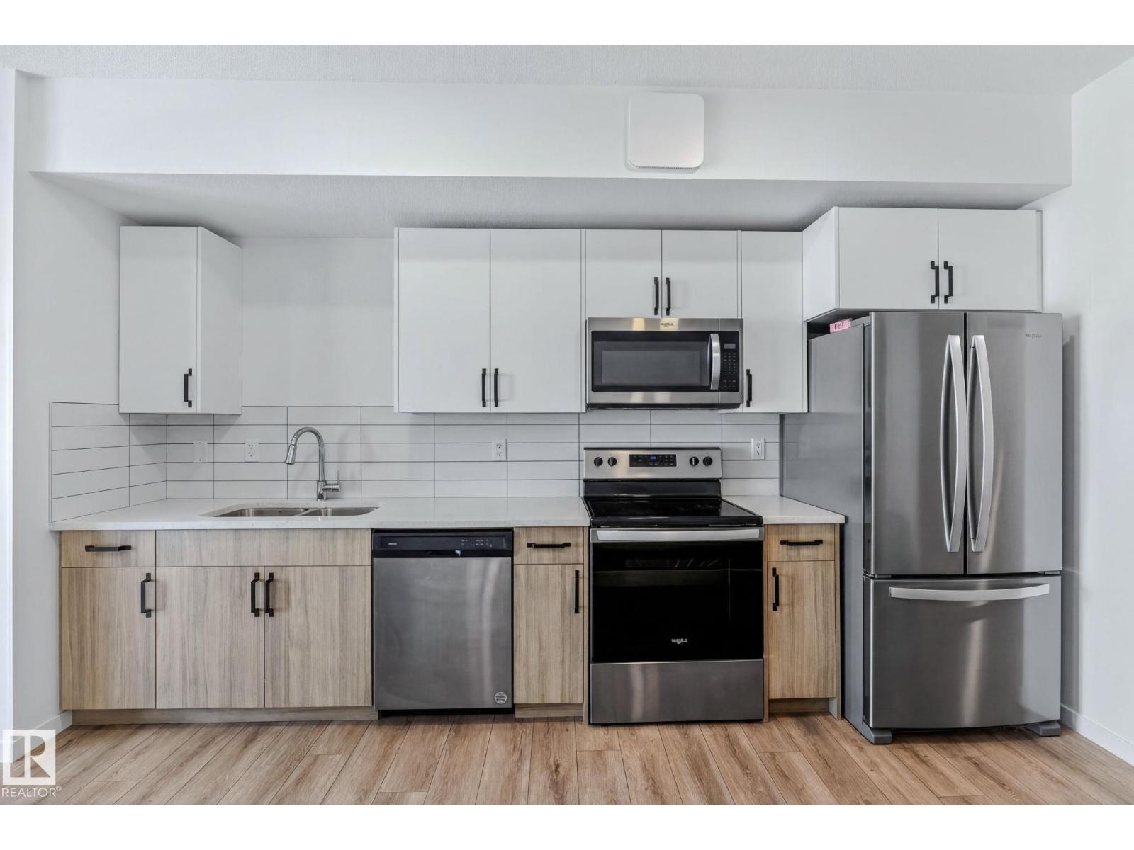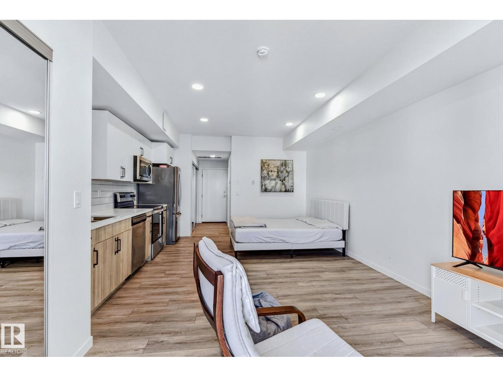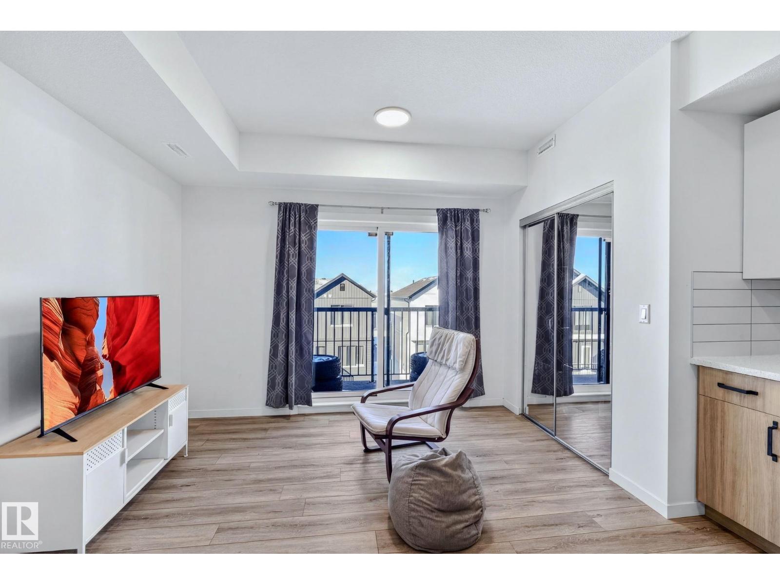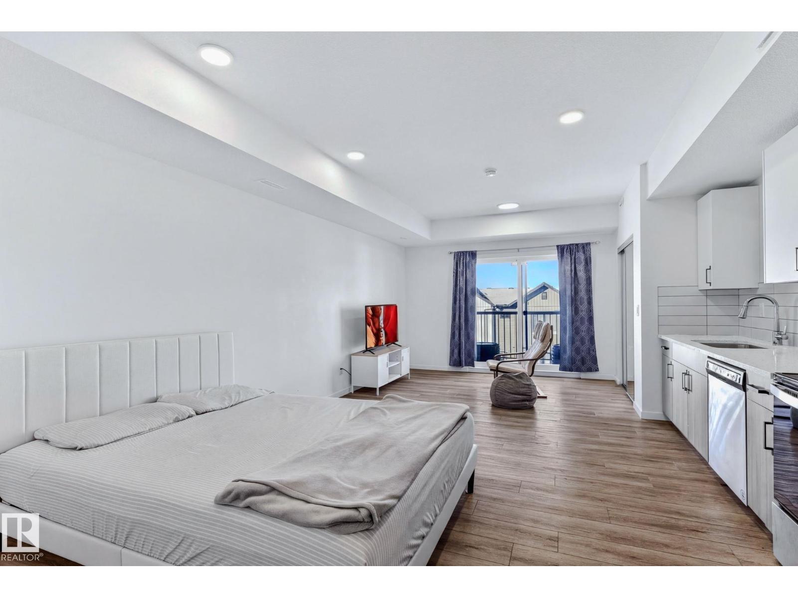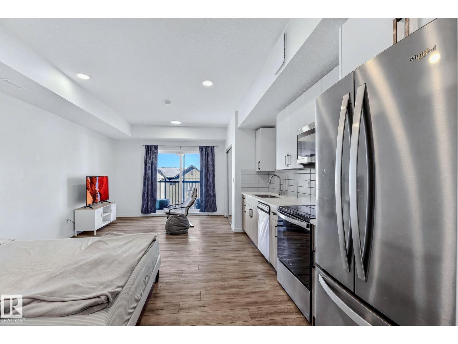 Welcome to effortless urban living in this top-floor studio apartment. At 463 sf, this thoughtfully designed space maximizes every square foot with sleek vinyl plank flooring throughout, modern two-tone cabinetry, gleaming quartz countertops, and stainless steel appliances. What sets this unit apart? Your own furnace and hot water tank—giving you full control over your utilities and peace of mind with independent systems. The suite comes complete with in-suite washer & dryer, plus a west-facing balcony perfect for enjoying evening sunsets.Location is everything. You're steps from future rec center, grocery stores, restaurants, & everyday amenities, with quick access to public transit, Anthony Henday, and Whitemud Drive—making any commute across the city seamless. Whether you're a first-time buyer ready to stop renting and start building equity, or an investor seeking a low-maintenance addition to your portfolio, this condo delivers comfort, convenience, and long-term value. Your next chapter starts here. (id:63190)