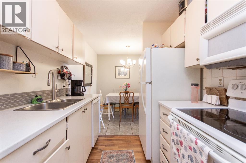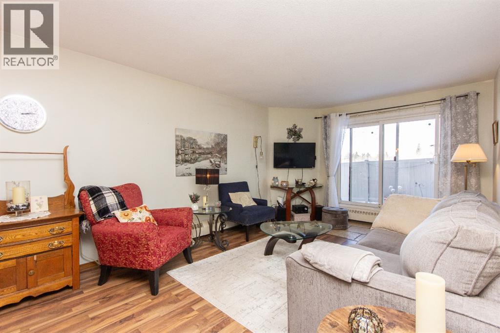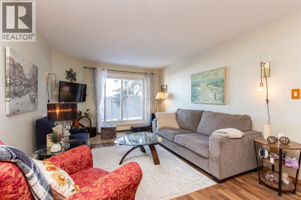 Situated in beautiful Clearview Meadows, this well kept 2 bedroom, 1 bathroom corner unit condo is just steps away from parks, playgrounds, scenic walking paths, and all the convenient shopping amenities of Clearview Market. Stepping inside this ground floor unit, the kitchen is located just off the entryway and offers a compact and functional layout with plenty of cabinetry and matching white appliances. The adjoining dining space easily fits a full sized table and flows seamlessly into the bright, and generously sized living room which features low maintenance laminate flooring. Large patio doors bring in plenty of natural light and provide direct access to your private ground level patio with no neighbours beside you for added privacy. Two comfortably sized bedrooms including a spacious primary are complemented by an updated 4 pce bathroom. There is also in-suite laundry and storage for added convenience. Condo fees are $478.75/month and include heat, water, sewer, trash, professional management, parking, insurance, and snow removal, making for simple and low maintenance ownership. Bylaws allow for 1 pet per unit, no more than 14" at the shoulder and board approval is required. This unit comes with one assigned parking stall, and additional parking stalls can be rented for $35/mo. The building has also seen a number of important updates over time including roof replacement, updated siding, a redone parking lot, vinyl fencing, and new patio doors. This clean and affordable unit is a great opportunity for first time buyers, downsizers, or investors on Red Deer's desirable SE side! (id:63190)