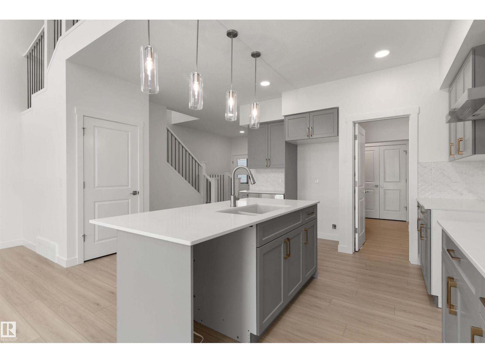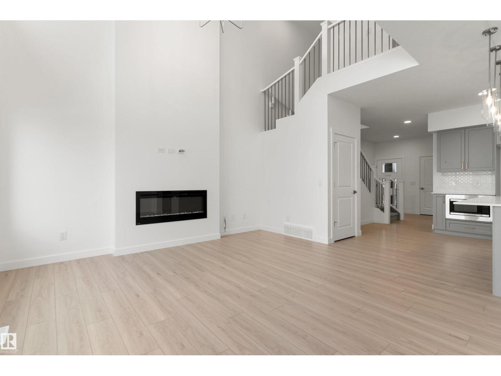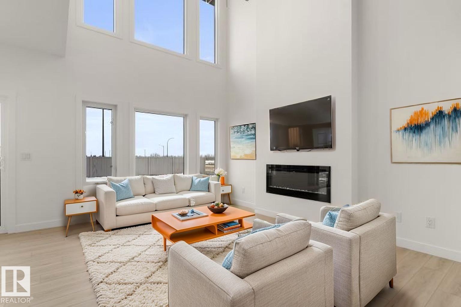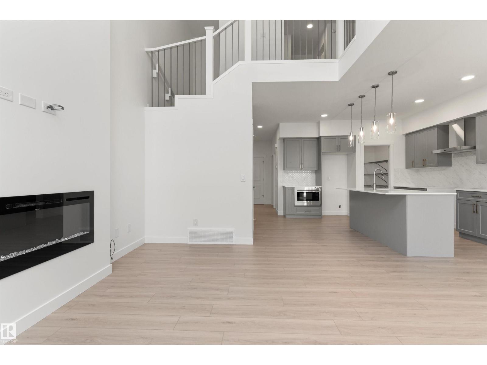 Built by Sterling Homes, this front-attached home in Rivers Edge offers bright, modern living with a dramatic open-to-below great room. Triple pane windows and 9’ ceilings create an airy main floor, featuring a stylish kitchen with quartz counters, a large island, ceiling-height cabinetry, chimney hood fan, full-height backsplash, and a walk-through pantry leading to the mudroom. The great room includes an electric fireplace and sliding patio doors to the backyard. Upstairs, the primary suite has a spacious walk-in closet and 3-piece ensuite. A bonus room, full bath, laundry area, and two additional bedrooms complete the layout. With a separate side entrance, upgraded railings, a garage with floor drain, luxury vinyl plank flooring, and basement rough-ins, this home blends comfort and design in a scenic community. (id:63190)