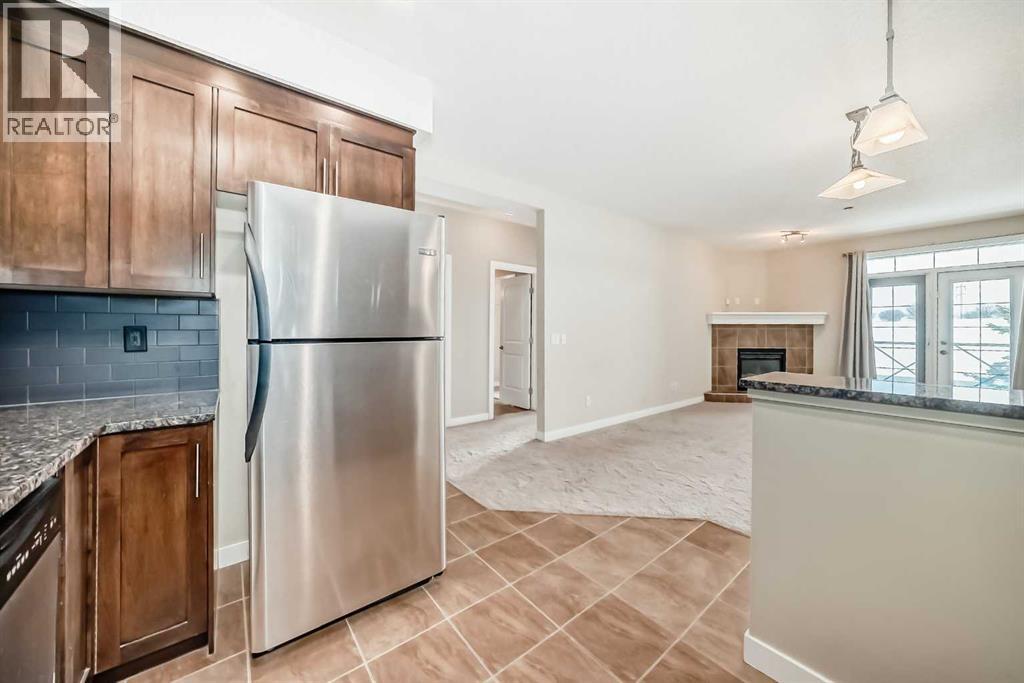 Vacant and ready for a flexible possession, this beautifully maintained second-floor condo in The Savana at Strathmore Lake Estates, offers the perfect blend of comfort, convenience, and lakeside living. This well-designed 764 sq ft, 1-bedroom, 1-bathroom unit features a bright open-concept layout with generous natural light throughout. The kitchen is finished with granite countertops, rich shaker-style cabinetry, stainless steel appliances, and a breakfast bar, making it both functional and stylish. The cozy living area is anchored by a corner gas fireplace with tile surround, creating a warm and inviting space to relax.The spacious primary suite includes a walk-in closet and ensuite. Enjoy the convenience of in-suite stacked laundry.Step outside to your private balcony with a gas BBQ hookup, perfect for evening grilling. The unit also includes a titled surface parking stall.Located steps from Strathmore Lake, walking paths, parks, shopping, and everyday amenities, this home offers an easy, low-maintenance lifestyle in one of Strathmore’s most desirable condo communities. (id:63190)