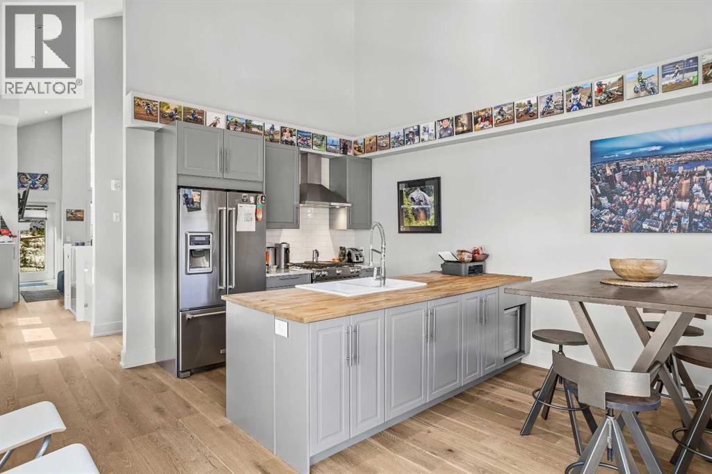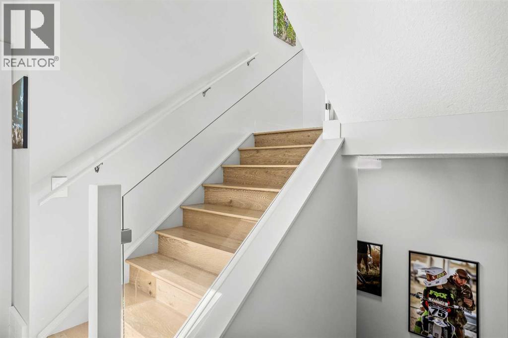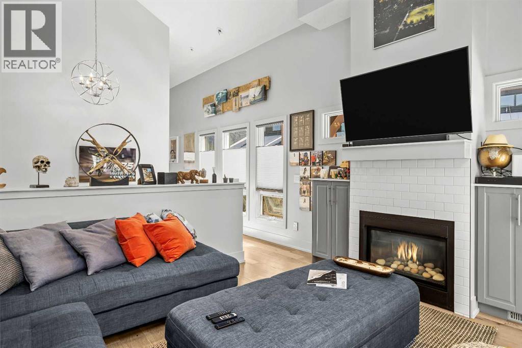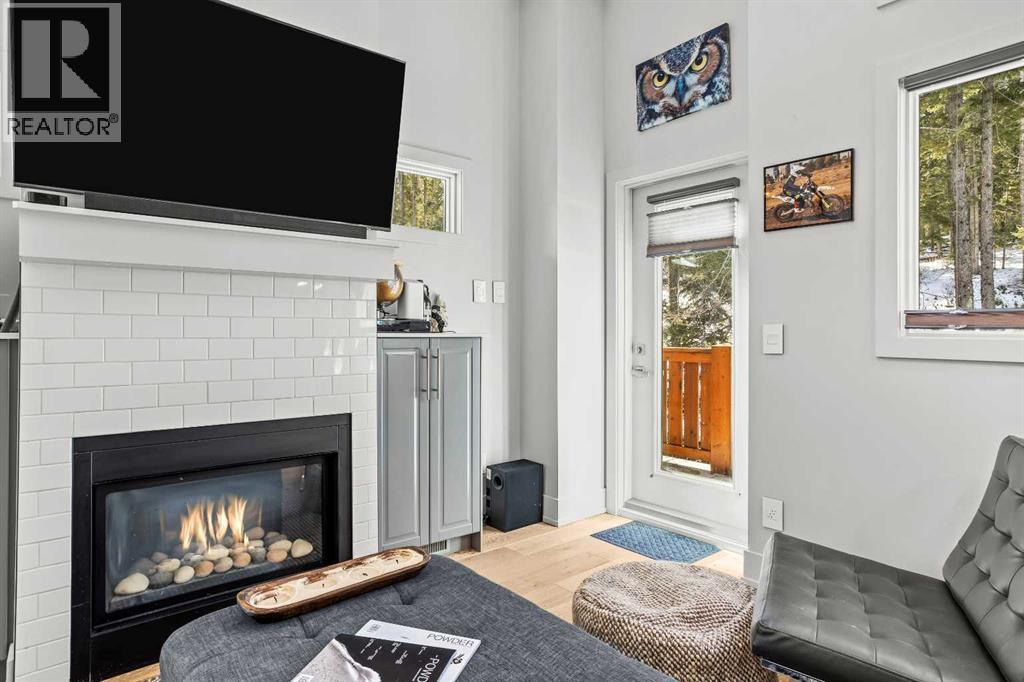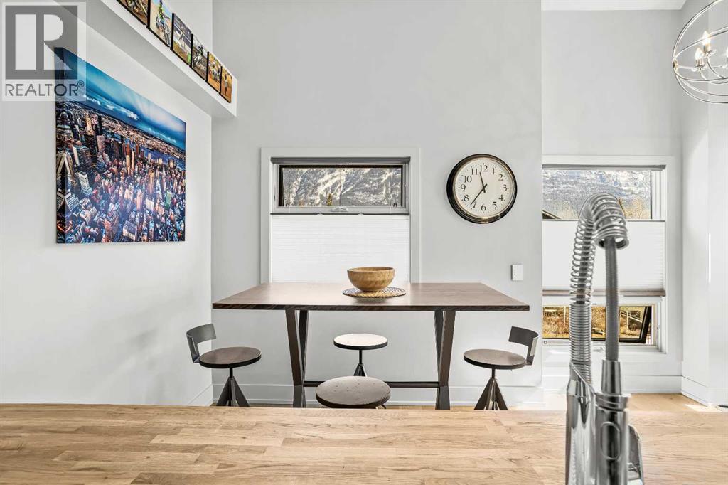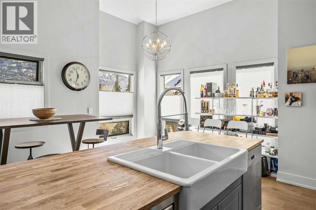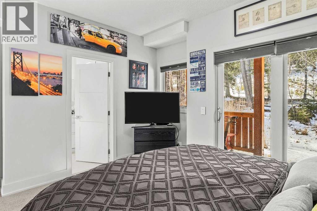 In a back row location, alongside a lovely treed hillside you'll find this well appointed, bright & spacious modern townhome. Over 3 storeys, with no one above or below you, this 1743 SF end unit provides serenity & pride of place in the Three Sisters of Canmore. On entry, vaulted ceilings & a glass bordered stairway leads up to the main level, or down to a handy flex space, laundry & single garage, perfect for active lifestyles. The middle floor offers 2 bedrooms, where the primary suite is an ideal respite with its own bath & generous closet space. A private balcony leads to the woods alongside. Upstairs, views are panoramic, where 3 walls of glass bring the outside in. A thoughtfully laid out kitchen sits together with the dining area & will be the heart of entertaining. Opposite, the living room inspires relaxation & calm under soaring ceilings. Finding inspired design which brings comfort & utility while also offering an environment that's "of" Canmore is a rare offering. We hope you agree! (id:63190)