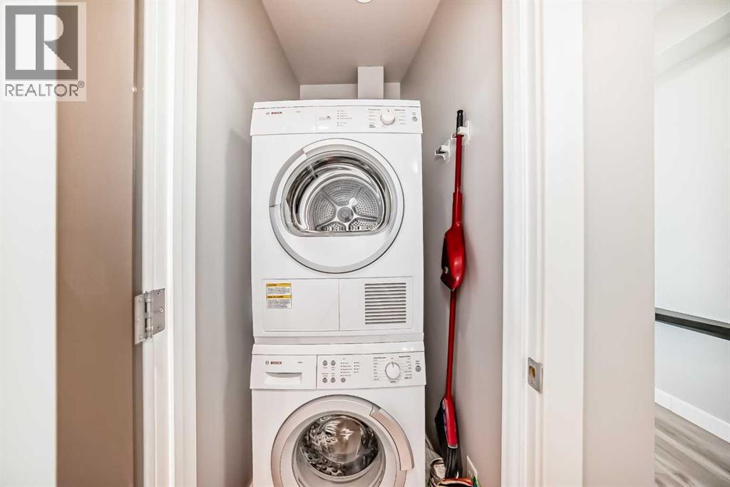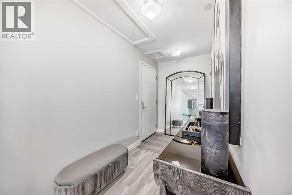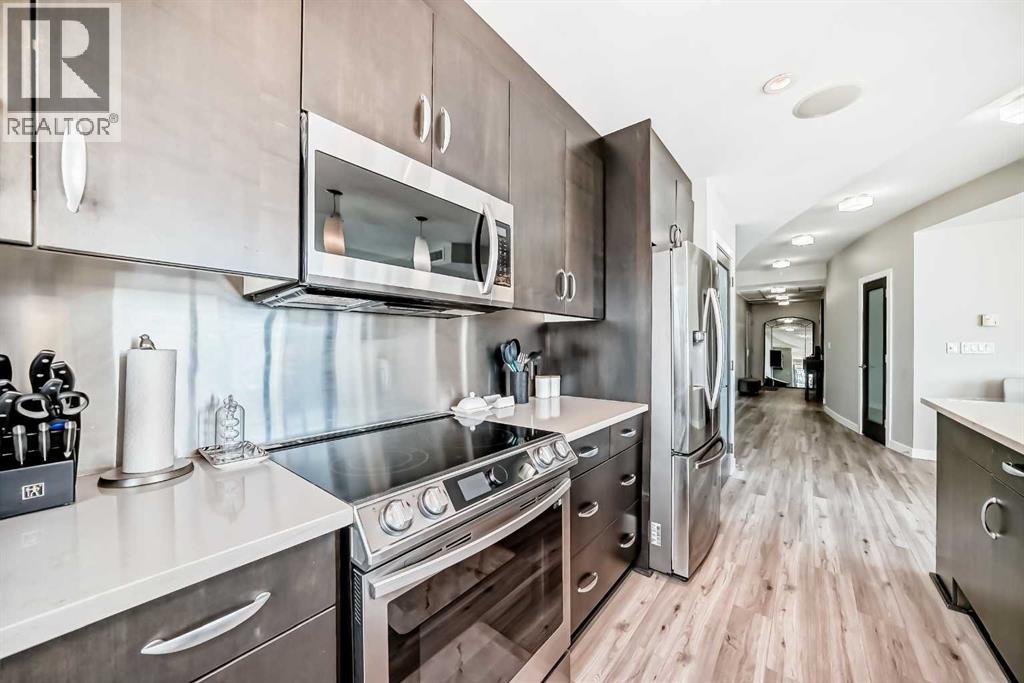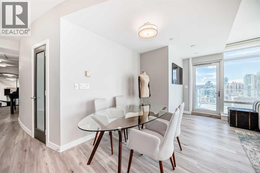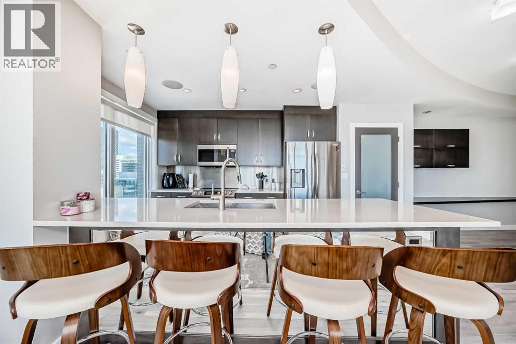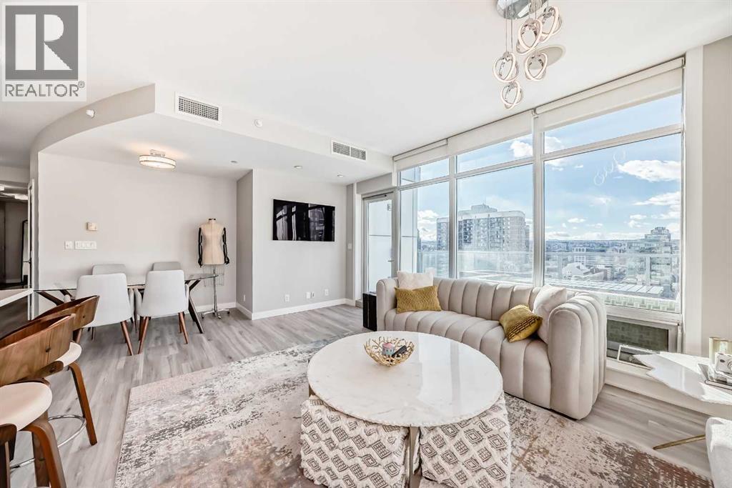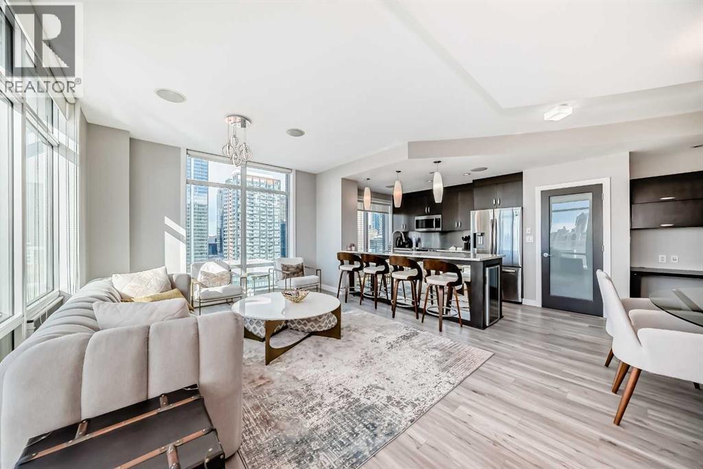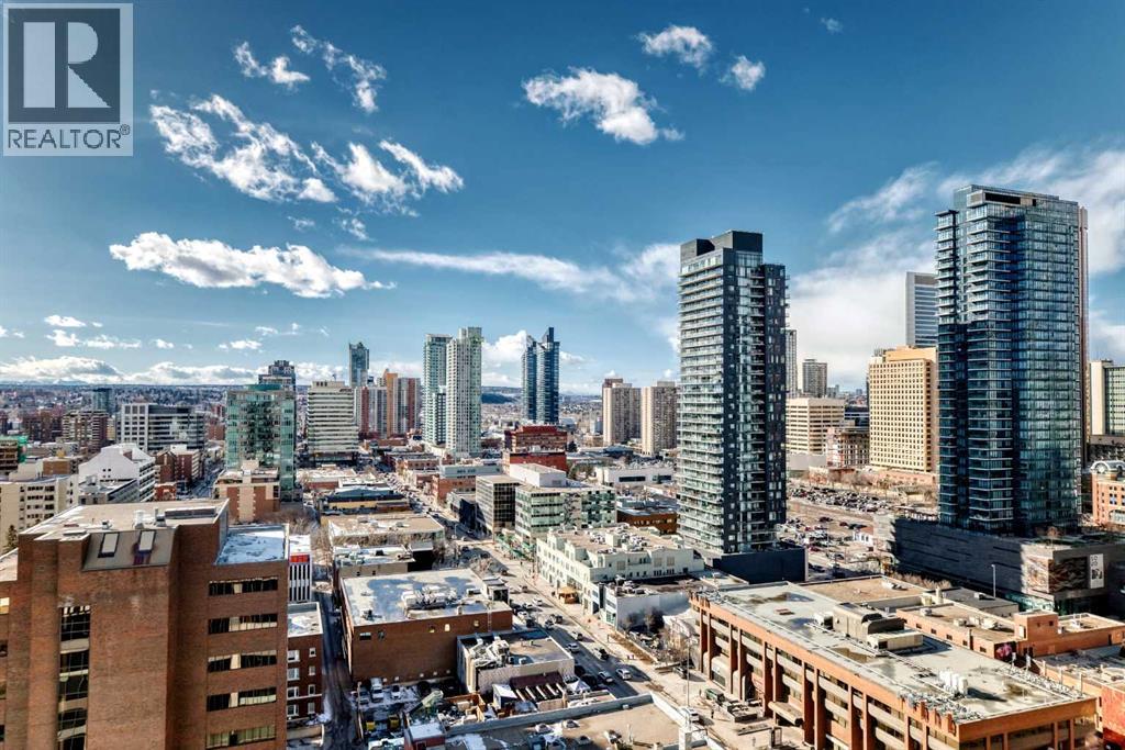 Sub Penthouse!! Experience elevated urban living in this stunning executive condo, featuring unobstructed panoramic city and mountain views. Flooded with natural light by day and illuminated by the glow of city lights at night, this spacious and immaculate suite offers an open floor plan with 9-ft ceilings, floor-to-ceiling windows, modern floors, and solid concrete construction.The generous kitchen is designed for both everyday living and entertaining, complete with extensive cabinetry, stainless steel appliances, quartz countertops, and a built-in wine cooler. The bright living area is surrounded by glass and seamlessly extends to an impressive 190 sq. ft. balcony with sweeping city views, creating the perfect setting for entertaining or relaxing while enjoying spectacular sunsets and the vibrant downtown skyline.The primary retreat features a spa-inspired ensuite with quartz counters, double vanity, large glass-enclosed steam shower, and walk-in closet. A spacious second bedroom, full bath, and convenient laundry complete the interior.Additional highlights include central air conditioning, titled storage locker, and 2 titled parking stalls. Ideally located in the heart of Calgary’s vibrant urban core, this exceptional residence offers the perfect blend of luxury, comfort, and lifestyle. (id:63190)