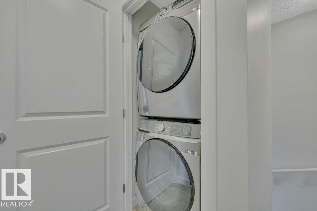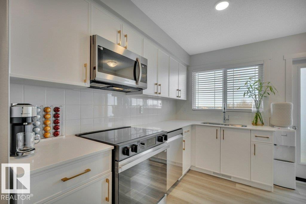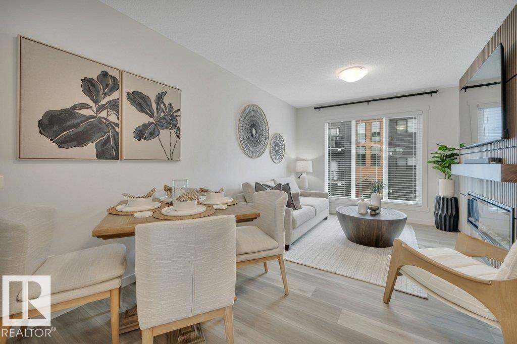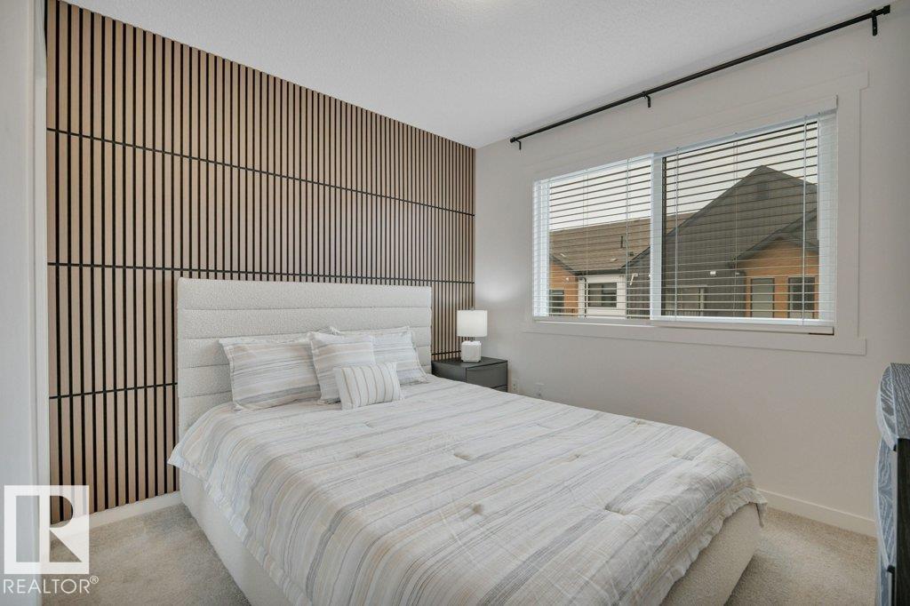 Feels like brand new! This 2024-built townhome in West Secord is in meticulous condition, with modern finishes & upgrades throughout! The main level shines with a bright kitchen featuring quartz counters, subway tile backsplash, brass accents, upgraded induction stove, undermount sink, hood fan/microwave, pantry & garden door to a south-facing balcony with a quiet view. Beautiful vinyl plank flooring flows into the living room with a stunning feature wall complete with custom mantle & electric fireplace. Upstairs, two bedrooms share a four-piece bath with soaker tub, quartz counters & added cabinetry. The primary bedroom boasts an acoustic feature wall. Upper-floor laundry with full-size Samsung Smart Steam washer/dryer. Entry-level powder room with quartz counter. Single attached insulated garage. Low $178/mo. condo fees. Pets allowed, no age restriction. One block from future Lewis Farms Rec Center w/ pool, gym, library, café & hockey rinks. The ideal starter home for singles, couples or young families! (id:63190)