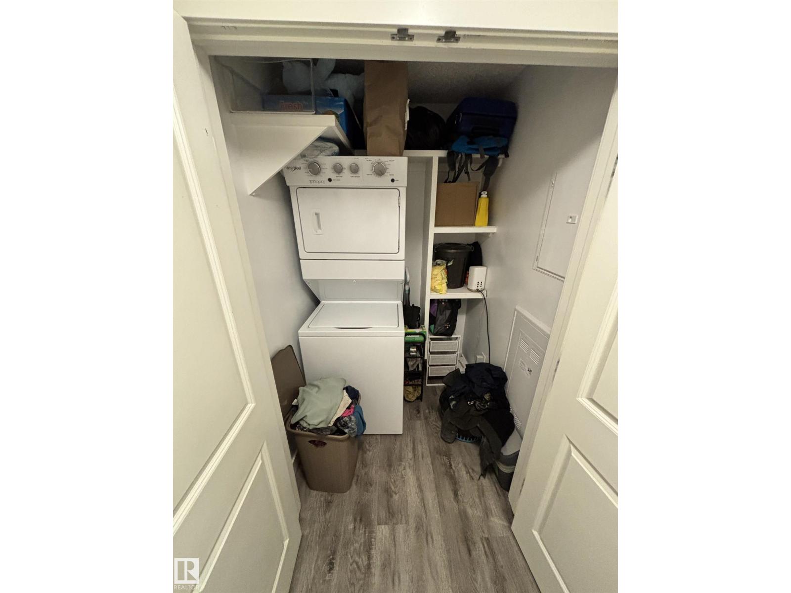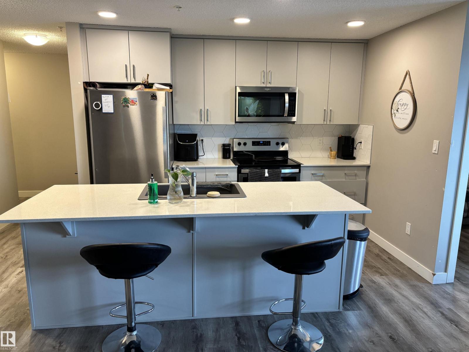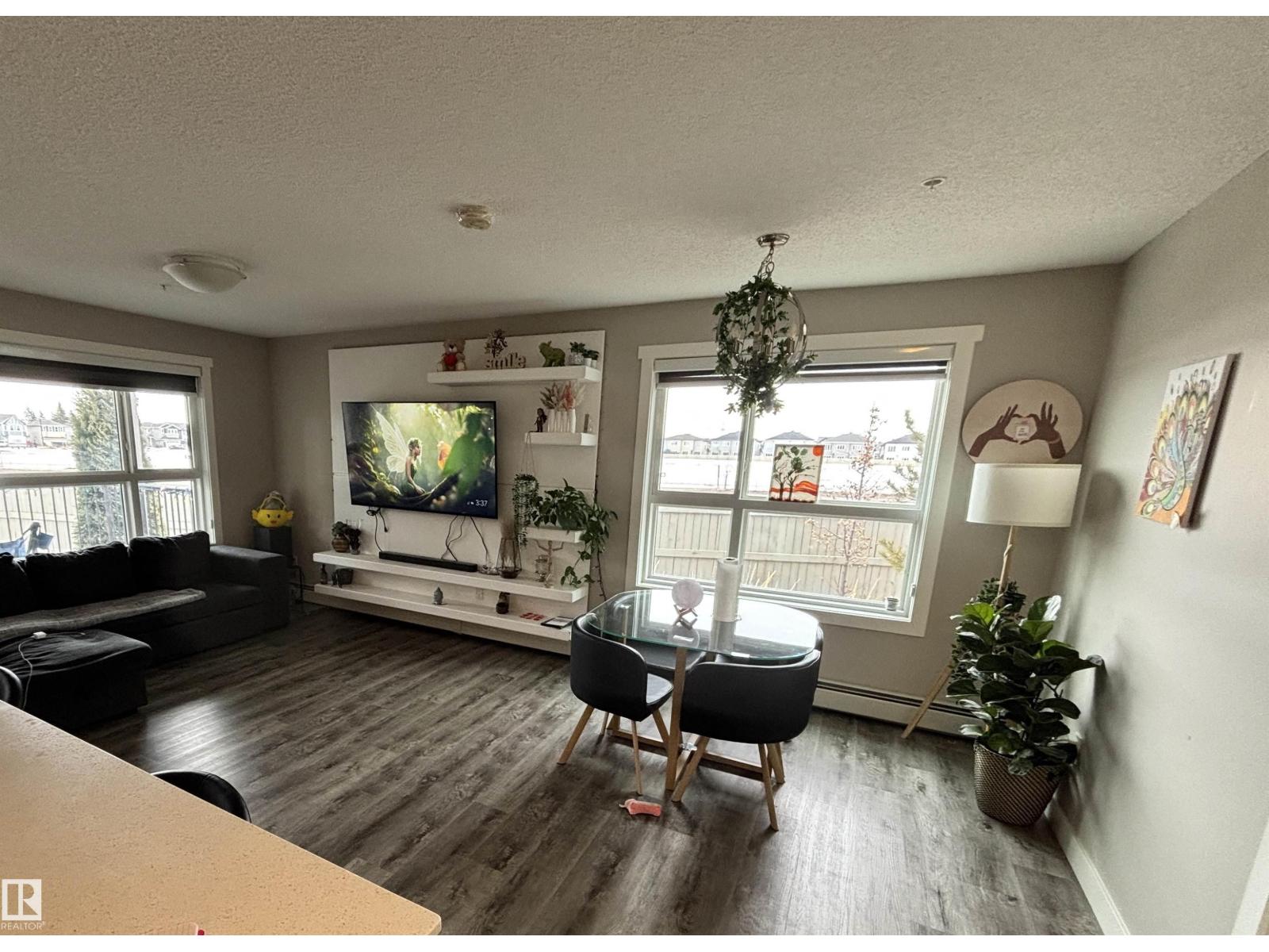 Nestled in the community of Tamarack, ALOFT TAMARACK is a vibrant place that is centrally located close to all amenities like shopping, schools, entertainment, highways like Henday and Whitemud. This stylish 2 bedroom and 2 bathroom home offers 1012 sq. ft. with thoughtfully designed floor plan. A wide open layout with a beautiful kitchen featuring abundance of cabinets, Quartz countertops, stainless steel appliances, full tile backsplash. The kitchen overlooks the huge living room area, open to the dining area and step onto private patio, perfect for relaxation, entertaining and family gatherings. The master bedroom has a walk-in closet and bathroom. This well-designed and well maintained condo provides many upgrades like deeper and higher cabinets, a feature wall and led lighting, huge windows for natural light, deck, stacked washer/dryer leaves space extra space for storage. The building has a security system. Perfect home for first time buyer. Aloft is a place that you can easily call your home. (id:63190)