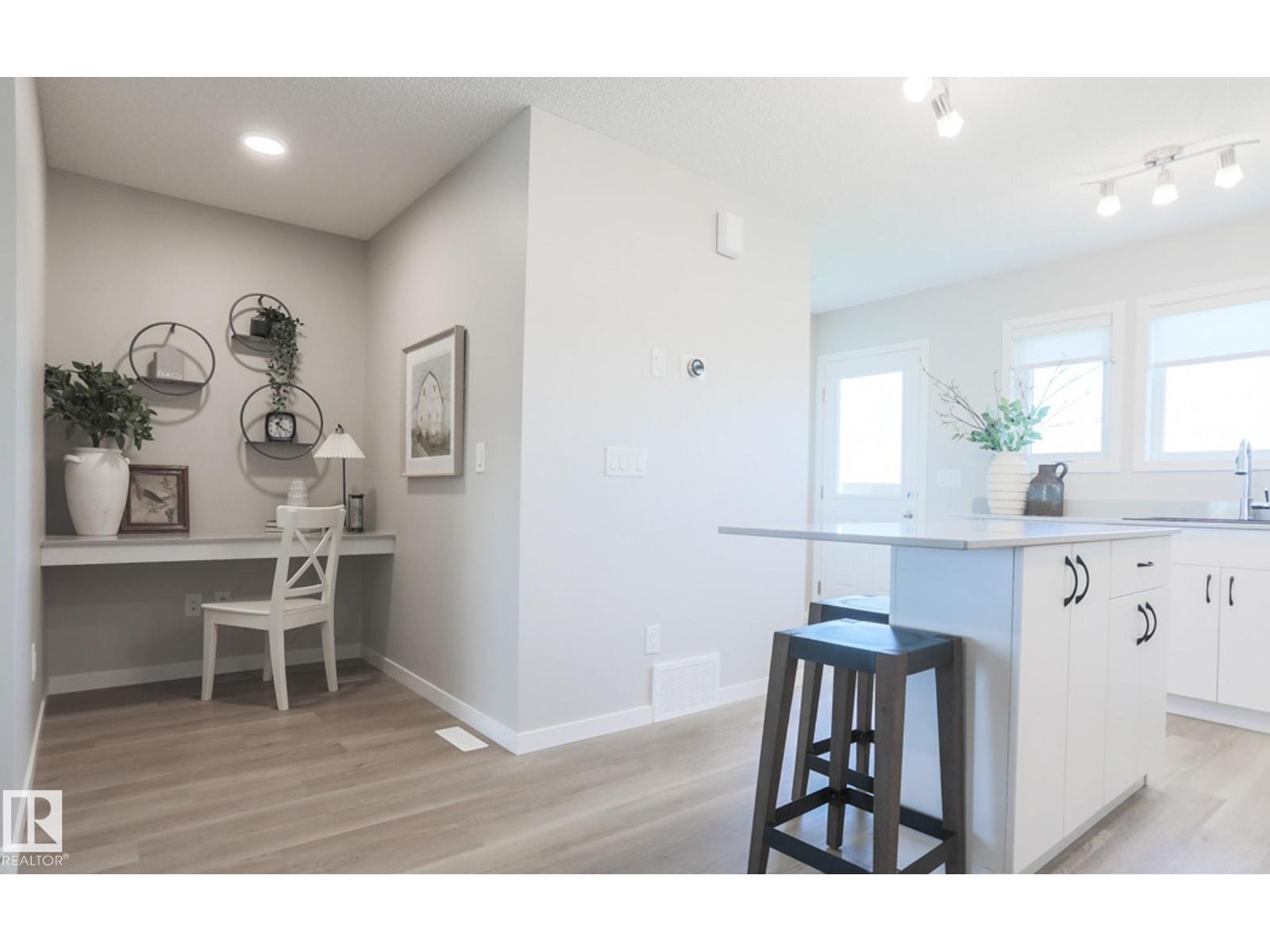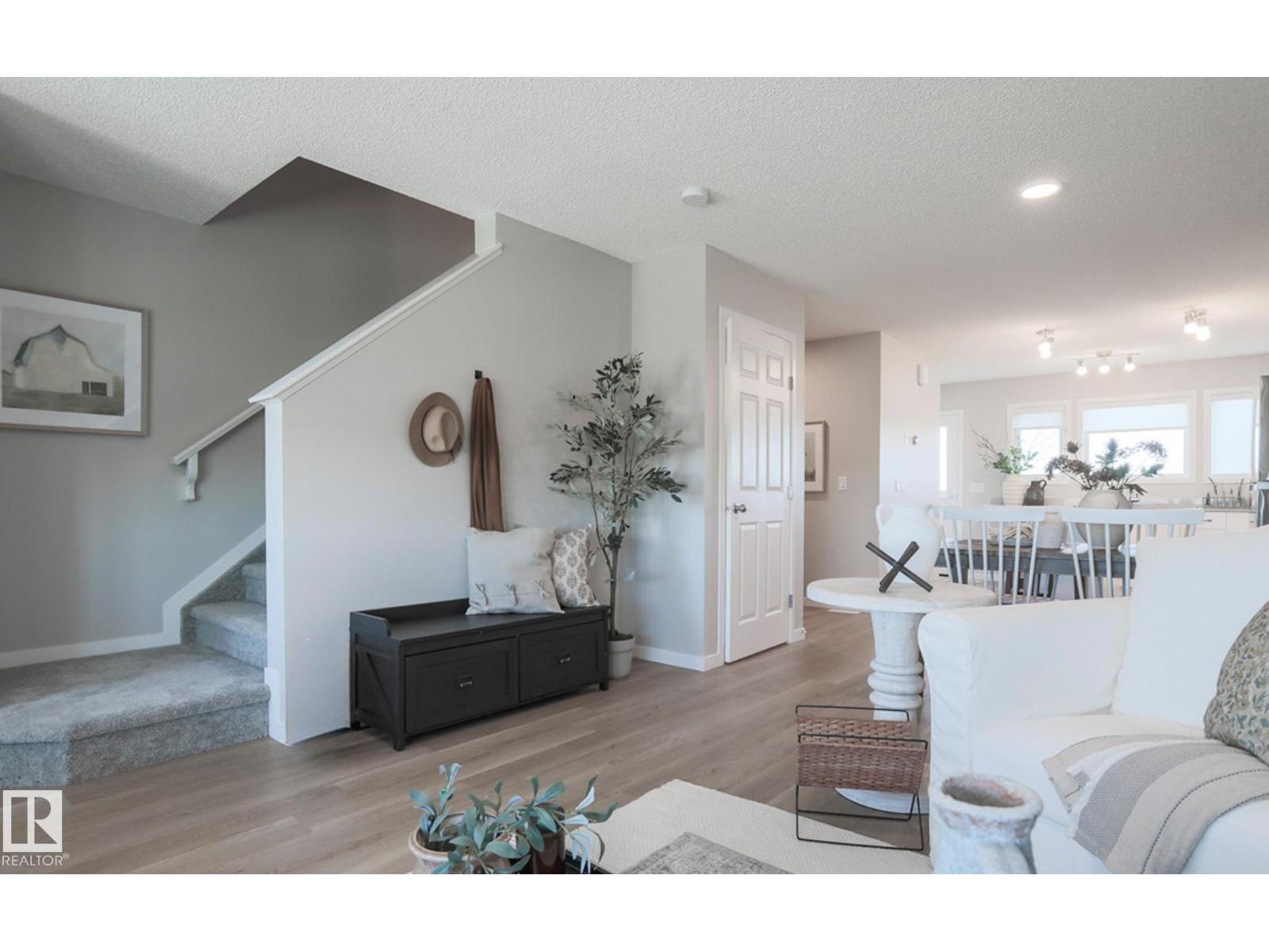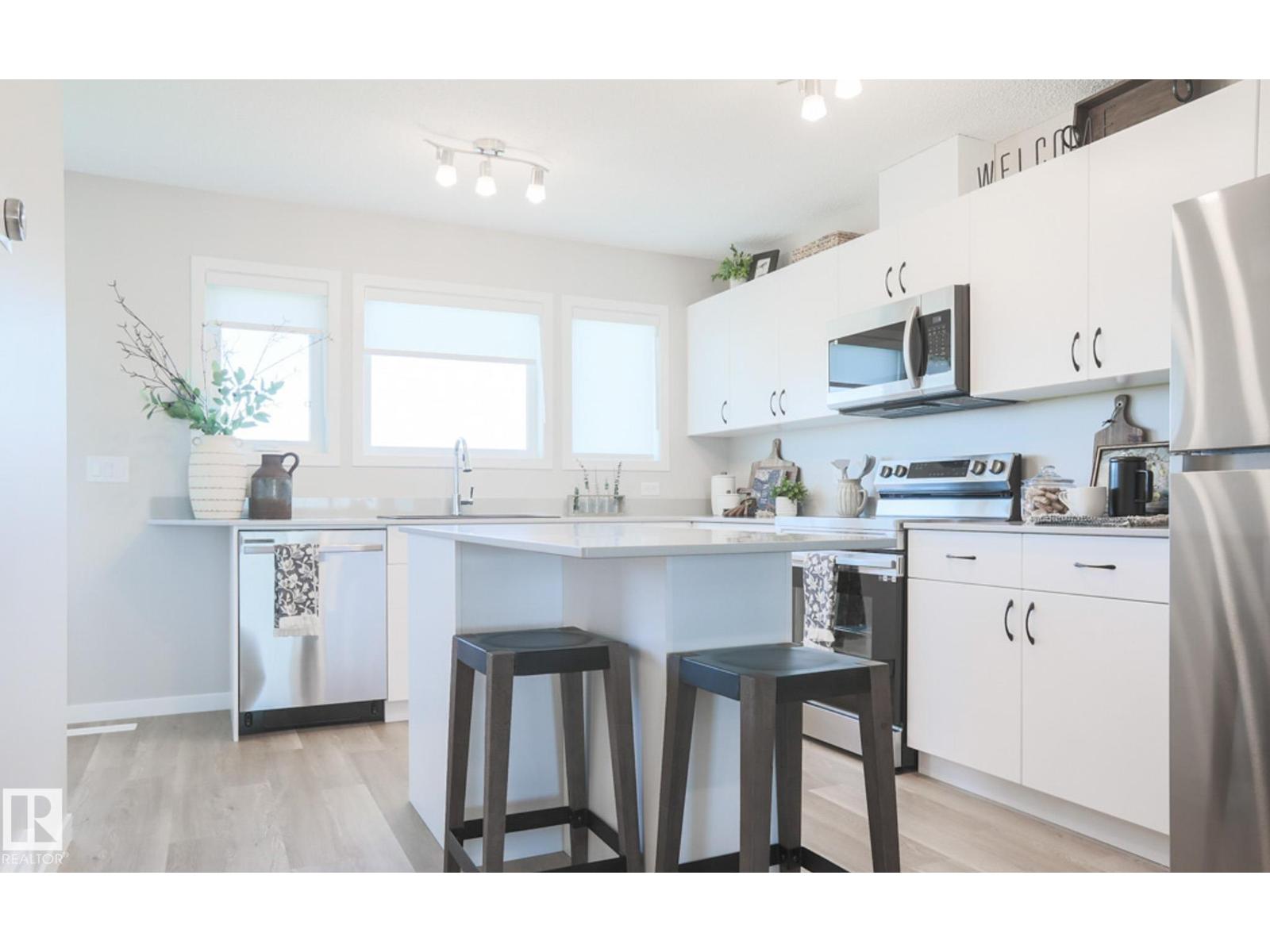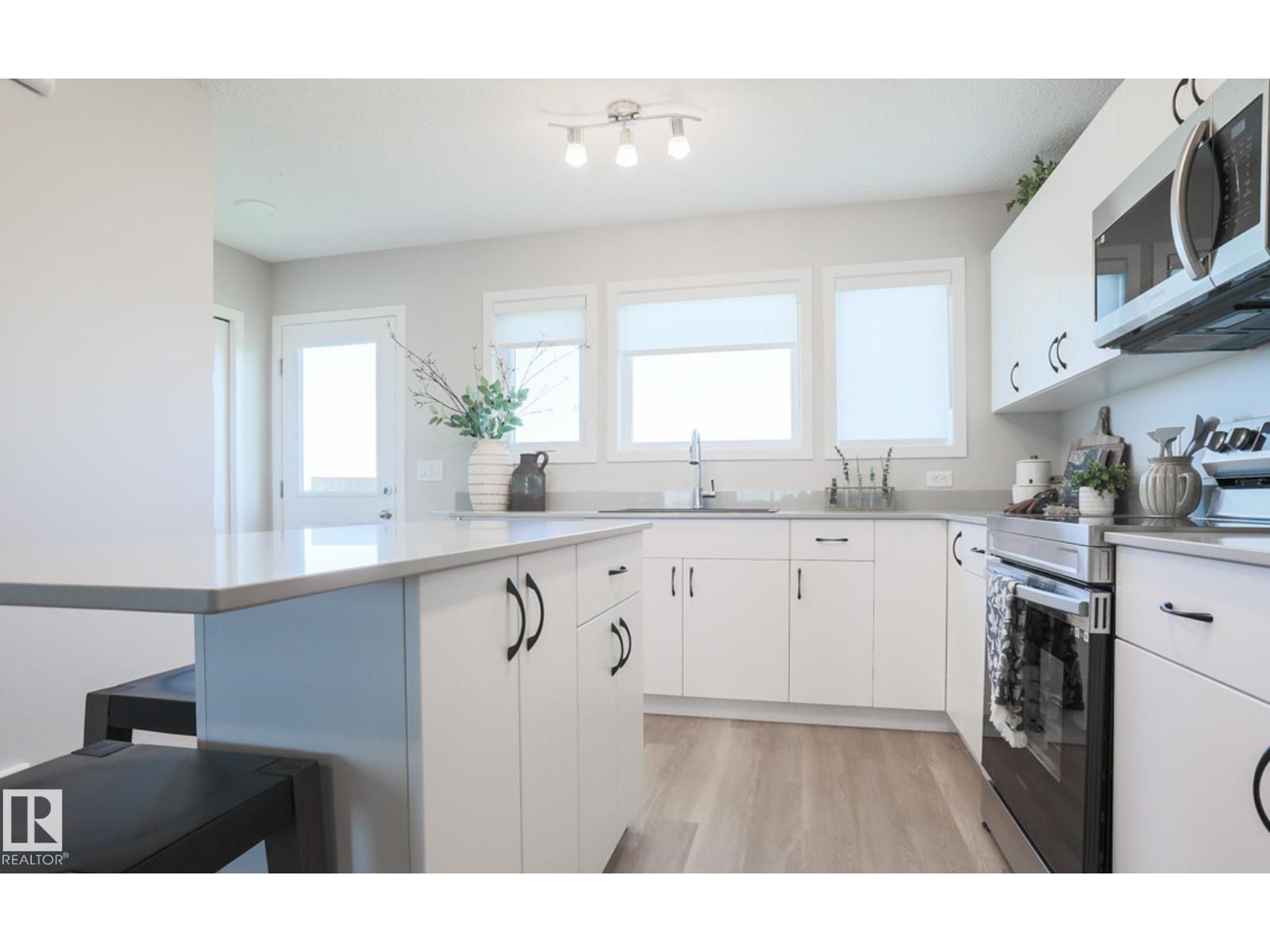 Charming and thoughtfully designed 2-storey built by Sterling Homes, offering modern comfort and smart use of space. The main floor features durable luxury vinyl plank flooring and a bright, open layout ideal for everyday living. Large front and rear windows fill the home with natural light, while the U-shaped kitchen with peninsula seating creates the perfect space for cooking and gathering. A convenient 2-piece bath completes the main level. Upstairs, you’ll find three bedrooms including a bright primary suite with walk-in closet and private ensuite. Upper-floor laundry adds everyday convenience. A separate side entrance and basement rough-in provide excellent future development potential. Parking pad included with option to add a detached double garage. (id:63190)