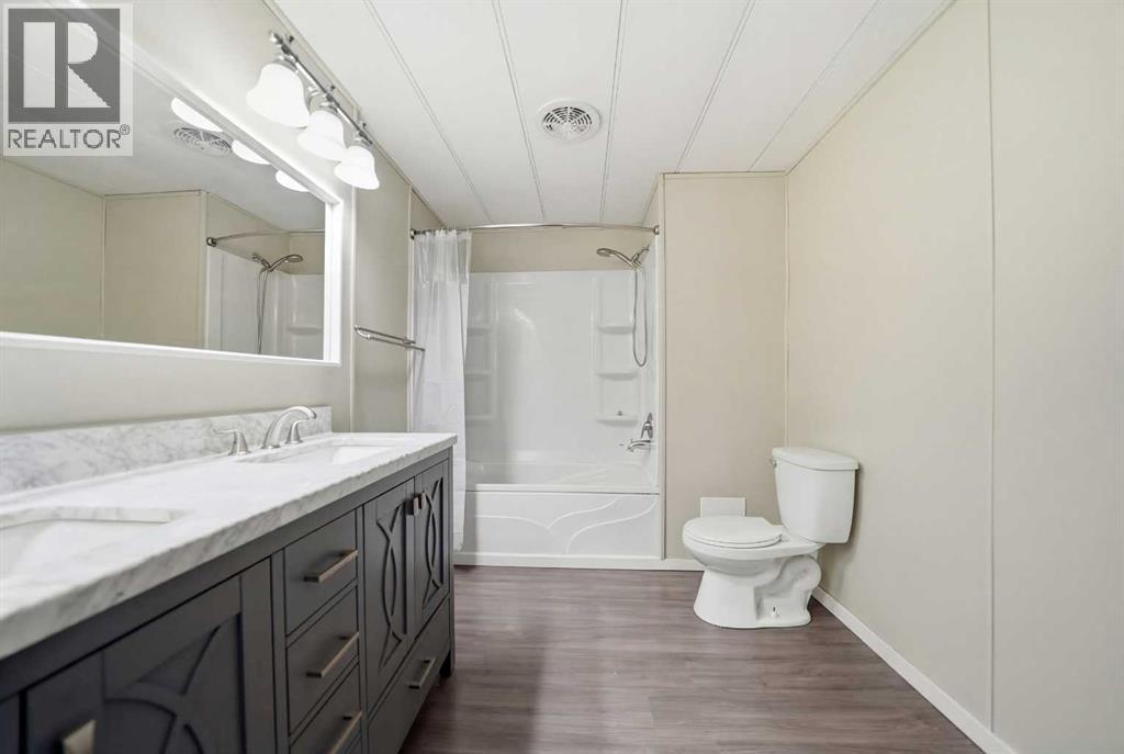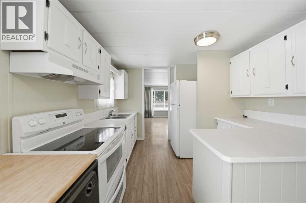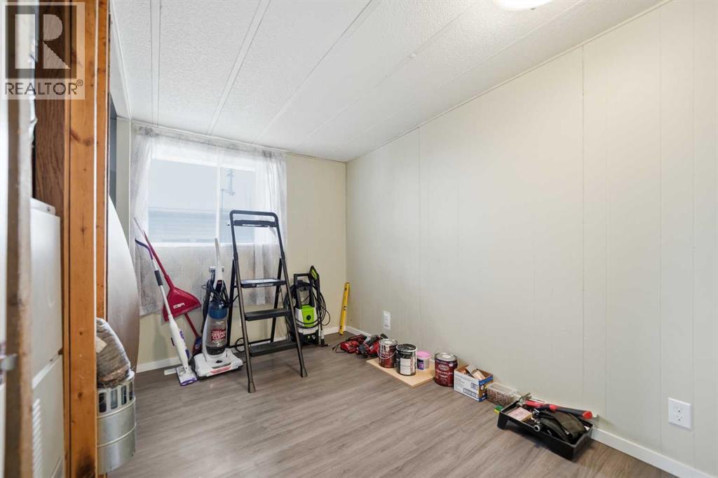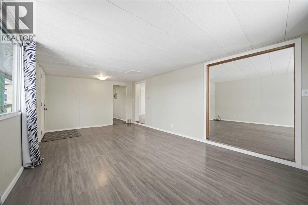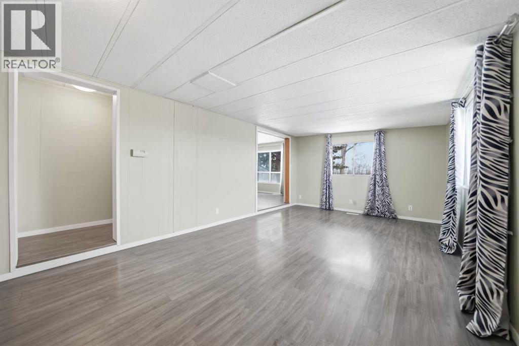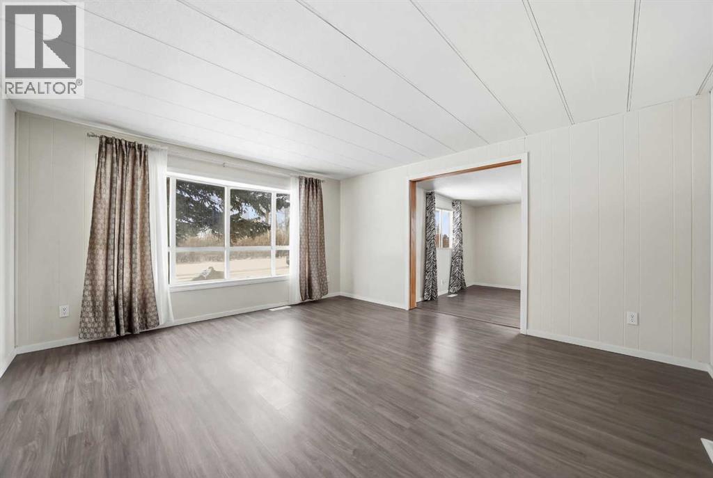 Spacious double wide manufactured home on its own land situated on two lots in the heart of Irricana, offering excellent value and small town living. Located directly across from a park and community hall with playground and just one block from the town’s main street, this property combines convenience with a quiet setting. The home features a wraparound deck, fenced yard, and lane access to an oversized detached double garage, with one bay tall enough to accommodate an RV or large truck. Inside you will find both a living room and a separate family room, providing flexible space for families or entertaining. The layout includes 3 generously sized bedrooms, a den, and a large 4 piece bathroom with a relaxing jacuzzi tub. Several improvements have been completed including laminate flooring, new fridge (2025), new dryer (2025), and a new furnace and central A/C (Jan 2025). The home is equipped with two furnaces for added comfort and efficiency and includes additional storage below the laundry room. An excellent opportunity for first time buyers, investors, or downsizers looking for affordable detached living just 20 minutes to Airdrie and 40 minutes to Calgary. (id:63190)