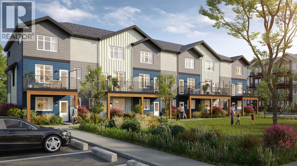 StreetSide proudly presents this exceptionally popular interior-unit townhome, where expansive living areas meet modern comforts and sophisticated finishes. The thoughtfully designed floorplan features three spacious upper-level bedrooms and two and a half well appointed bathrooms, complemented by a versatile lower-level den perfect for a home office or quiet retreat. The heart of the home is an inviting open-concept main floor, anchored by a large gourmet kitchen featuring a functional breakfast bar for casual dining. This bright living space transitions seamlessly to a private balcony, offering a perfect setting for outdoor relaxation. The interior showcases high end craftsmanship, including modern dark slab-style cabinetry with a full bank of drawers for maximum storage. The kitchen is further elevated by polished white quartz countertops and a full suite of premium stainless steel appliances. Durable luxury vinyl flooring runs throughout the primary living areas, while the stairs and upper level are finished with plush carpet over an 8lb underlay for superior comfort. Additional conveniences include an attached double car garage, professionally maintained landscaping, and a lifestyle defined by maintenance free living. Located within Redstone Square this home places you at the heart of the dynamic Redstone neighborhood. Enjoy the ease of a convenient location with quick access to major routes, including Stoney Trail, ensuring you are never far from the city's best. The community is strategically positioned near future commercial developments, promising shops, services, dining, and entertainment options just moments from your doorstep. Please note photo is a rendering of the building. (id:63190)