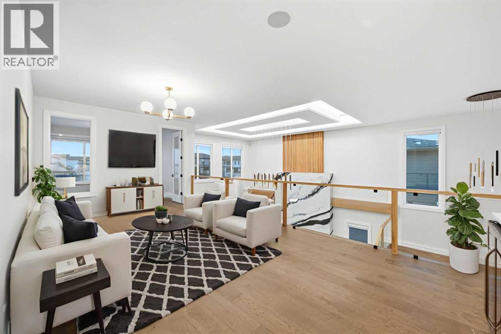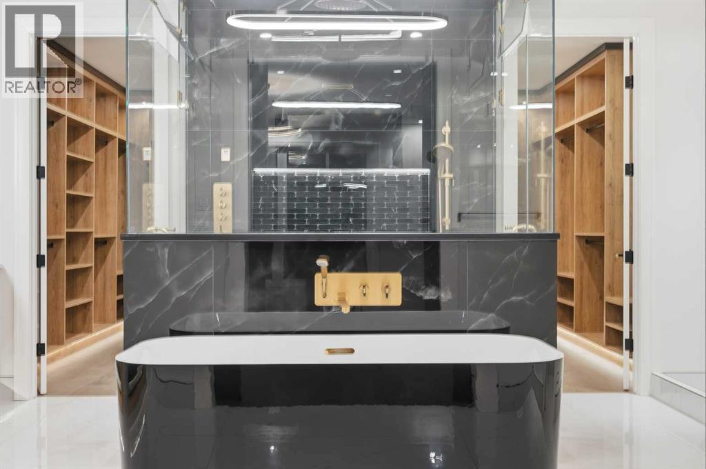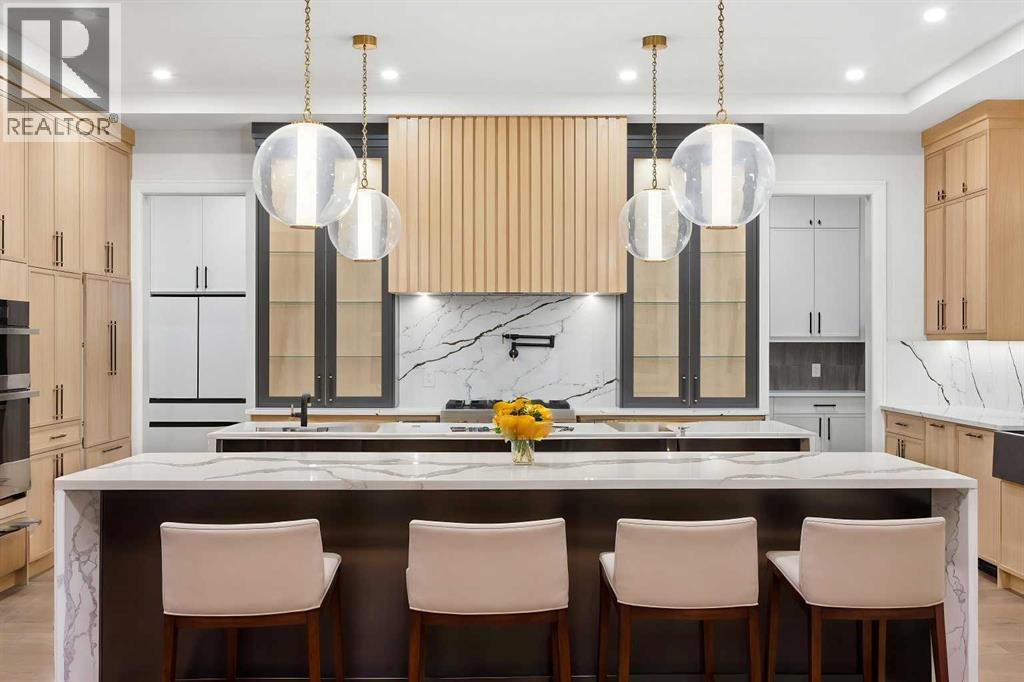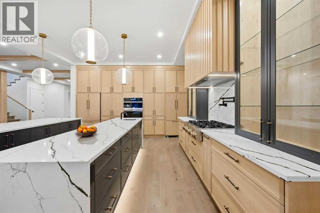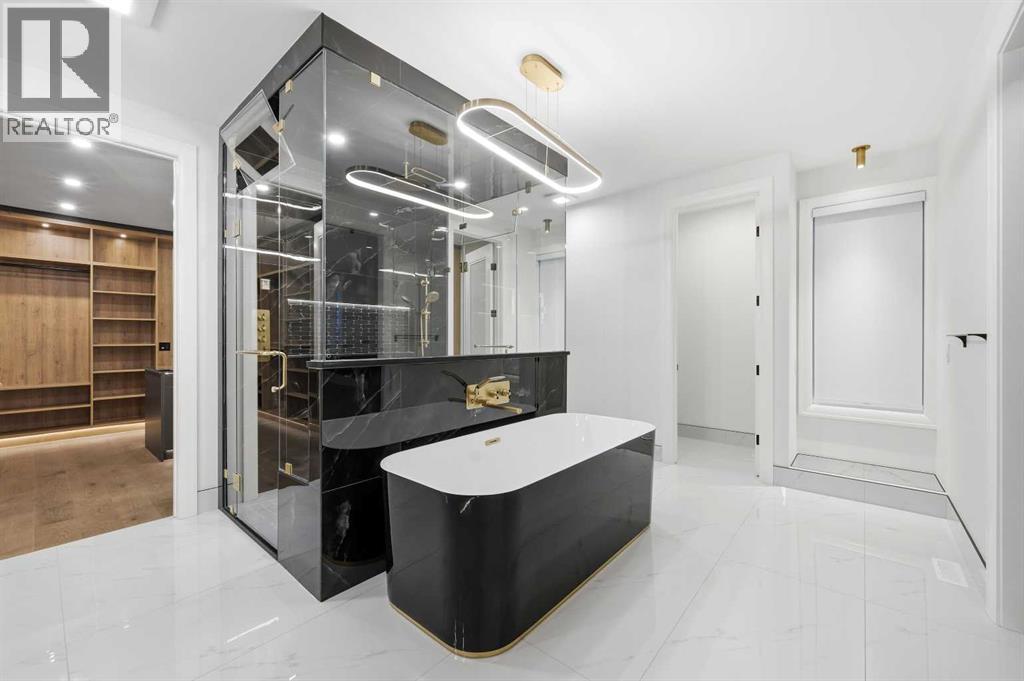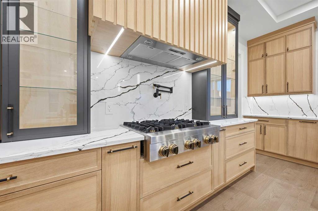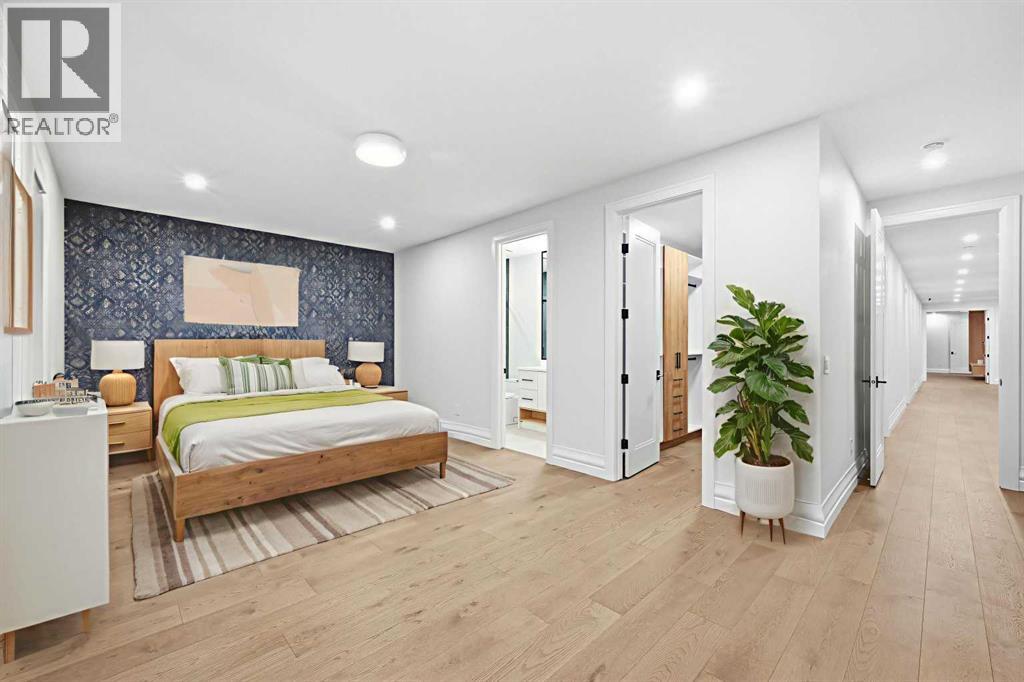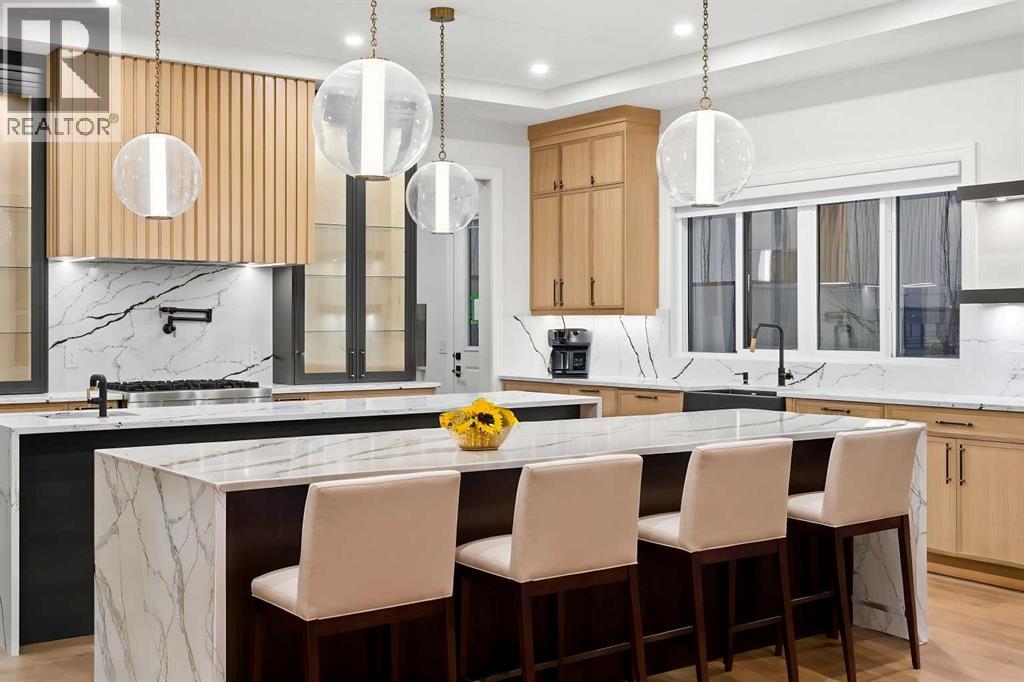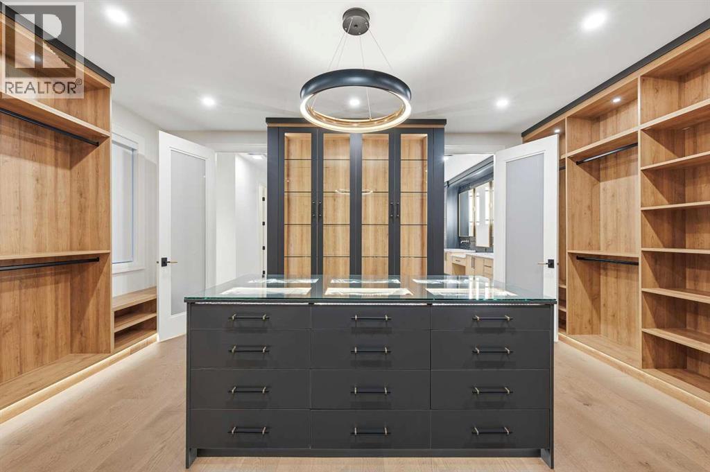 Luxury meets refined functionality in this exceptional custom-built 2-storey residence, ideally situated on one of the largest and most sought-after lots in the community. Offering 5 bedrooms, 5 full bathrooms, and a powder room, this meticulously designed home showcases soaring 10-ft ceilings on the main floor and basement, 9-ft ceilings upstairs, and rich hardwood flooring throughout, creating an elegant and airy ambiance.The chef-inspired kitchen is a true centerpiece, featuring quartz countertops, ceiling-height custom cabinetry, premium built-in appliances, a gas cooktop with pot filler, and an oversized island perfect for entertaining. A fully equipped spice kitchen adds both convenience and sophistication. The open-concept living and family rooms are designed to impress, highlighted by a dramatic open-to-below layout, a sleek natural gas fireplace, tray ceilings with ambient LED lighting, and modern glass railings.The main floor offers a versatile bedroom or private office with a full bath, ideal for guests or multi-generational living, along with a thoughtfully designed mudroom complete with built-in storage. Upstairs, four generously sized bedrooms each offer ensuite access, including a luxurious primary retreat featuring a private balcony, designer feature wall, spa-inspired ensuite, and a custom walk-in closet. A spacious bonus room with wet bar and an upper-level laundry equipped with dual washer and dryer enhance everyday comfort and convenience.The undeveloped basement presents endless possibilities, complete with a separate side entry and bathroom rough-in. Completing this remarkable home is a rare attached 4-car garage with sleek glass doors, professionally landscaped grounds, a concrete patio with gas BBQ line, and premium exterior finishes that elevate the home’s curb appeal. (id:63190)