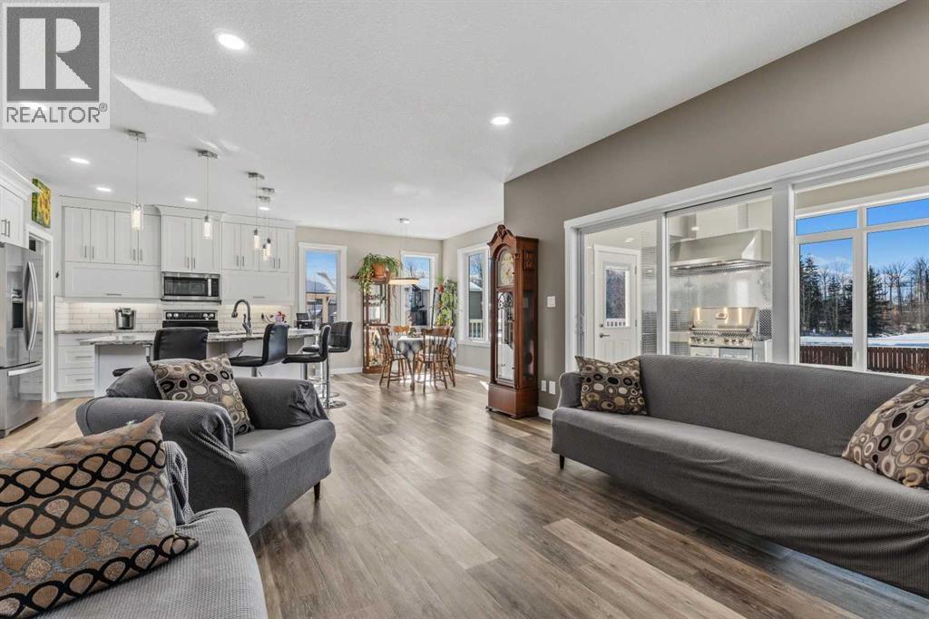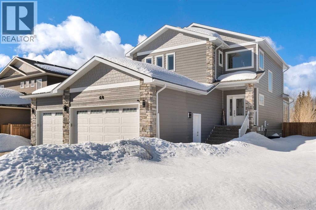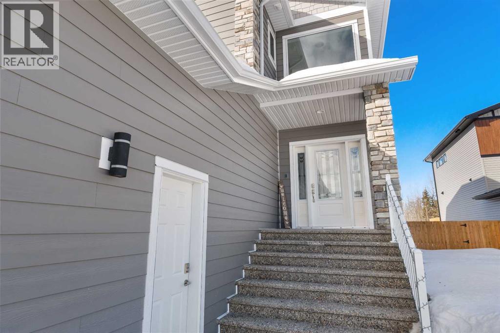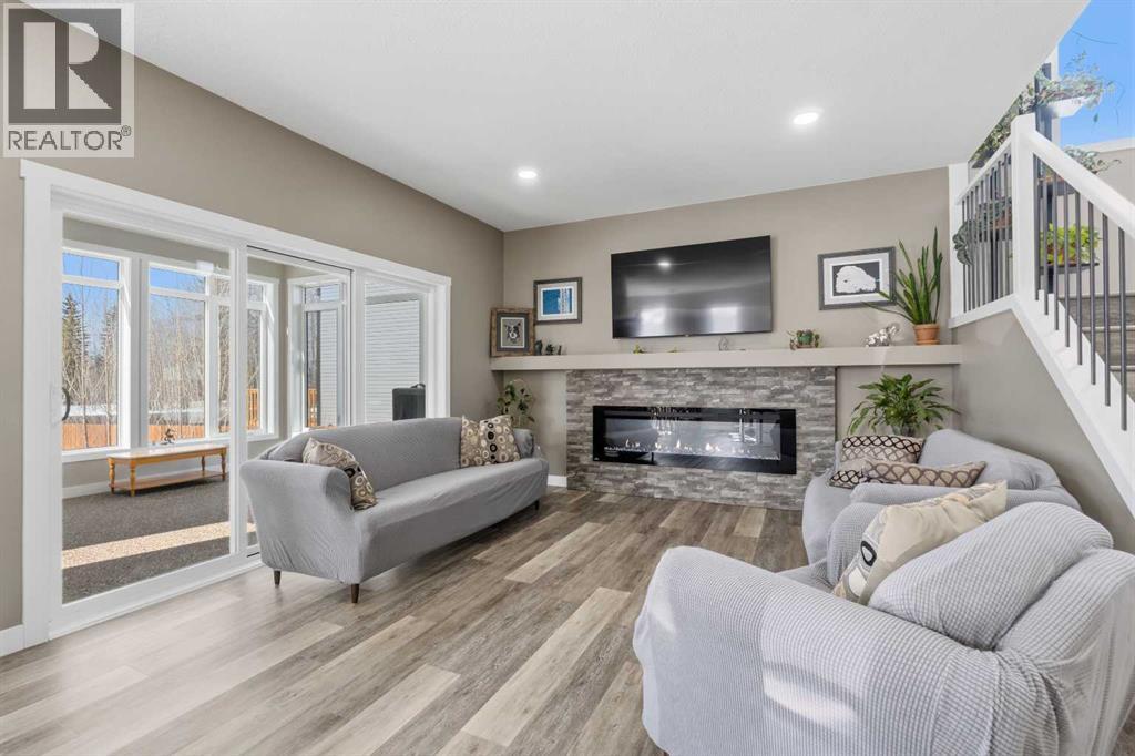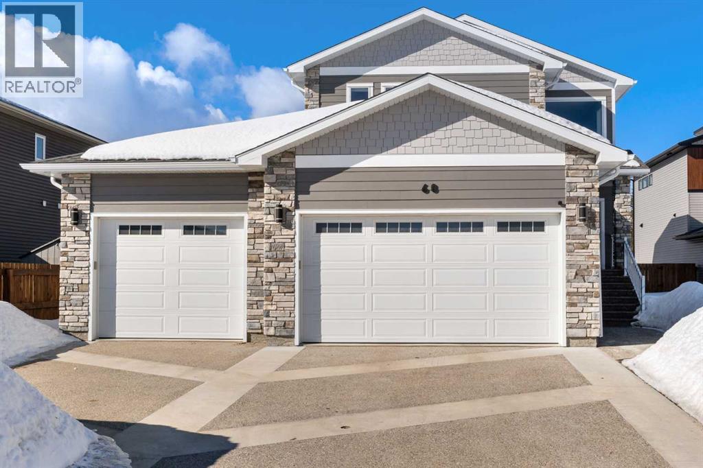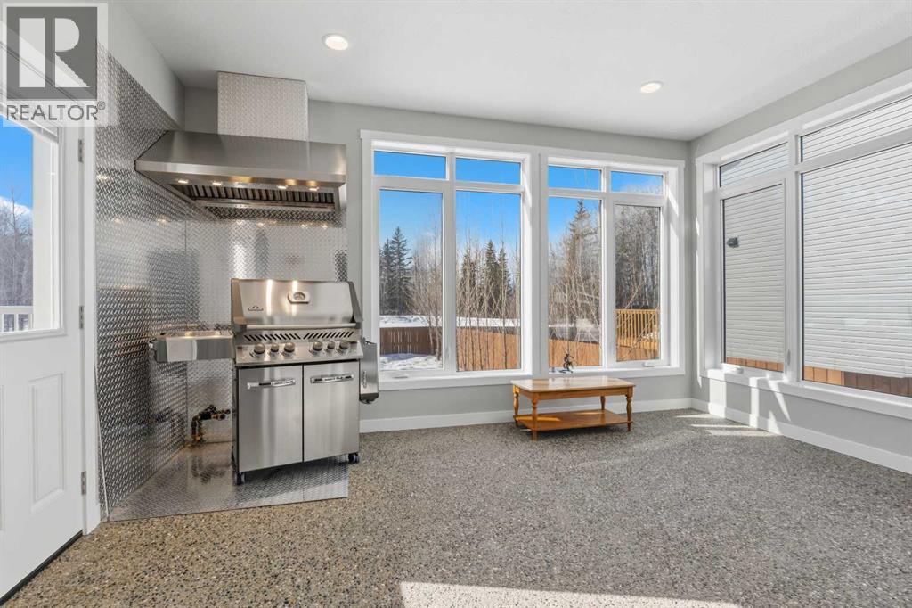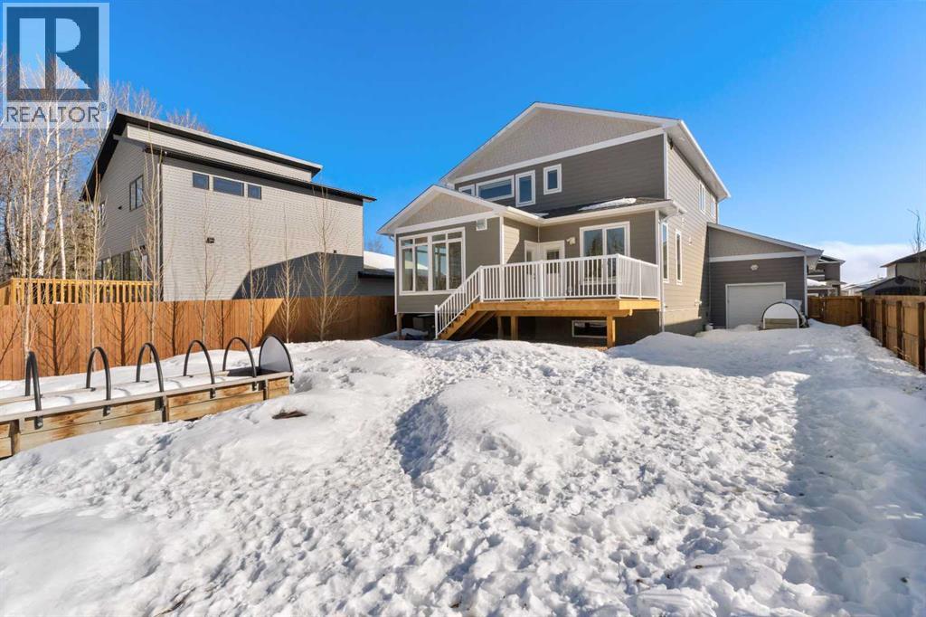 Custom home is situated in a quiet cul-de-sac backing onto green space, offering direct access to paved trails leading to the Athabasca River or Festival Park. The exterior features a wide aggregate driveway to a massive 1,068 sq. ft. triple-car garage with 11-foot ceilings, an overhead heater, hot and cold taps, a dedicated dog wash, EV charging, and a convenient drive-thru bay to the backyard. Inside, the main floor greets you with a soaring entryway looking up to the second level, 9-foot ceilings throughout, and a smart second entrance from the garage to hide clutter from guests. The gourmet kitchen is a standout with quartz countertops, a walk-through pantry, upgraded ceiling-height cabinets, a bar fridge, and an electric stove with a double oven, all centered around a large island that seats five (or more) comfortably. This space flows into a bright dining area with south and west-facing windows for evening sun, and a living room with an electric fireplace that opens to a fully enclosed, insulated 3-season room featuring a natural gas line and a commercial-grade hood fan for year-round indoor grilling. Upstairs, extra-wide stairs facilitate easy furniture movement and lead to three bedrooms and a convenient laundry room. The primary suite has soundproofing in the floor, wall, and door for total quiet, and windows overlooking your backyard. A 5-piece ensuite with two sinks, triple shower heads and a 15-foot walk-through closet that leads directly into the laundry room. The fully finished basement adds a fourth bedroom with a walk-in closet, a wet bar with a matching bar fridge, and a fully soundproofed theatre room with two hidden windows already installed for an easy conversion to a 5th bedroom if needed. The home also includes the convenience of a built-in central vacuum system with a quick-sweep plate in the kitchen for effortless cleanup, along with a large, finished storage area tucked under the stairs featuring matching flooring and trim. Every inch of thi s home is built for efficiency and comfort, featuring fire- and hail-resistant Hardie Board on an ICF block foundation, a dual-zone high-efficiency furnace for separate temperature control on each level, a 60-gallon hot water tank, and a Black Box electrical system that intelligently manages power between your EV charger and appliances. Hot and cold taps front and back outside are such little examples of the upgrades this home holds. This residence is a masterpiece! (id:63190)