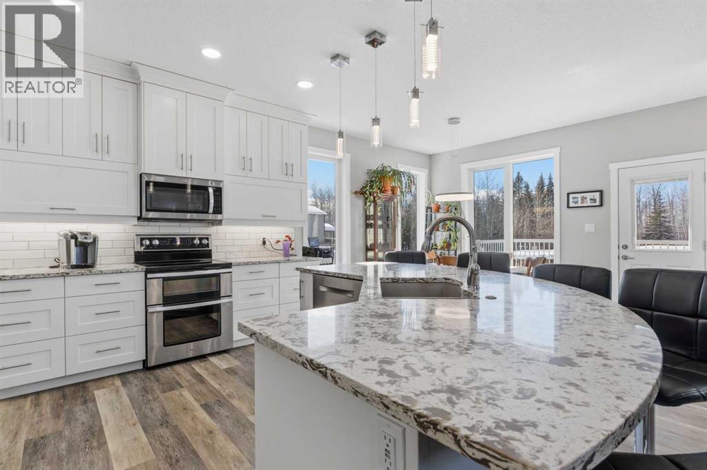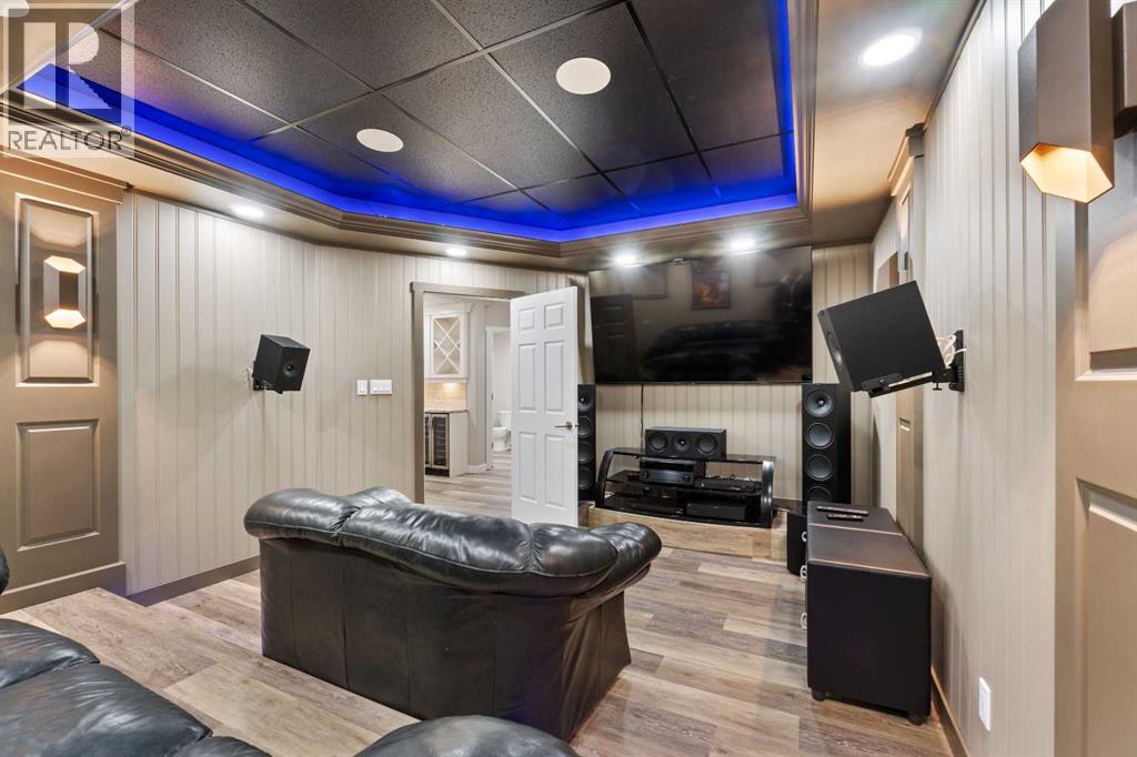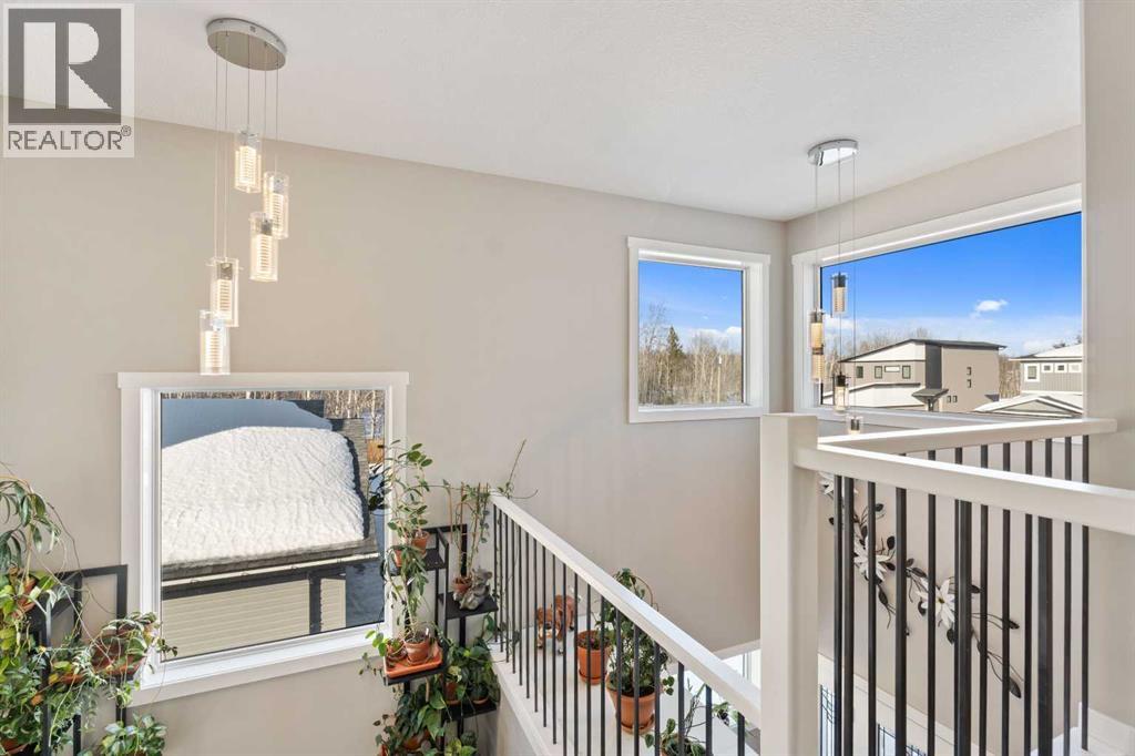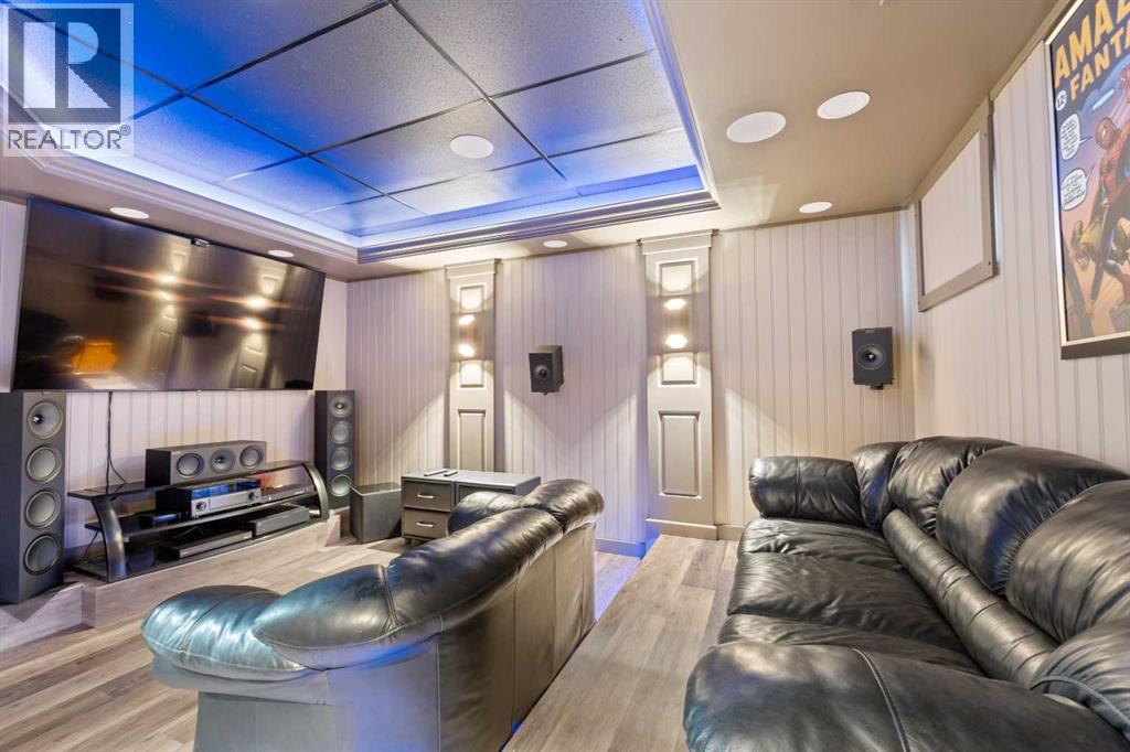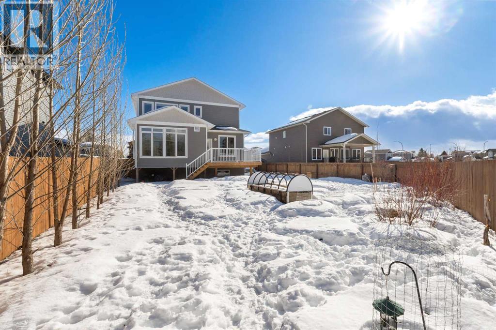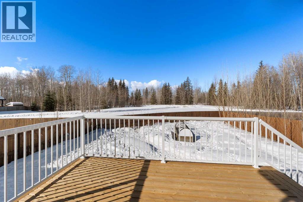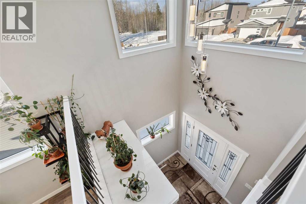 Custom home is situated in a quiet cul-de-sac backing onto green space, offering direct access to paved trails leading to the Athabasca River or Festival Park. The exterior features a wide aggregate driveway to a massive 1,068 sq. ft. triple-car garage with 11-foot ceilings, an overhead heater, hot and cold taps, a dedicated dog wash, EV charging, and a convenient drive-thru bay to the backyard. Inside, the main floor greets you with a soaring entryway looking up to the second level, 9-foot ceilings throughout, and a smart second entrance from the garage to hide clutter from guests. The gourmet kitchen is a standout with quartz countertops, a walk-through pantry, upgraded ceiling-height cabinets, a bar fridge, and an electric stove with a double oven, all centered around a large island that seats five (or more) comfortably. This space flows into a bright dining area with south and west-facing windows for evening sun, and a living room with an electric fireplace that opens to a fully enclosed, insulated 3-season room featuring a natural gas line and a commercial-grade hood fan for year-round indoor grilling. Upstairs, extra-wide stairs facilitate easy furniture movement and lead to three bedrooms and a convenient laundry room. The primary suite has soundproofing in the floor, wall, and door for total quiet, and windows overlooking your backyard. A 5-piece ensuite with two sinks, triple shower heads and a 15-foot walk-through closet that leads directly into the laundry room. The fully finished basement adds a fourth bedroom with a walk-in closet, a wet bar with a matching bar fridge, and a fully soundproofed theatre room with two hidden windows already installed for an easy conversion to a 5th bedroom if needed. The home also includes the convenience of a built-in central vacuum system with a quick-sweep plate in the kitchen for effortless cleanup, along with a large, finished storage area tucked under the stairs featuring matching flooring and trim. Every inch of thi s home is built for efficiency and comfort, featuring fire- and hail-resistant Hardie Board on an ICF block foundation, a dual-zone high-efficiency furnace for separate temperature control on each level, a 60-gallon hot water tank, and a Black Box electrical system that intelligently manages power between your EV charger and appliances. Hot and cold taps front and back outside are such little examples of the upgrades this home holds. This residence is a masterpiece! (id:63190)