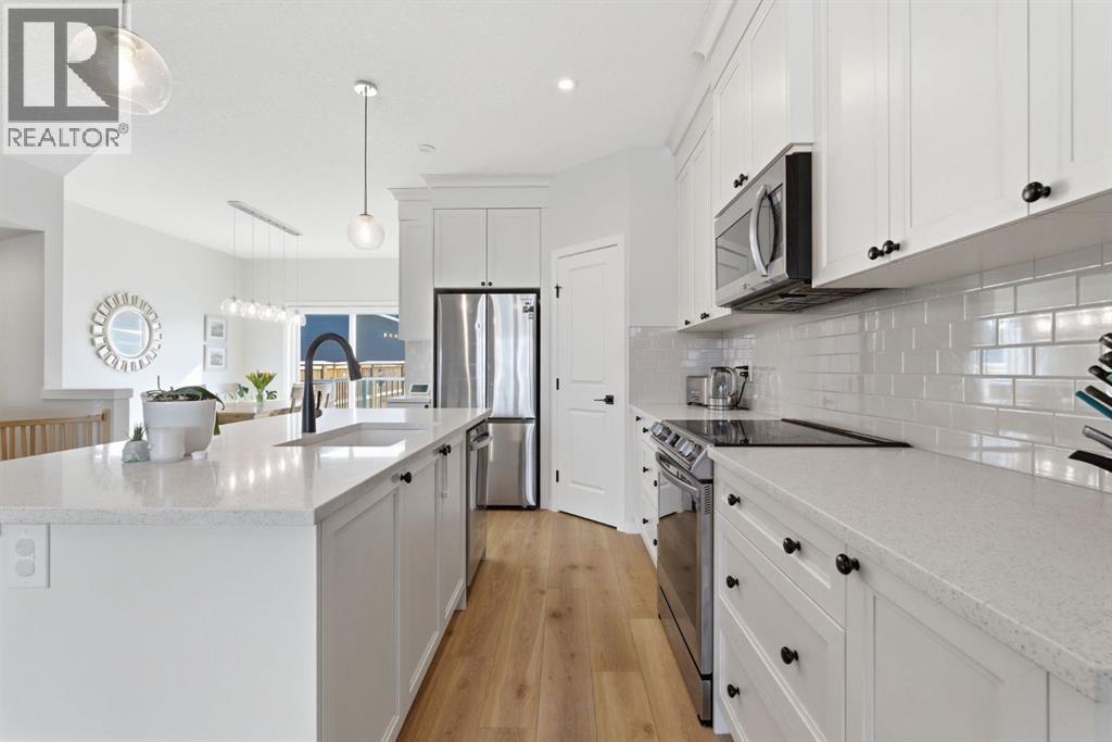 ***OPEN HOUSE SUNDAY APRIL 26TH ~ 2PM-4PM***Welcome to your dream home in the highly sought-after community of Fireside! This immaculate, like-new residence boasts nearly 2,200 total developed square feet, perfectly designed for family living. As you approach you will notice the great curb appeal and inviting front porch. You are then greeted by gleaming hard surface flooring, soaring 9’ knockdown ceilings, and an abundance of natural light. This thoughtfully crafted layout features a spacious front living room that seamlessly flows into the chef-inspired kitchen, making it an entertainer's dream. The kitchen showcases elegant shaker-style cabinets that extend to the ceiling, timeless subway tile backsplash, beautiful quartz countertops, stainless steel appliances, and a convenient corner pantry for extra storage. Adjacent to the kitchen, you will find a well-sized dining room with patio sliders that open up to your deck, creating the perfect indoor-outdoor living space. Just around the corner, you'll appreciate the practicality of a mudroom and a private powder room. The fully landscaped and fenced sunny south backyard is a true oasis and includes a 2-vehicle parking pad.Upstairs, is the generously sized primary bedroom, complete with a walk-in closet and an ensuite bathroom featuring dual sinks, a separate shower, and stylish stone countertops. Two additional spacious bedrooms, a 4-piece main bathroom with stone counters, and the convenience of upper-level laundry complete this level. The fully developed lower level presents a 4th bedroom, an additional full bathroom, and an expansive recreation room, perfect for family gatherings and entertainment. This turnkey ready home is, just a short walk to Fireside School (K–8) and Holy Spirit Catholic School (K–8), along with scenic walking paths, playgrounds, restaurants, an outdoor rink, baseball diamond, and three soccer fields located in the heart of the community. A gas bar, pharmacy, and everyday conveniences are c lose by. Fireside is a complete, thoughtfully planned community offering schools, parks, open spaces, and commercial amenities. Its strong walkability encourages an active, family-oriented lifestyle, all just 15 minutes to Calgary and 45 minutes to the heart of the Rocky Mountains. Don’t miss the opportunity view the virtual tour or schedule your private showing today! (id:63190)