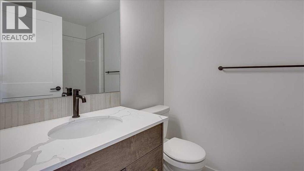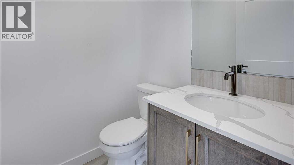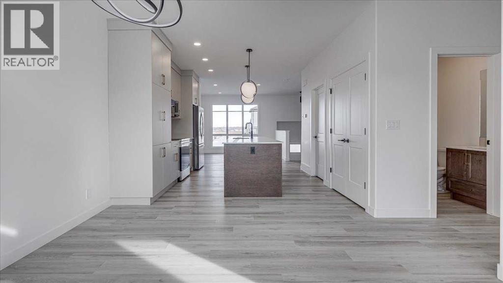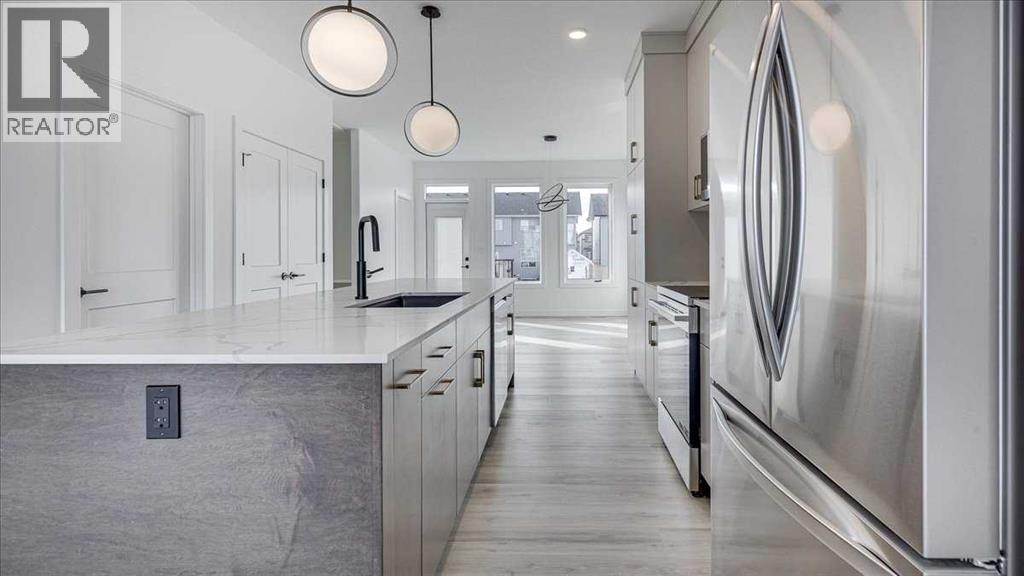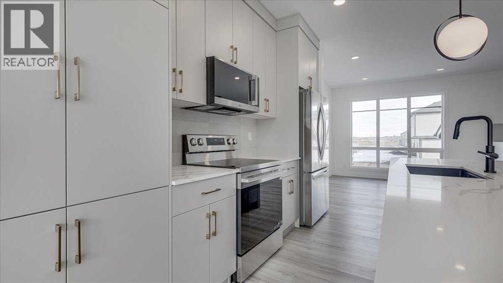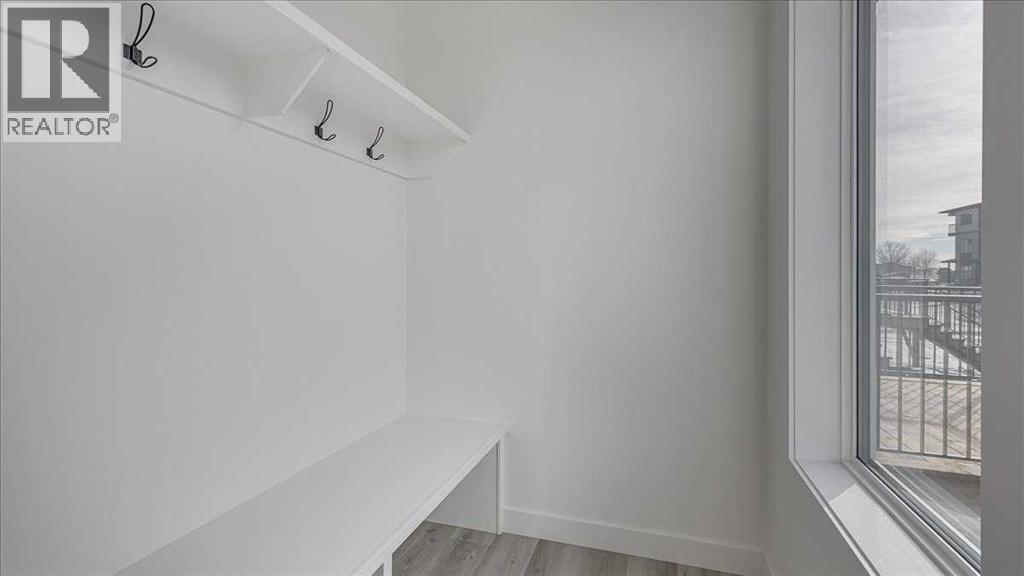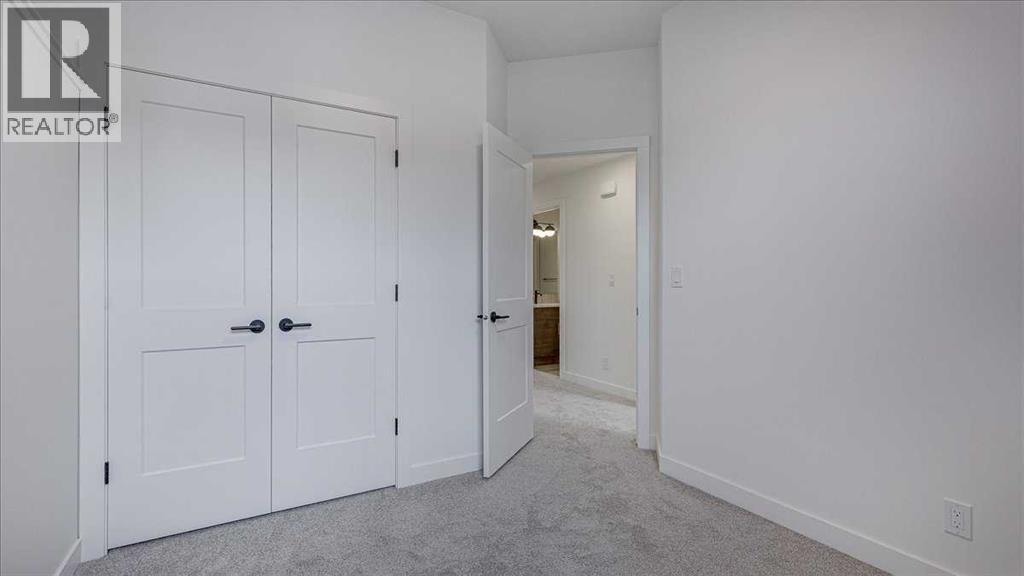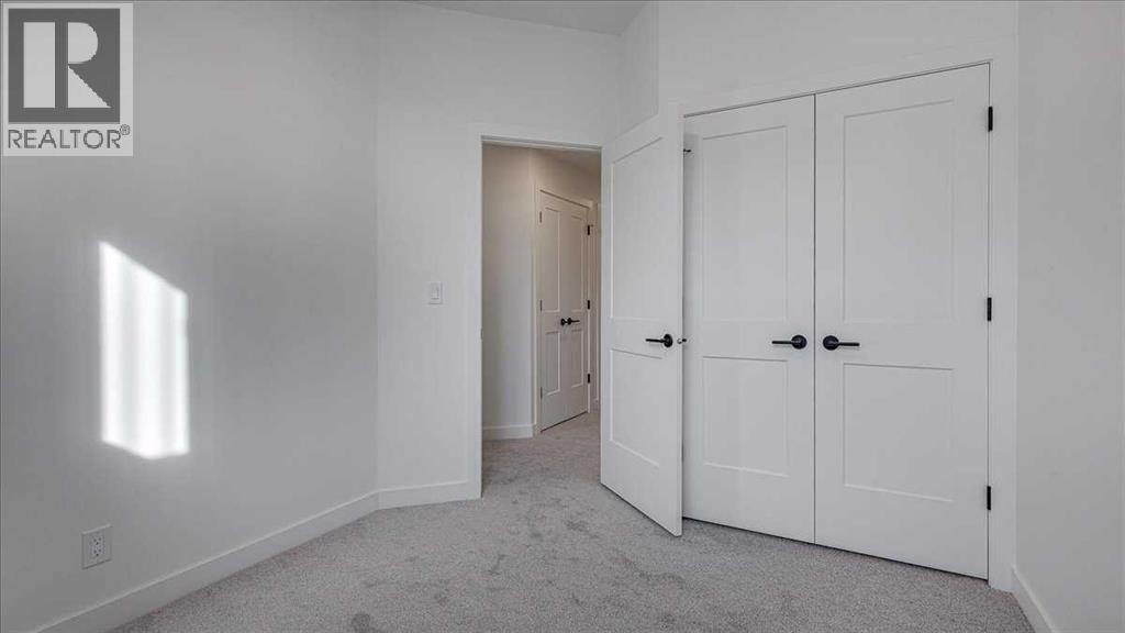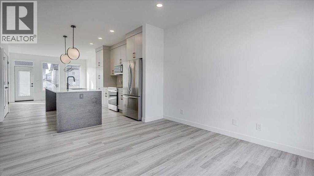 NO CONDO FEES & Great Location! This Brand new, stylish bi-level townhouse has 3 bdrms, 2.5 baths, with 4 appliances, conveniently located in Liberty Landing, close to Costco, restaurants + Highway 2 access. With lovely curb appeal, step into this bright home w/triple pane windows, up the stairs to this open floor plan that features a bright living room & dining room, with a chef's dream kitchen in the middle, with quartz countertops, stainless appliances & double door pantry. This huge island will become the centerpiece for family gatherings, favorite meals & deep conversations. Check out this mud room coming from your south facing backyard, that hides all your shoes & coats from your main area. There is also a convenient flex space outside this 1/2 bath area, perfect for a desk for working @ home, or dog crates or freezer...just imagine what you could use it for! On the lower level, you will find the primary bedroom master with a huge window w/barn door leading to your ensuite & walk in closet. 2 more good sized bdrms, full bath & laundry area fit also neatly on this level. There is also a spacious storage area under the stairs. Front yard will have sod, back yard will have top soil to grade + dividing fence done on the east & west property lines towards the parking area will be completed for you. This south facing backyard is where you will spend your summer evenings & 2 car off street parking off Paved back lane. This unique floor plan will impress with all the natural light & affordable price without being too small! GST included with rebate to builder. Interior pictures are of another unit with the exact floor plan and colors. Proposed possession is April 30/26 (id:63190)