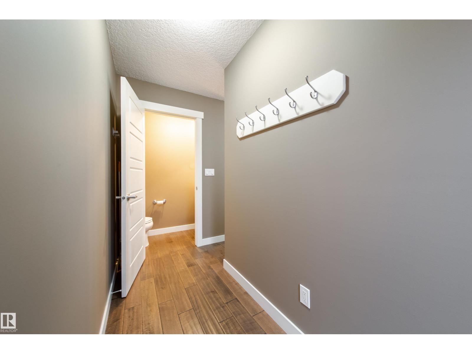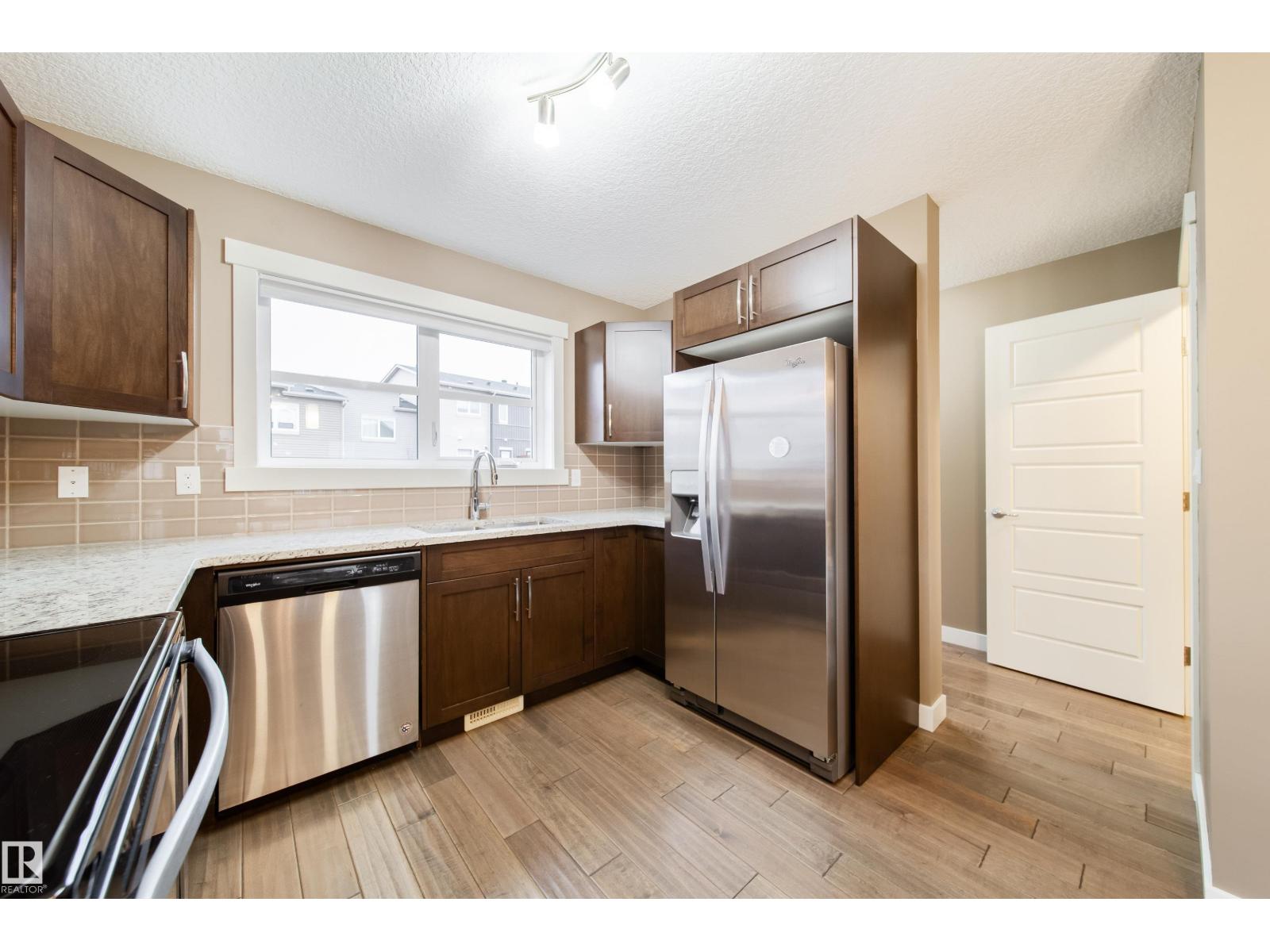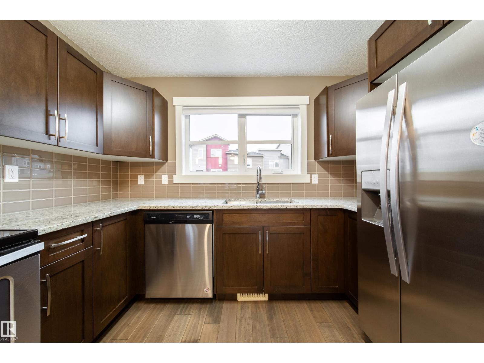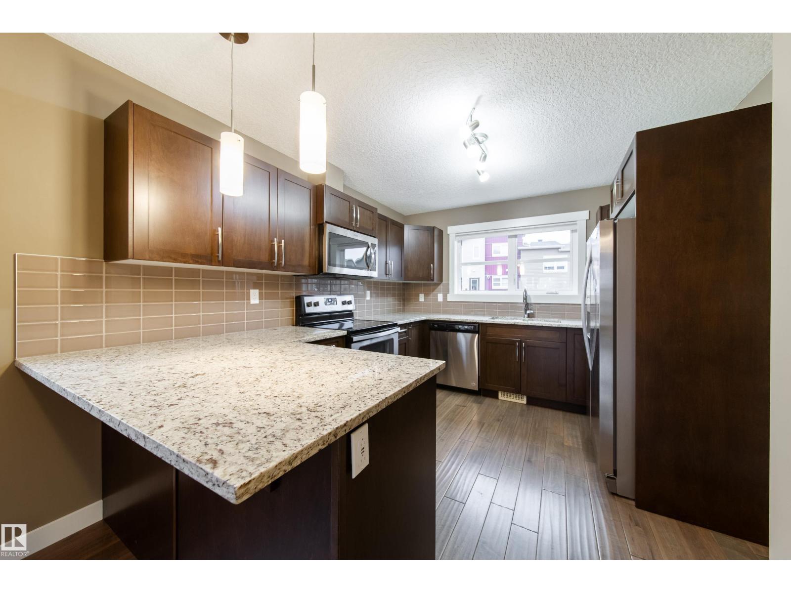 Perfect move in ready townhome in pristine condition. This 2 bed/3 bath END UNIT home is sure to impress! One of the best locations within the complex; in the center away from the busy roads and backing on to the courtyard. Freshly painted, with beautiful engineered hardwood floor on the main floor. Kitchen boasts dark cabinets, granite countertops (including an oversized eating area with room for stools) tiled backsplash and stainless steel appliances. BONUS half bath on main floor which many dont have. Upstairs features 2 large bedrooms, each with their own 4 pc ensuite and walk in closet. Laundry is also upstairs next to the bedrooms. Nice private deck out the back perfect for relaxing and enjoying the tranquility of the courtyard behind. OVERSIZED garage includes extra storage area in the furnace room as well as a little flex space for an extra work area. Plenty of visitor parking. Great location close to transit, highway 2 & 2A and the Edmonton International Airport. Immediate possession available. (id:63190)
