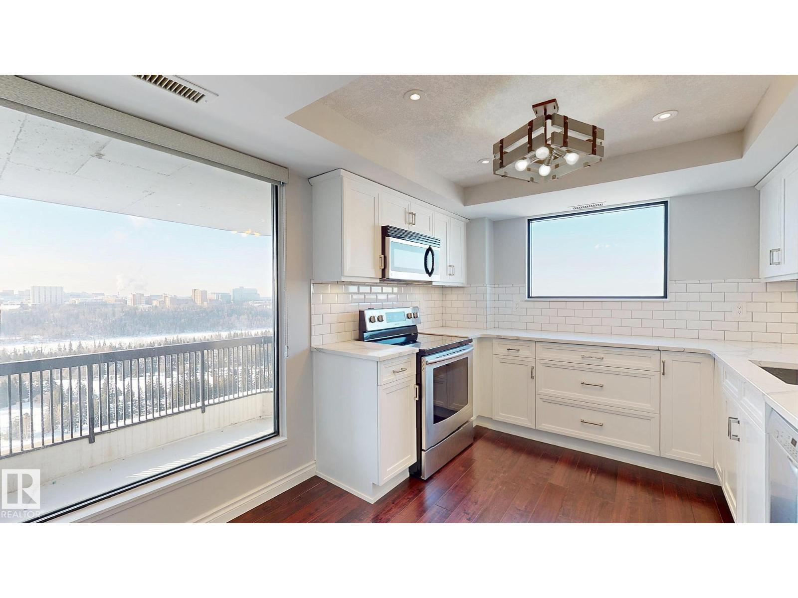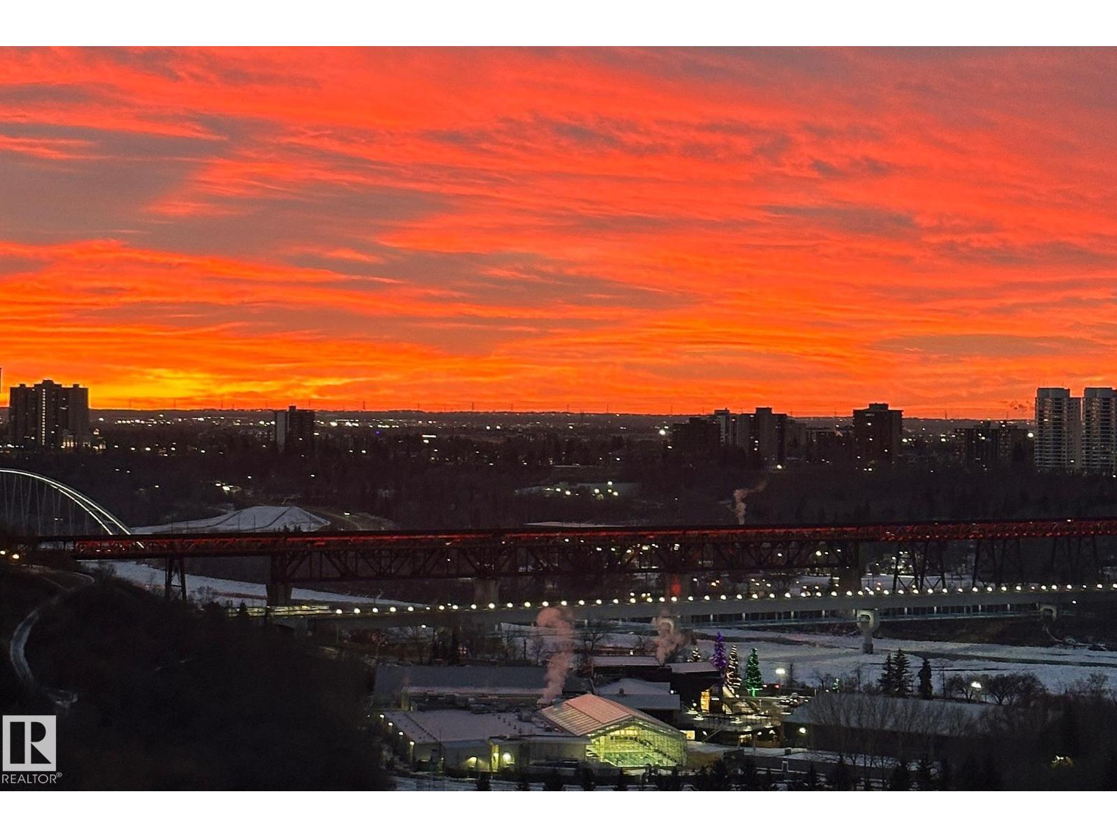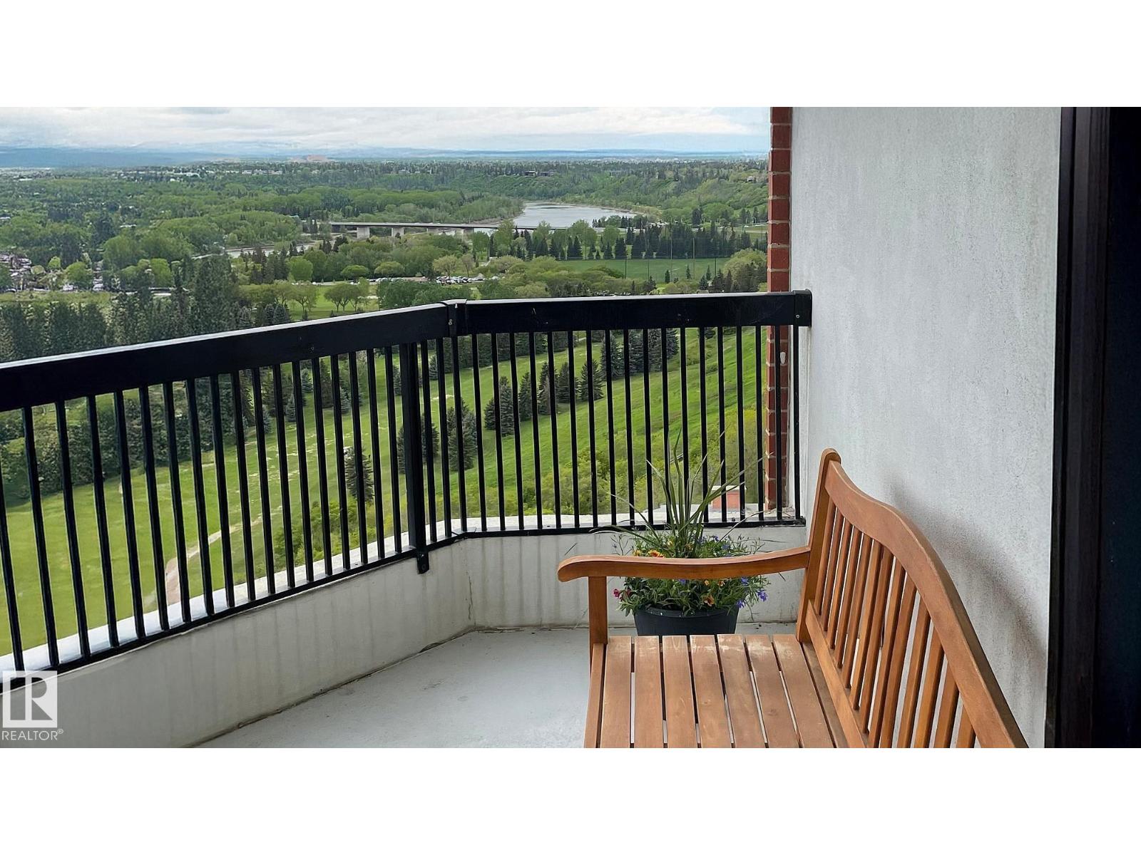 UNOBSTRUCTED SOUTH RIVER VALLEY VIEWS from this gorgeous 15th floor suite and its 2 balconies in the iconic LeMarchand Tower. Relax and enjoy the River Valley views year round. This beautiful 1,308 sq. foot condo features 2 bedrooms, 2 bathrooms & 1 underground heated parking stall. Raised dining area will accommodate your Family and friends. Your gourmet kitchen comes with stainless steel appliances, undermount sink, 2 person eating bar, quartz countertops, tile backsplash and unfettered views to the West. The sunken living room, with its engineered flooring, is the perfect place to unwind and enjoy the natural light and spectacular Riverscape. Step out to your private balcony where you can view vistas to the West, South and East. The Primary bedroom features its own private balcony, walk thru closet & luxurious 5 piece ensuite. The second bedroom is large with 2 closets, hardwood flooring & Valley views. Insuite laundry room plus a 3 piece bath. Steps from the Victoria Gold Course & River Valley trails (id:63190)