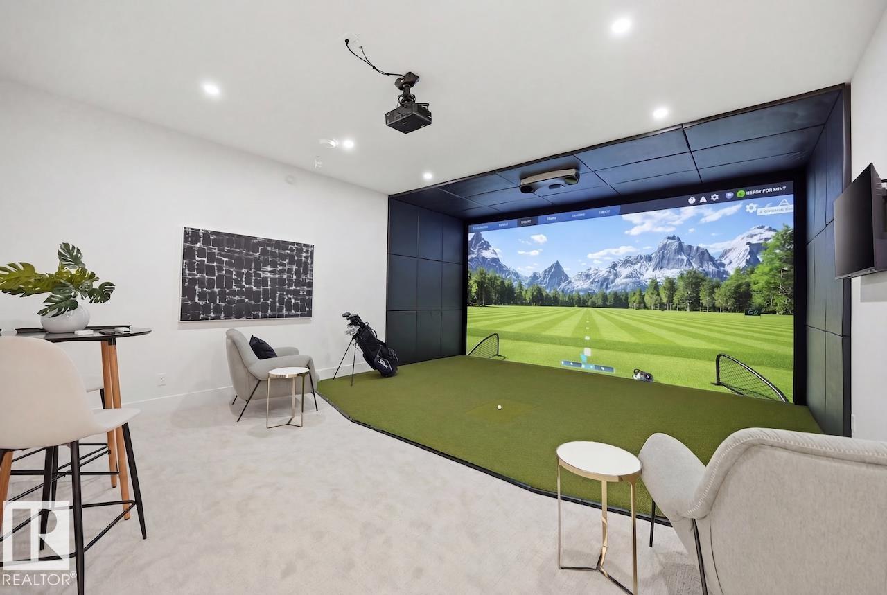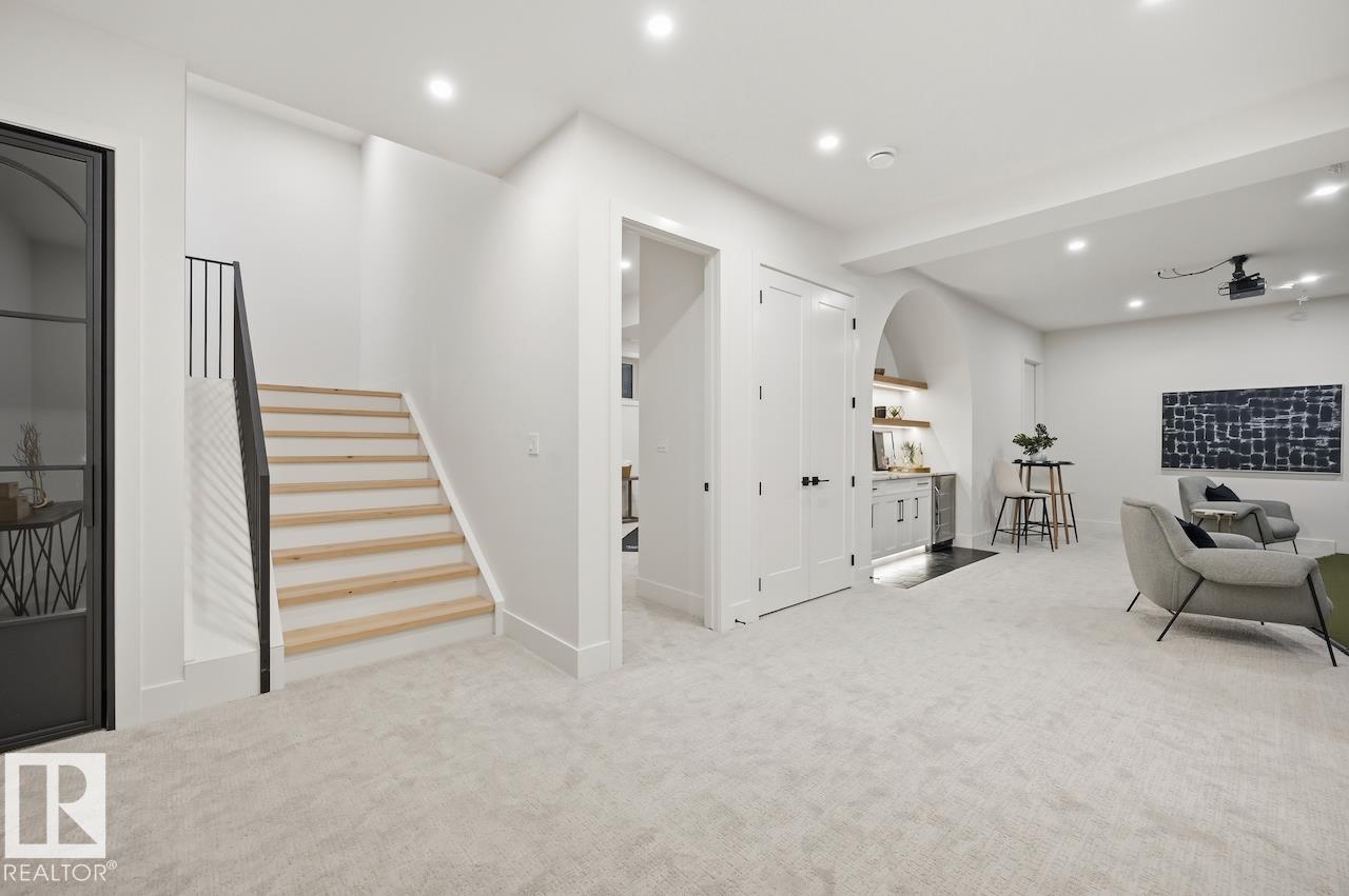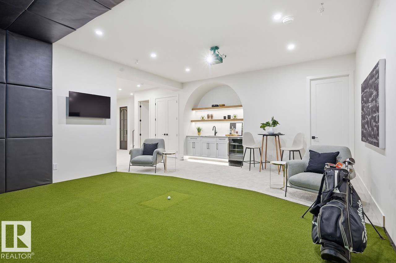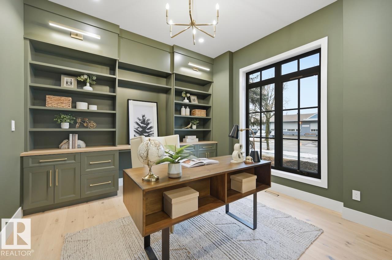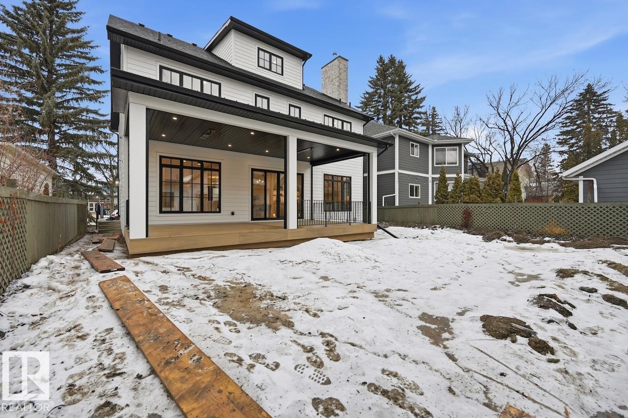 LUXURY 2.5 STOREY HOME WITH 10FT MAIN FLOOR, 10FT BASEMENT CEILINGS & OVERSIZED QUAD DETACHED HEATED GARAGE IN GLENORA! This one of a kind home is a true must see! The main floor features a grand herringbone foyer, large office with custom shelving and cabinets, designer half bath, side mudroom entrance with loads of storage, huge chefs kitchen, coffee bar, WOOD BURNING FIREPLACE and so much more! The 2nd floor features 3 Beds 2 Baths and upstairs laundry room, including the large primary bedroom with a spa like 5pc ensuite (steam shower & soaker tub) and double walk-in closets! The 3rd floor features a bonus room, wet bar, half bath as well as the west facing roof top patio! The basement showcases a golf & game sim media room with 4k projector, wine cellar, 2 large bedrooms, 5pc bath, and 2nd wet bar! Outside enjoy the massive covered 3 season deck with recessed heaters & motorized screens as well as fenced/landscaped yard included. Short walk to spray park, playgrounds, shops, ODR and so much more! (id:63190)