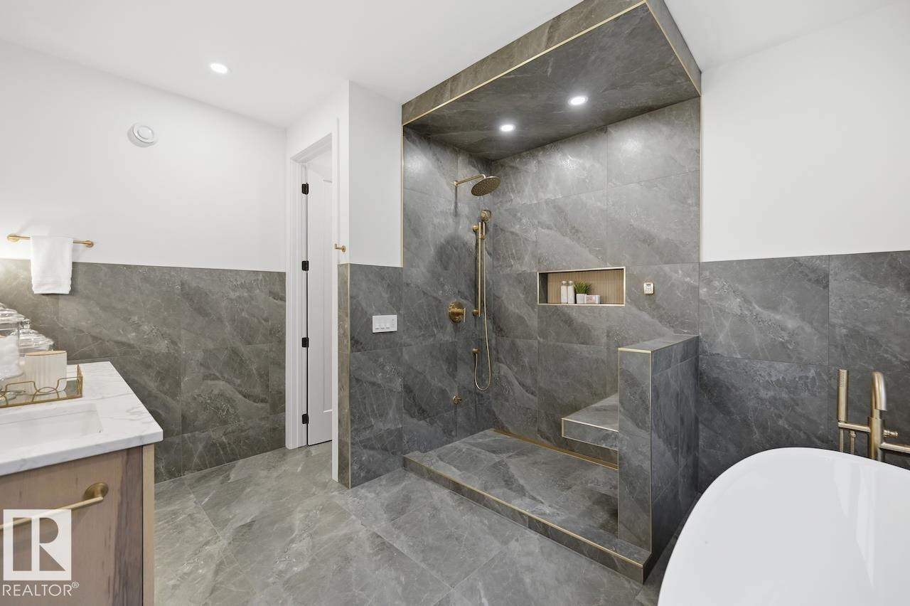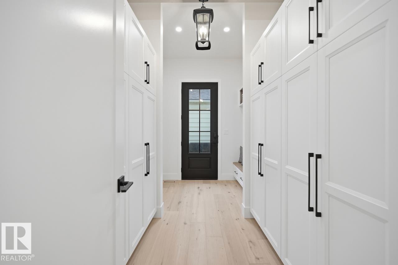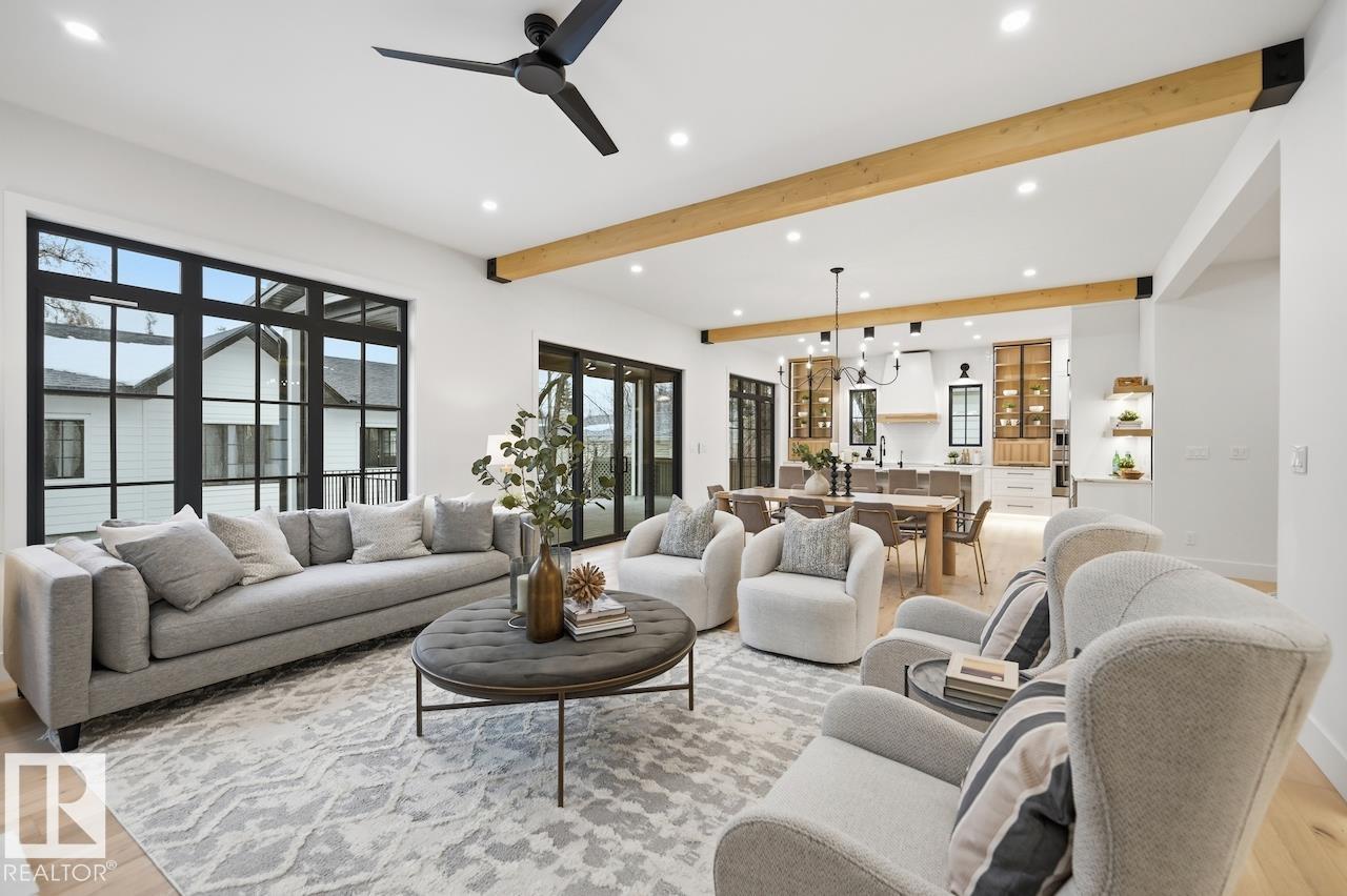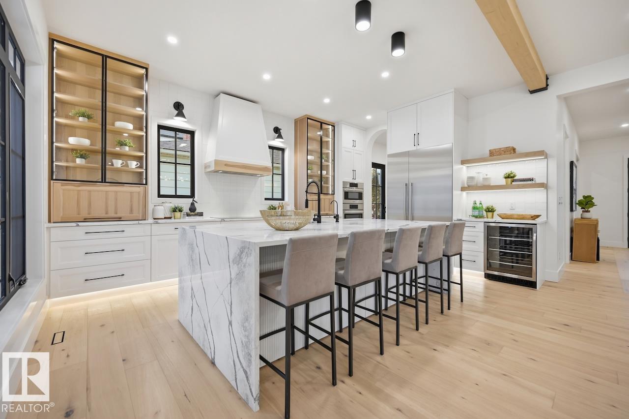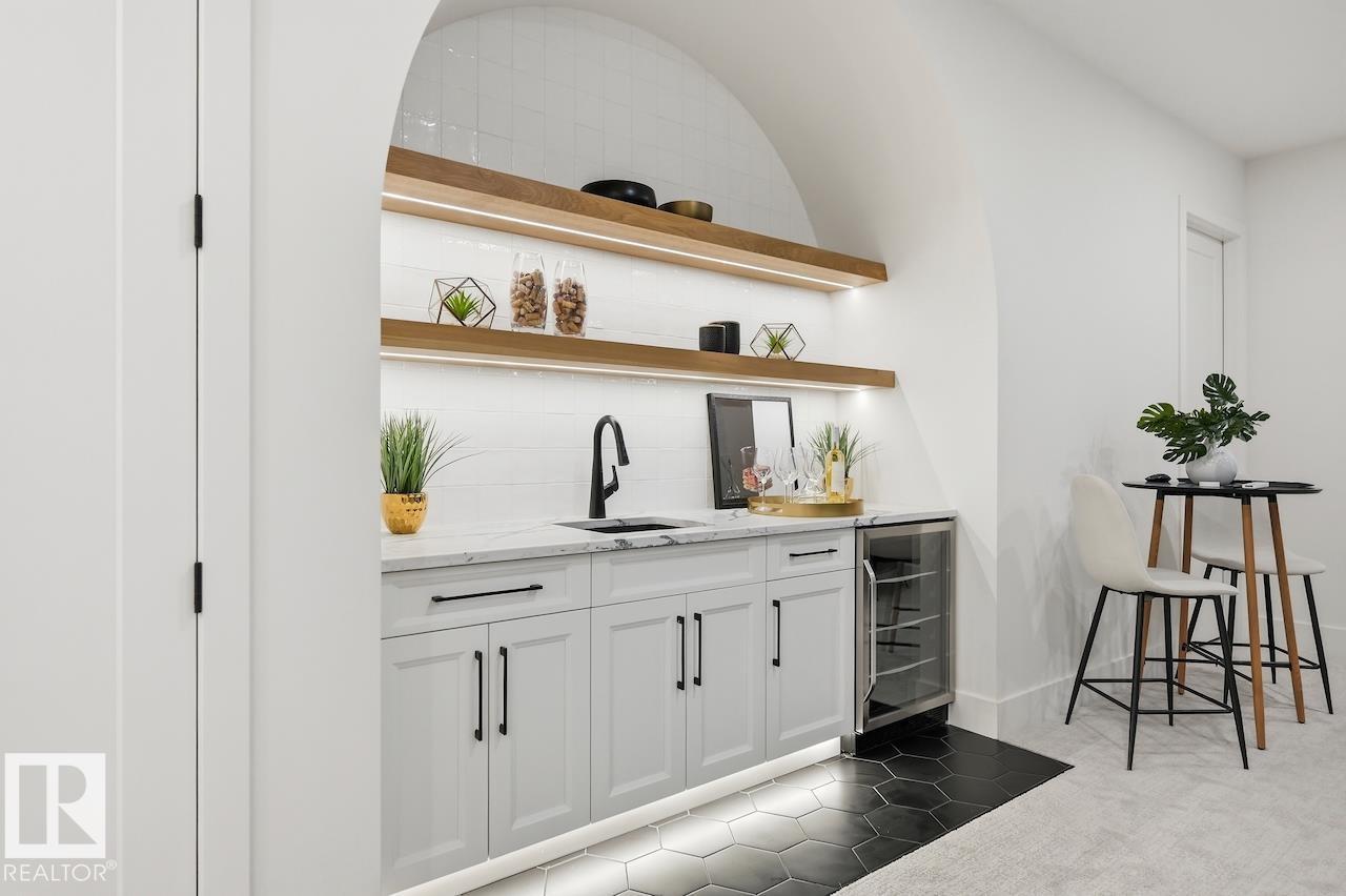 LUXURY 2.5 STOREY HOME WITH 10FT MAIN FLOOR, 10FT BASEMENT CEILINGS & OVERSIZED QUAD DETACHED HEATED GARAGE IN GLENORA! This one of a kind home is a true must see! The main floor features a grand herringbone foyer, large office with custom shelving and cabinets, designer half bath, side mudroom entrance with loads of storage, huge chefs kitchen, coffee bar, WOOD BURNING FIREPLACE and so much more! The 2nd floor features 3 Beds 2 Baths and upstairs laundry room, including the large primary bedroom with a spa like 5pc ensuite (steam shower & soaker tub) and double walk-in closets! The 3rd floor features a bonus room, wet bar, half bath as well as the west facing roof top patio! The basement showcases a golf & game sim media room with 4k projector, wine cellar, 2 large bedrooms, 5pc bath, and 2nd wet bar! Outside enjoy the massive covered 3 season deck with recessed heaters & motorized screens as well as fenced/landscaped yard included. Short walk to spray park, playgrounds, shops, ODR and so much more! (id:63190)