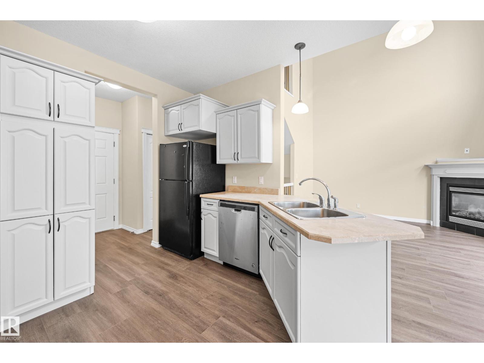This WELL KEPT 2 storey townhome located in a quiet CUL-DE-SAC. Main floor features HIGH CEILINGS open to below n the living room with gas fireplace. White kitchen cabinets looking over the DINING room. Upper floor offering a good sized masters room with VAULTED ceiling and 3 piece en-suite. Two more nice sized bedrooms and 4 piece full bath on the upper floor as well. Basement fully finished with FAMILY room and WETBAR. Brand New HE VINYL PLANK flooring throughout the main and upper floor. New painting for the whole property. It comes with double attached garage. Walking distance to PUBLIC TRANSIT, SHOPPING. Close to SCHOOLS, PARK and all amenities. Easy access to LRT station, SOUTH COMMON, ANTHONY HENDAY freeway. (id:63190)
