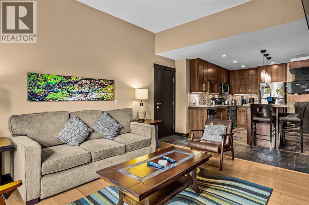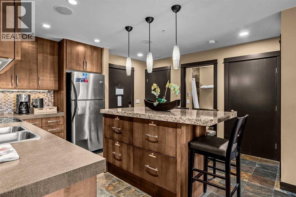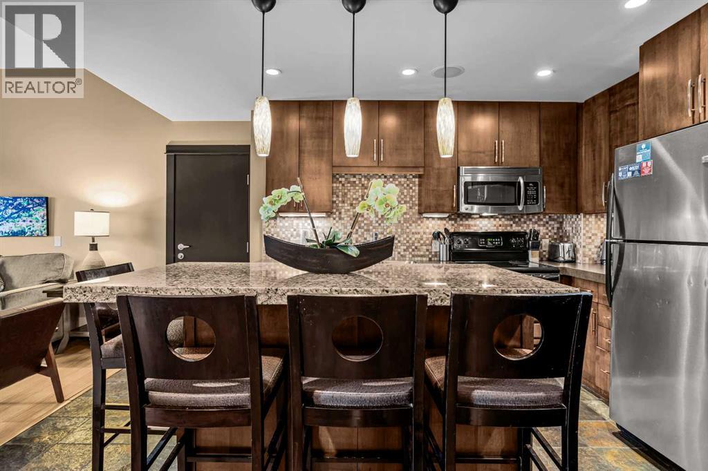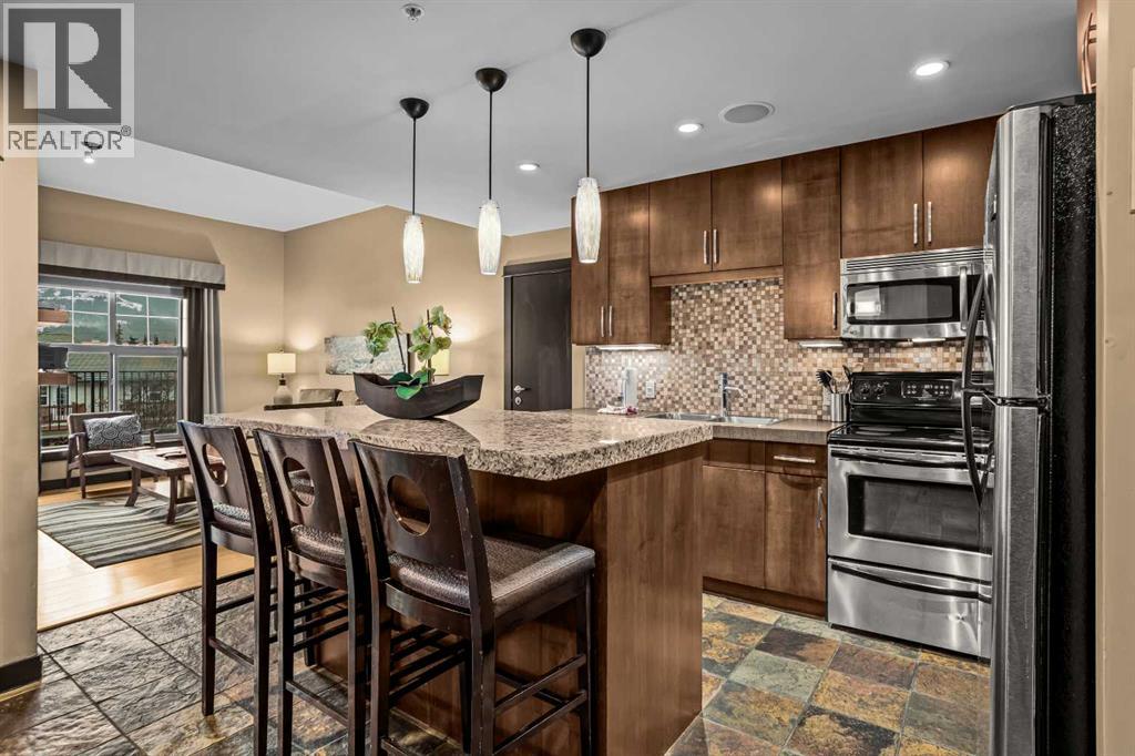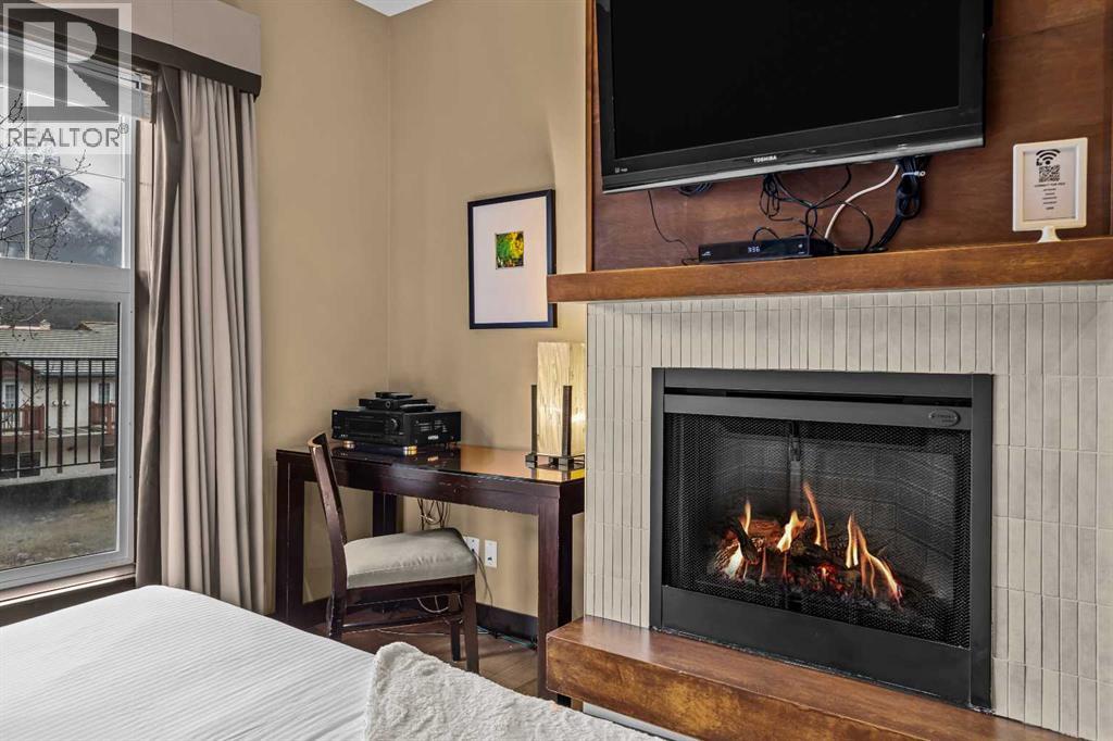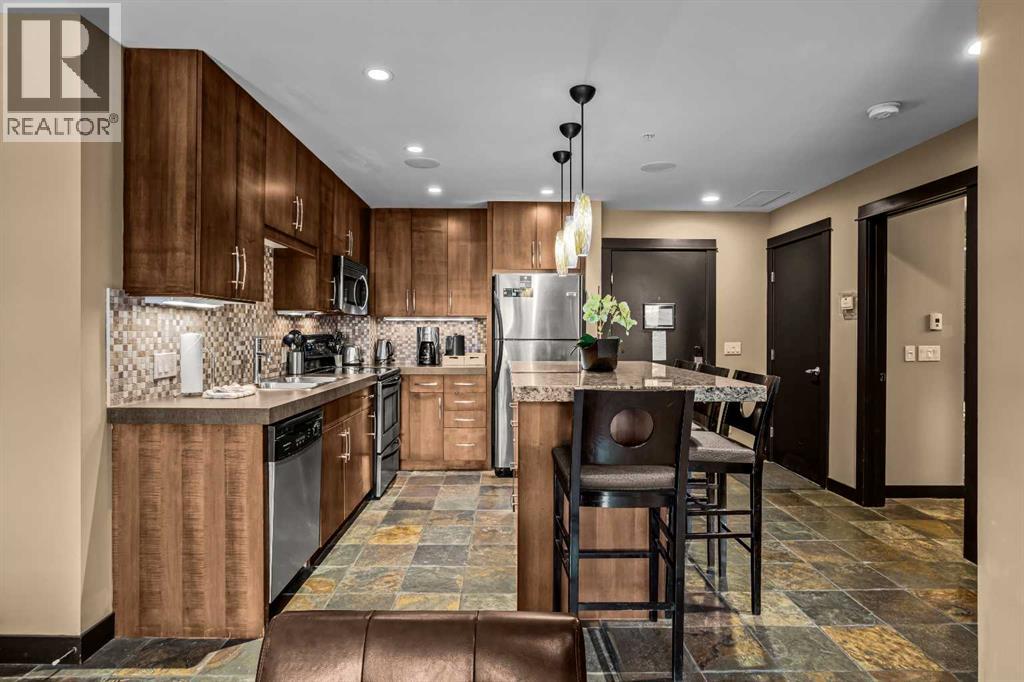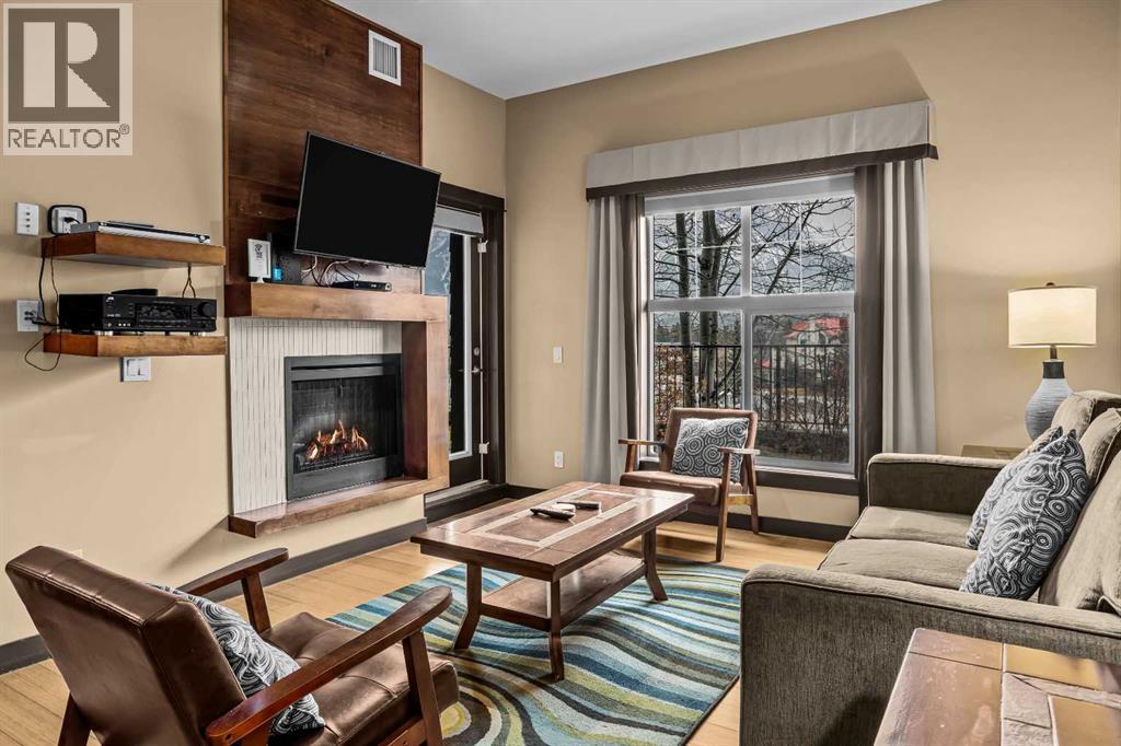106 Rotation D -1818 Mountain Ave | Silver Creek Lodge. 12 weeks per yearYour Canmore Ownership at a Fraction of the Price. Well-positioned in Silver Creek Lodge, this 2-bedroom lock-off unit offers flexibility, functionality, and one of the most sought-after features in the building—ground floor access with pet-friendly convenience.This layout is ideal for both personal use and revenue generation, with a self-contained lock-off configuration that allows for separate rental of each side. Inside, the unit features a warm and inviting mountain aesthetic with stone countertops, stainless steel appliances, and a cozy fireplace, creating a comfortable space for guests and owners alike.What truly sets this unit apart is its direct walk-out to green space, providing easy outdoor access for pets and eliminating the need for elevators or common hallways—an increasingly desirable feature for both short-term guests and long-term stays.Silver Creek Lodge amenities include a fitness area, steam room, and outdoor hot tub, enhancing the overall guest experience and supporting strong rental appeal.Ground floor, lock-off, pet-friendly units are among the most desirable and limited opportunities in the building—making this a smart choice for investors and lifestyle buyers alike. (id:63190)