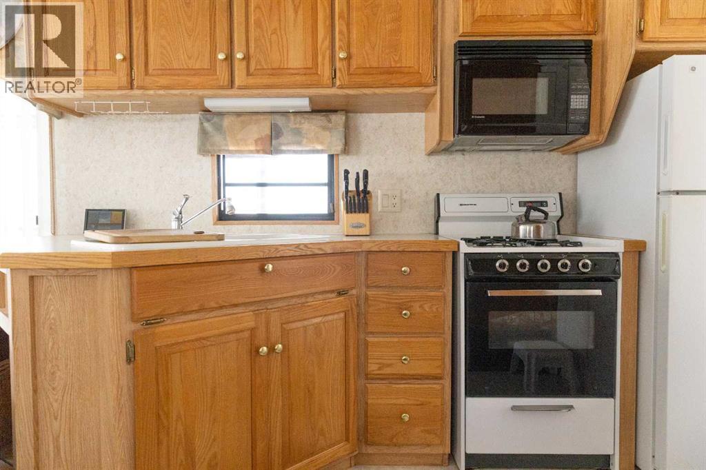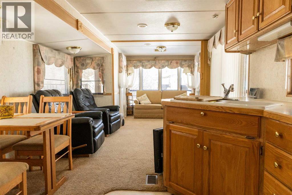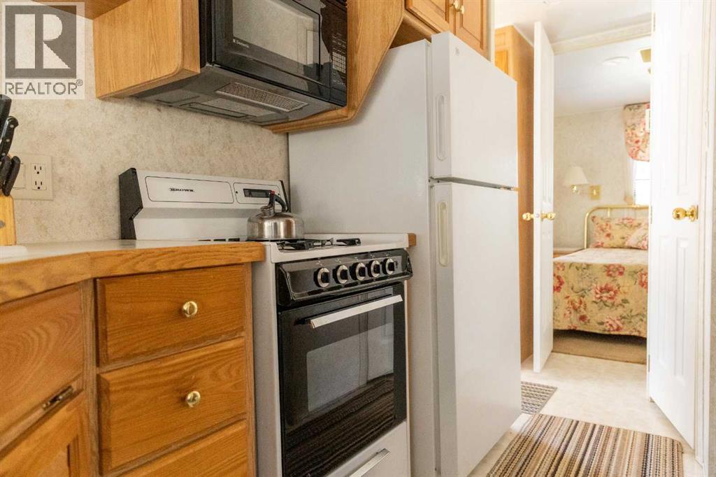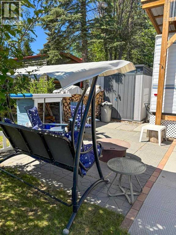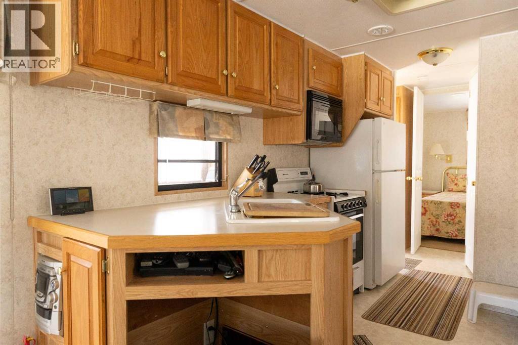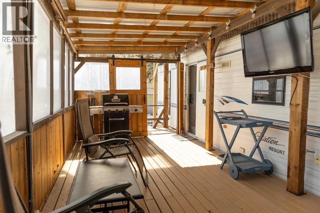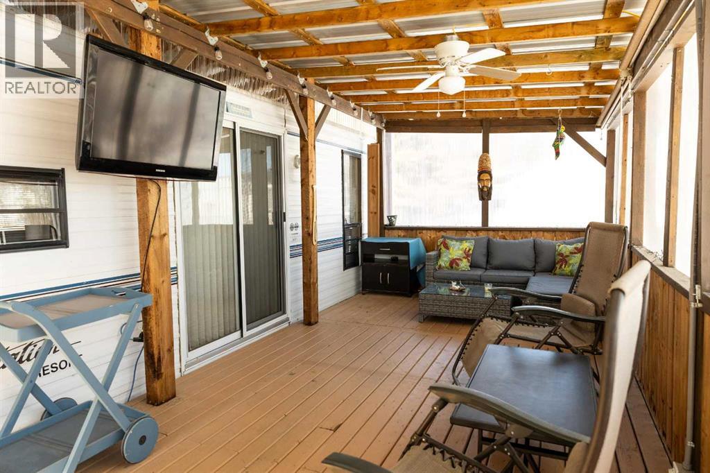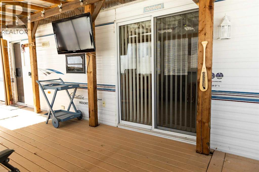 Lakeside, along the quiet edges of RV Heaven, find your tranquil summer retreat. Convenience meets full relaxation here featuring lake views, close proximity to the marina, low maintenance yard with private fire pit and spacious covered deck! The white vinyl picket fence welcomes your small family pet or young children. Outdoor hot and cold taps make coming off the beach a breeze. Landscaping shrubs and lilac trees create a breath of fresh air while you enjoy the sunshine or cozy up to the fire as the sun sets. Summer memories continue as you walk up to the deck and make it your own. Easily open up the sides to take in the lake view or keep enclosed, turn on those patio lights and listen to nature under the tin roof. The roof covering extends over the 38’ Citation Resort Park Model (2003 Den Model) by General Coach, boasting peace of mind from the elements and minimum upkeep. Settle in or just cool off with the A/C inside; this tiny home greets you with a very functionable floor plan. Easy access to the 4 piece bathroom near the main bedroom with HUGE closet, open concept living room and dining area, fully equipped kitchen and plenty of natural light. The best part? A bonus area that can be used for extra comfortable seating while entertaining or – pull back the privacy divider and conveniently add a second sleeping area with the quality hide-a-bed. Forgot something? Feeling social? Walk across to Jorgy’s Hot Spot and take in their licensed patio, community events, recreation offerings and convenience store! Walking trails, playgrounds, nature reserve, outdoor gym, sandy beach and Gull Lake Golf Course are all within reach, boutique shopping in Bentley and Rimbey are only minutes away and your new lake life could be only one call away!Condo amenities include playground, visitor parking, shower house, water and sewer. Power is on your own meter and billed by the condo board annually. Park is open seasonally (approx. May 1-Sept 30 depending on frost). Well kept! Orig inal owners! Turn key! All goods included! (id:63190)