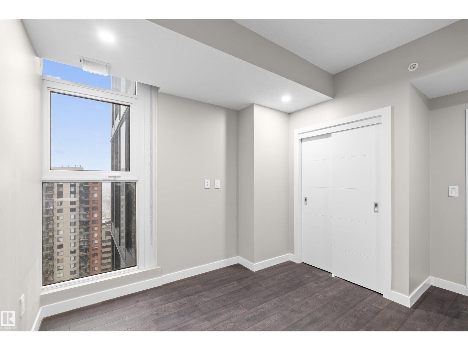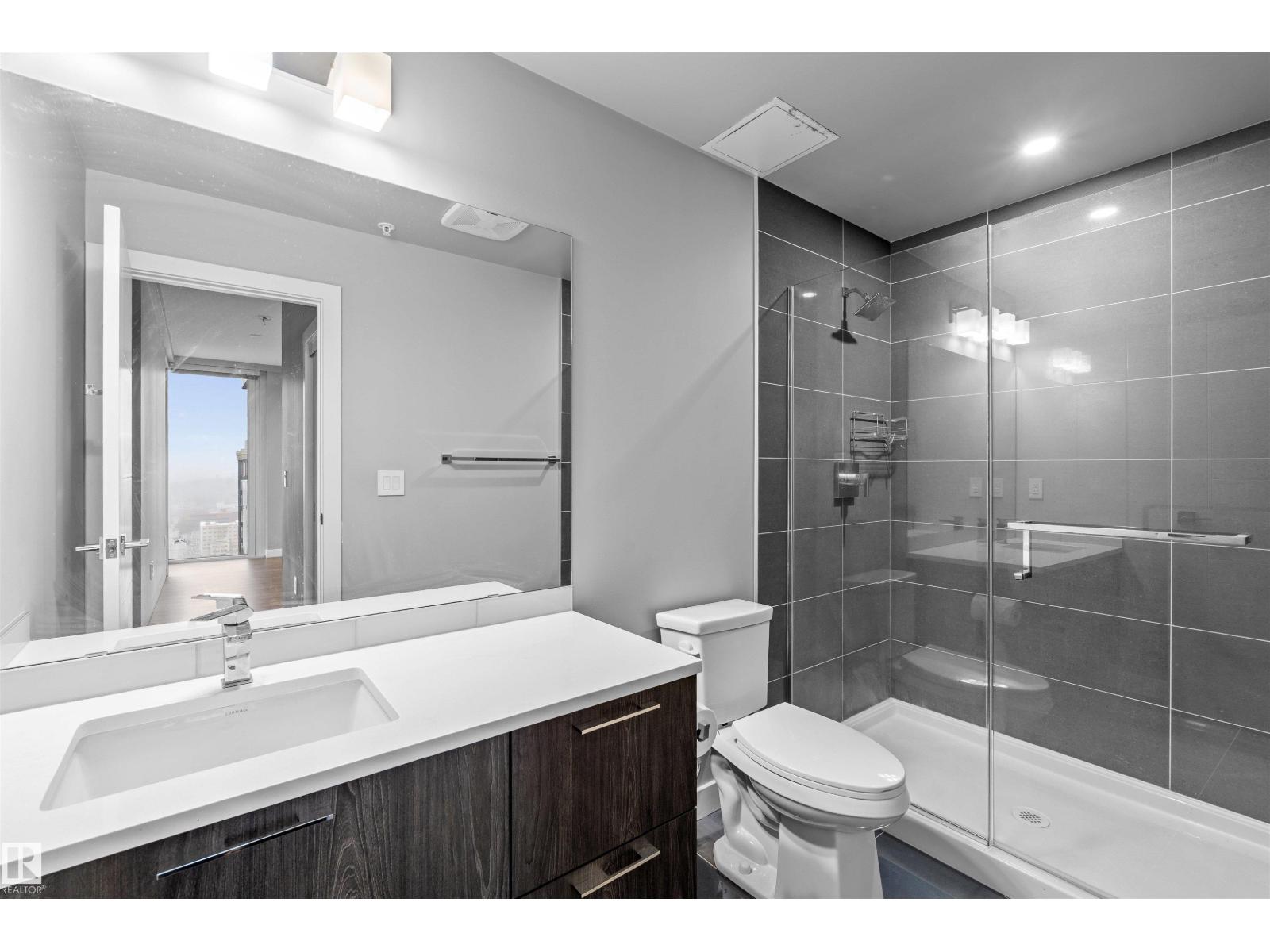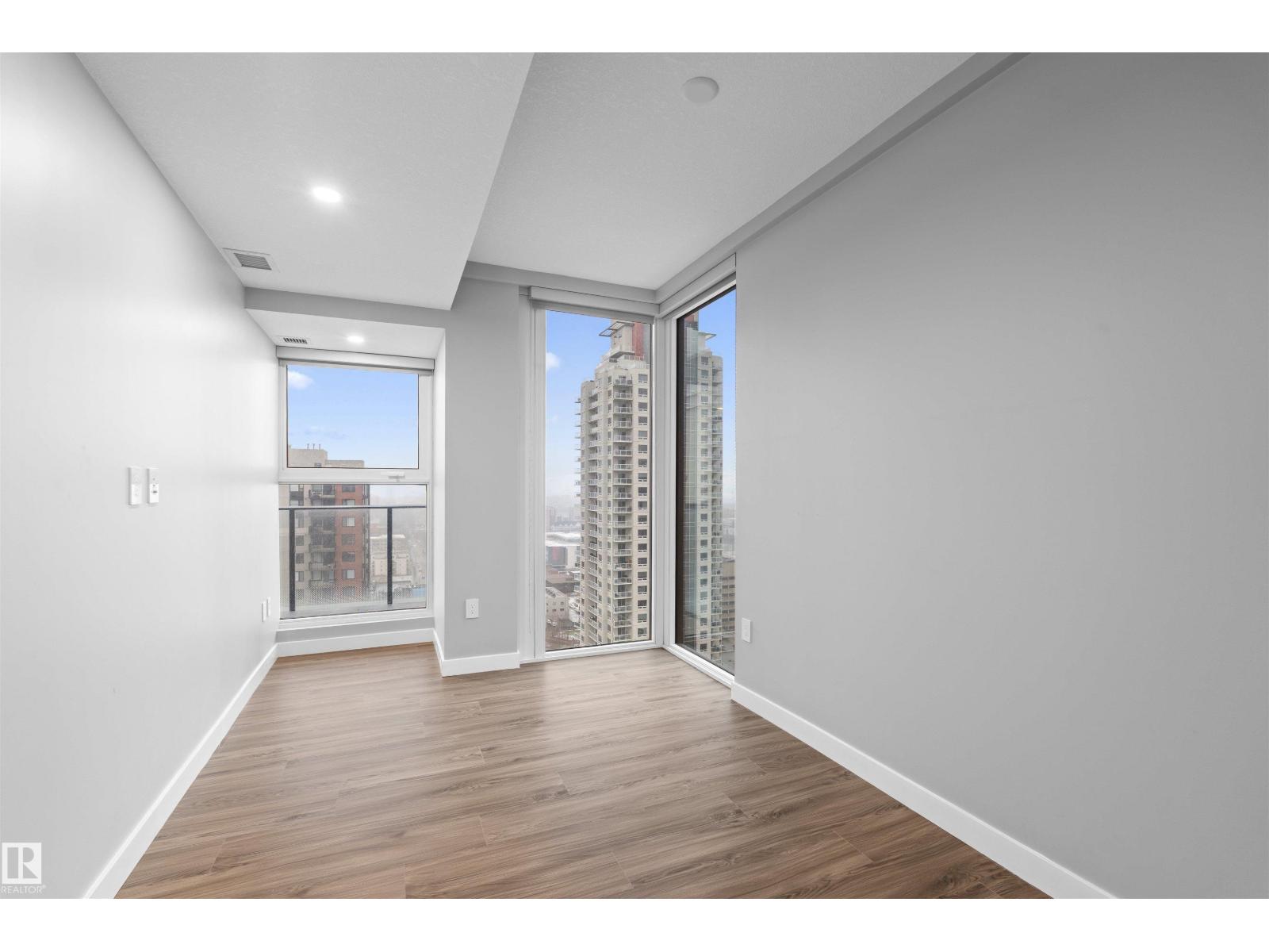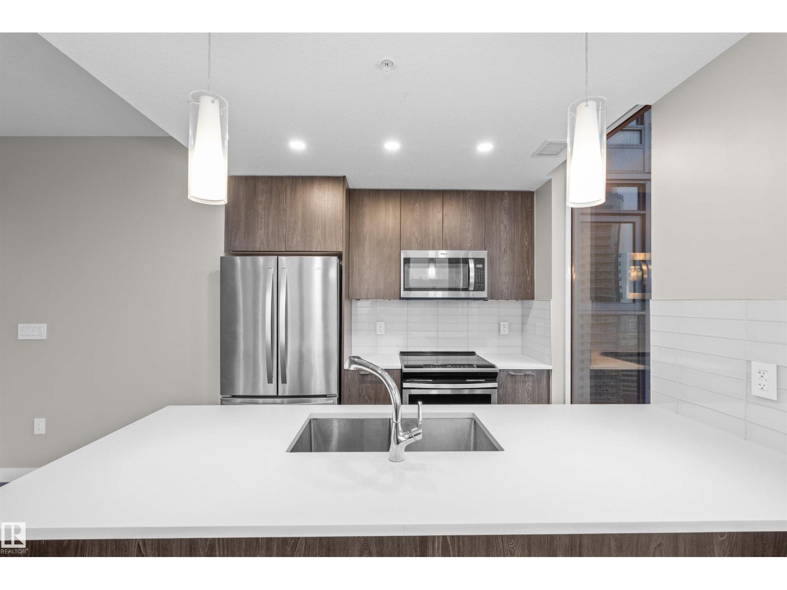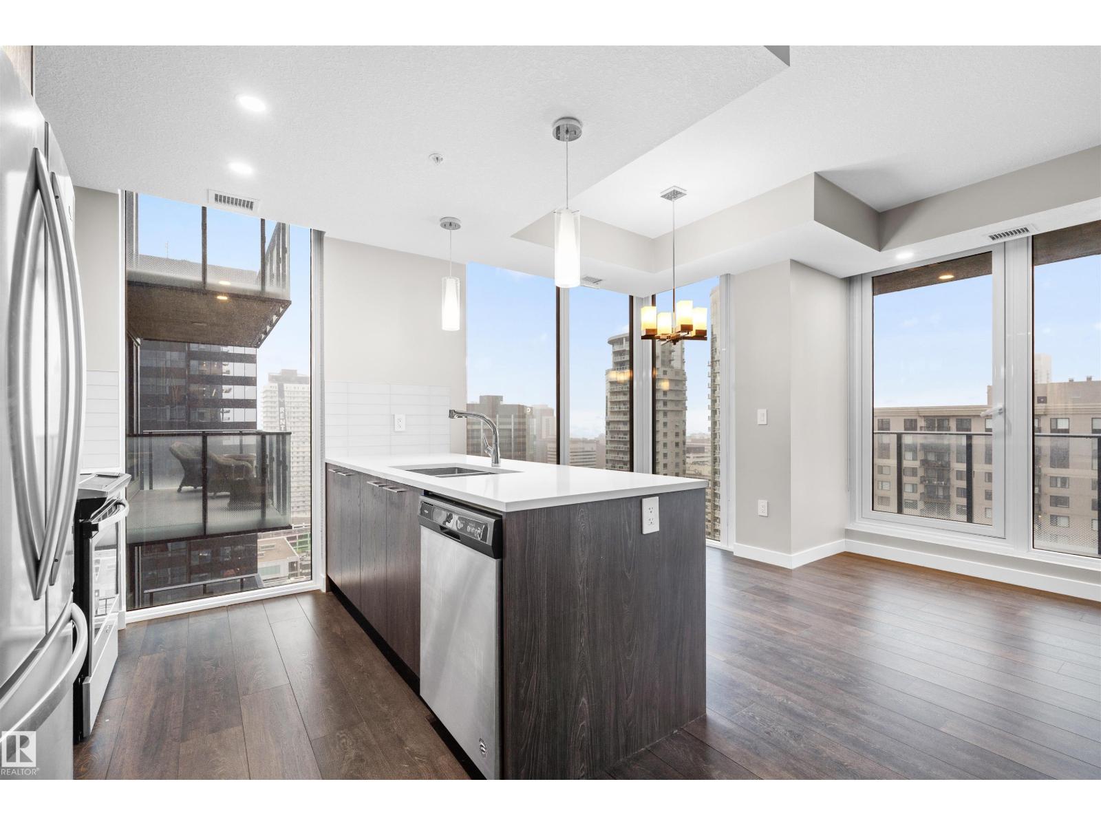 Luxury living in the heart of downtown Edmonton .This stunning 2-beds, 2-baths condo offers the perfect blend of modern sophistication and urban convenience.Step inside to discover a thoughtfully designed open-concept layout featuring floor-to-ceiling windows that flood the space with natural light and showcase breathtaking city views. The contemporary kitchen is beautifully appointed with sleek cabinetry, quartz countertops, and premium stainless steel appliances.The spacious primary bedroom offers a private retreat, complete with a beautifully finished ensuite, while the second bedroom and full bathroom provide flexibility for guests or a home office. Enjoy the private balcony with a 20 foot span. Encore Tower provides exceptional amenities, including a state-of-the-art fitness centre, social lounge, and a relaxing hot tub area. Located just steps from Rogers Place, the ICE District, restaurants, shopping, and LRT access, this is urban living at its finest. (id:63190)