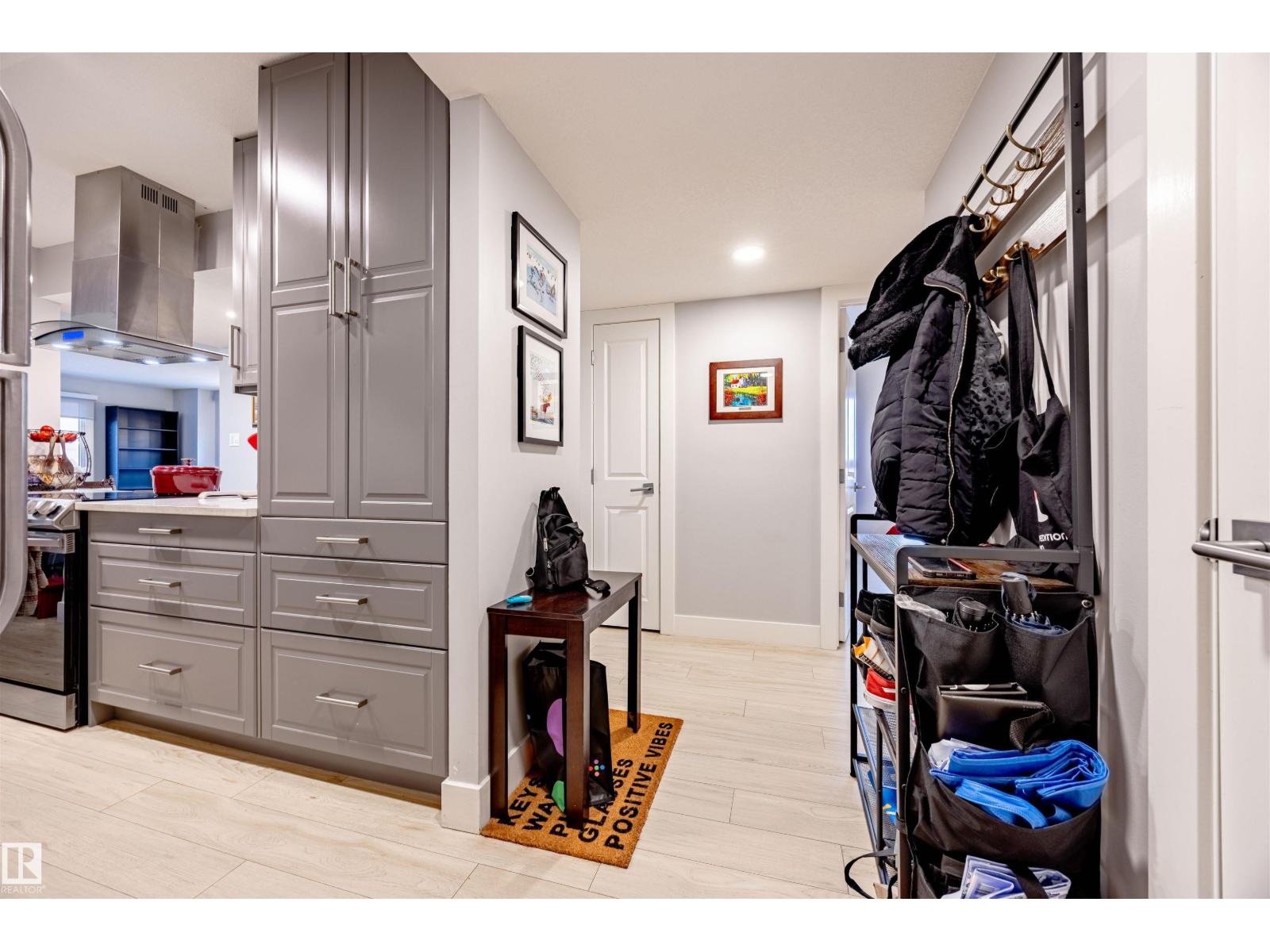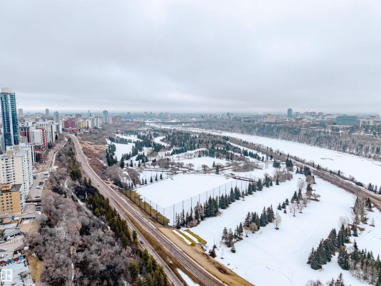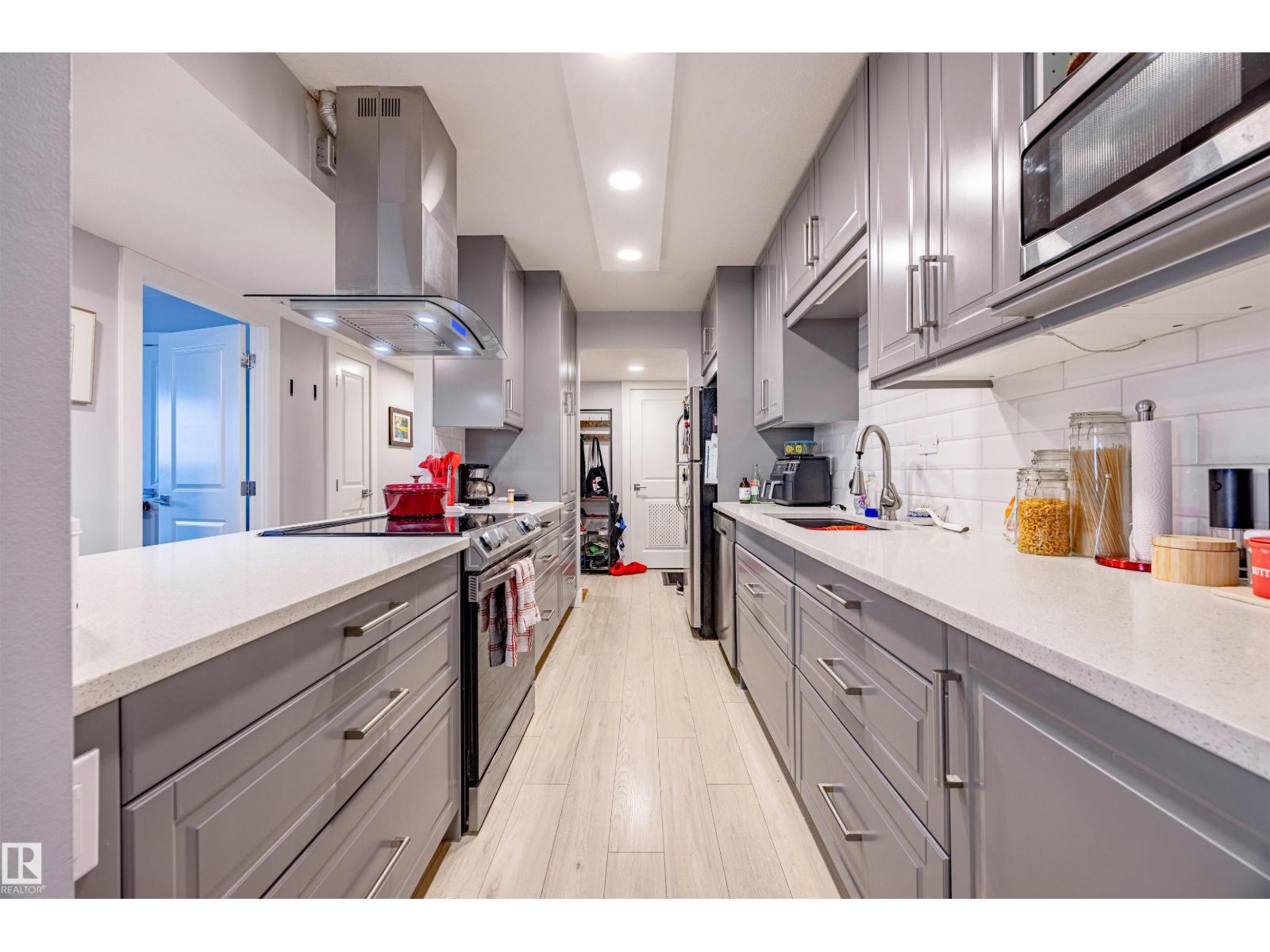 BEAUTIFULLY RENOVATED from top to bottom with RIVER VALLEY views, this 2 bed + 1 bath CORNER UNIT is sure to impress. Step inside and be WOWED by an abundance of NATURAL light, neutral colors and inviting decor! Kitchen is STUNNING with grey cabinetry, white QUARTZ counters, SS appliances with ceiling hood range, under mount sink and more. Large windows and light oak laminate floors grace this ideal living space, along with dining area large enough for 6 + AMAZING electric window coverings. Enjoy covered balcony overlooking the River Valley and 5th hole of Victoria Golf Course. Master bedroom is HUGE with large closet space, office area and views of downtown. Great sized second bedroom overlooks 124 st. Main bath is DIALLED with lifted sink, tile surround bath and rain shower head. Storage in-suite, 1 heated underground parking stall, workshop, car wash, rec facility, social room, SCENIC common area patio and more. A true must see unit! (id:63190)