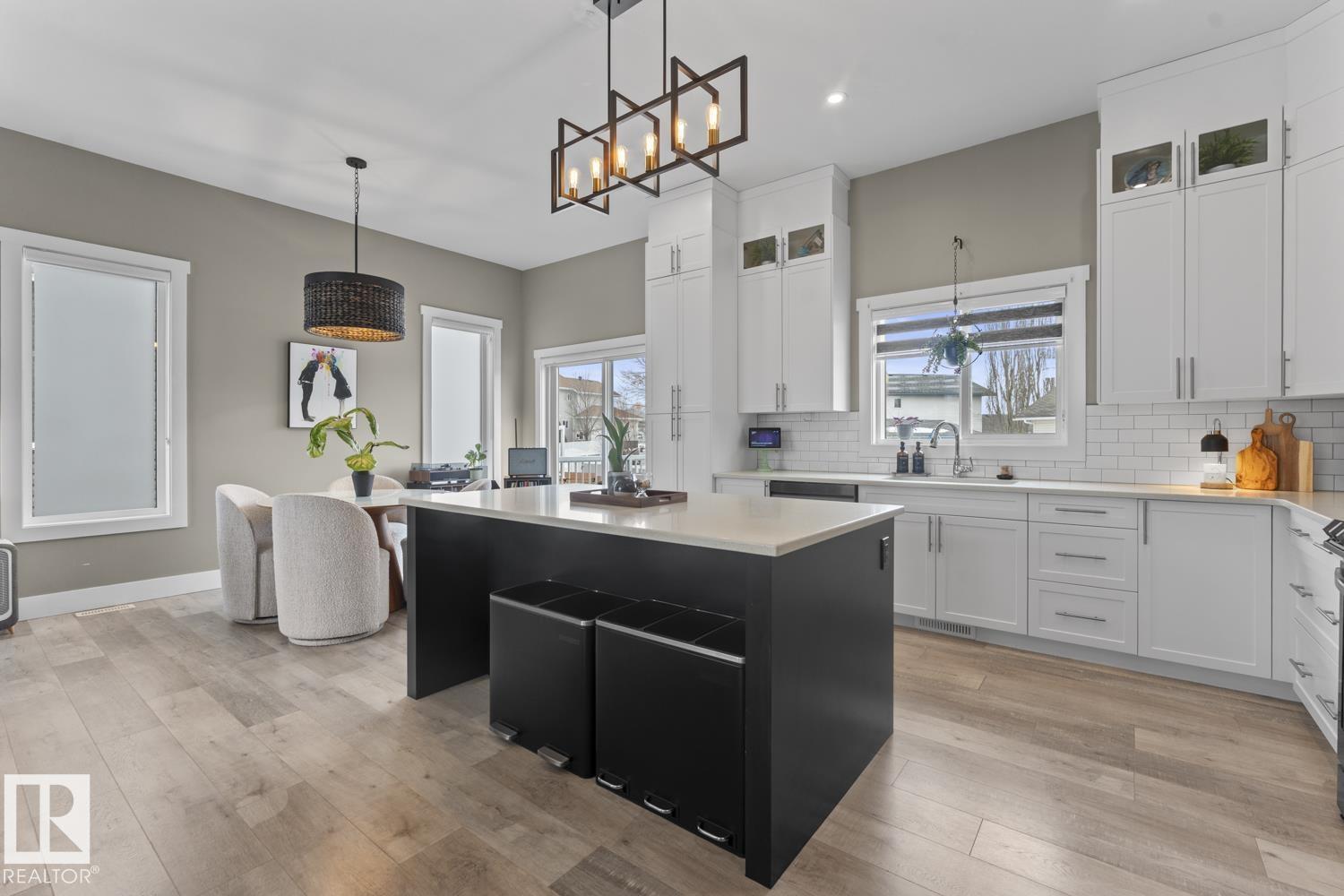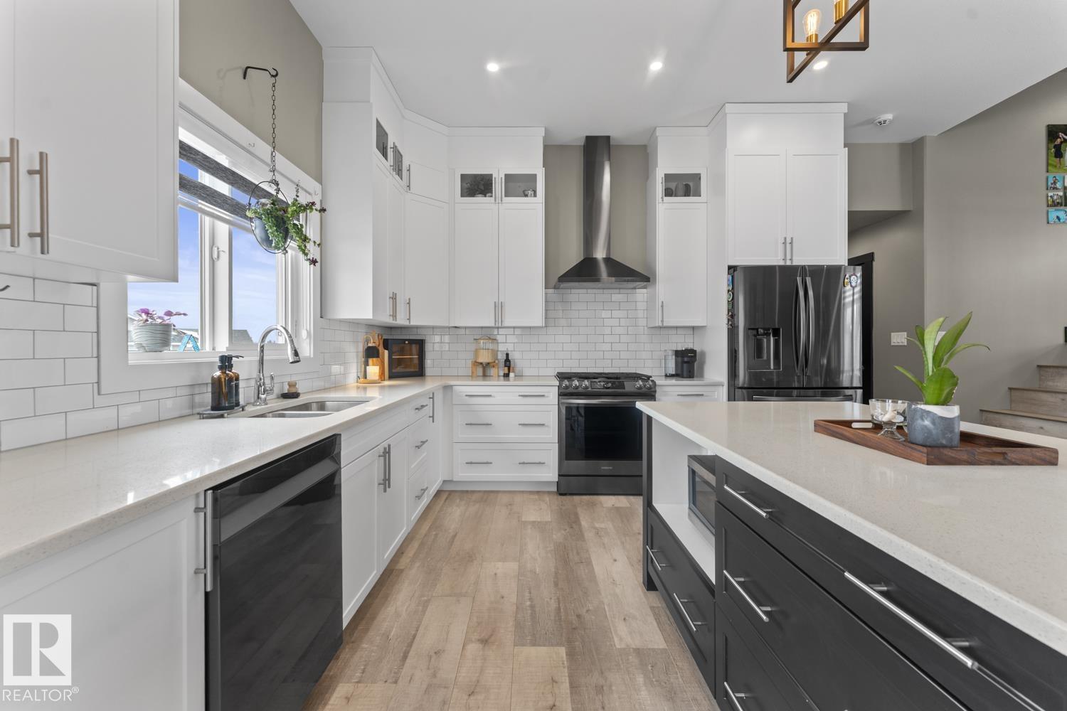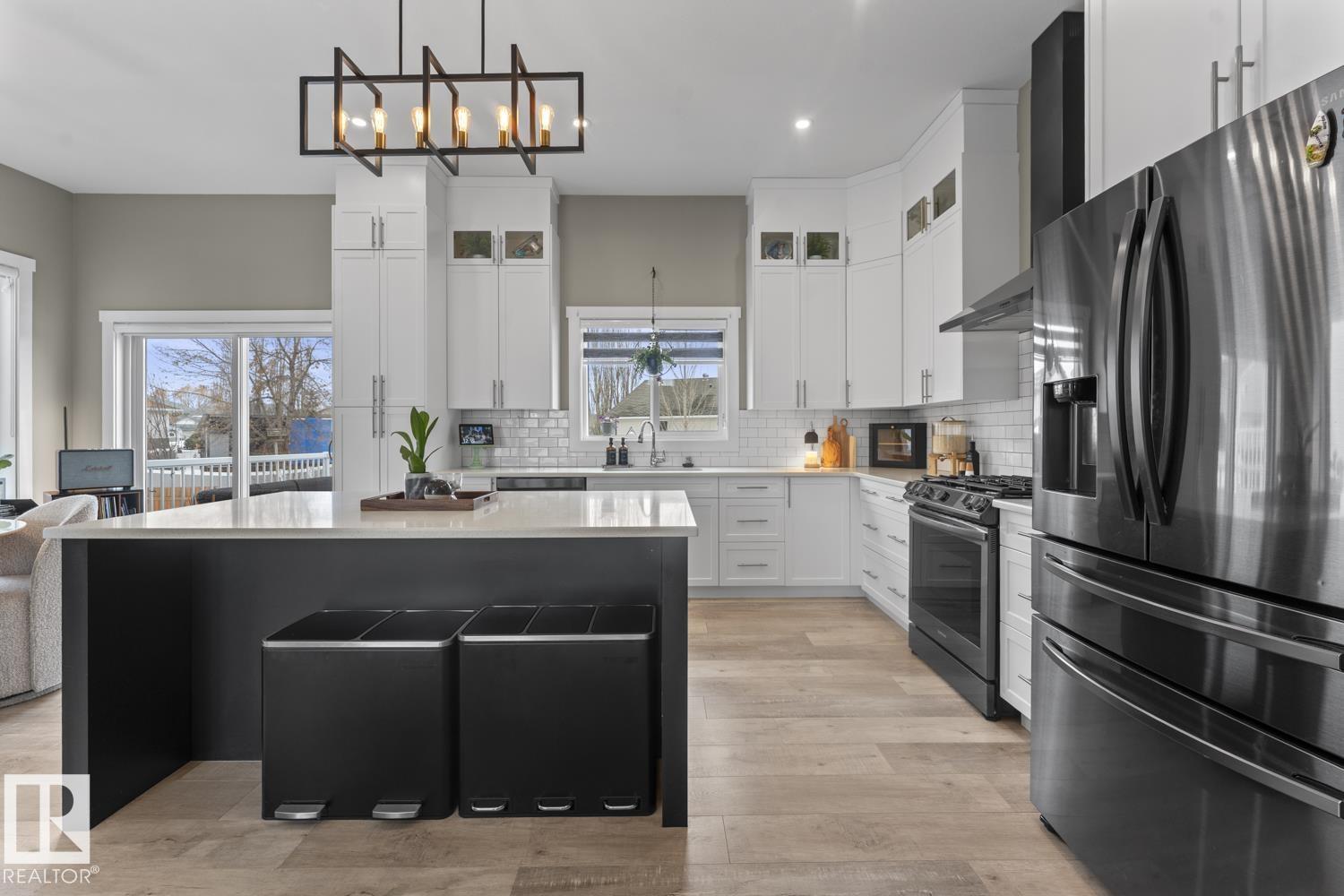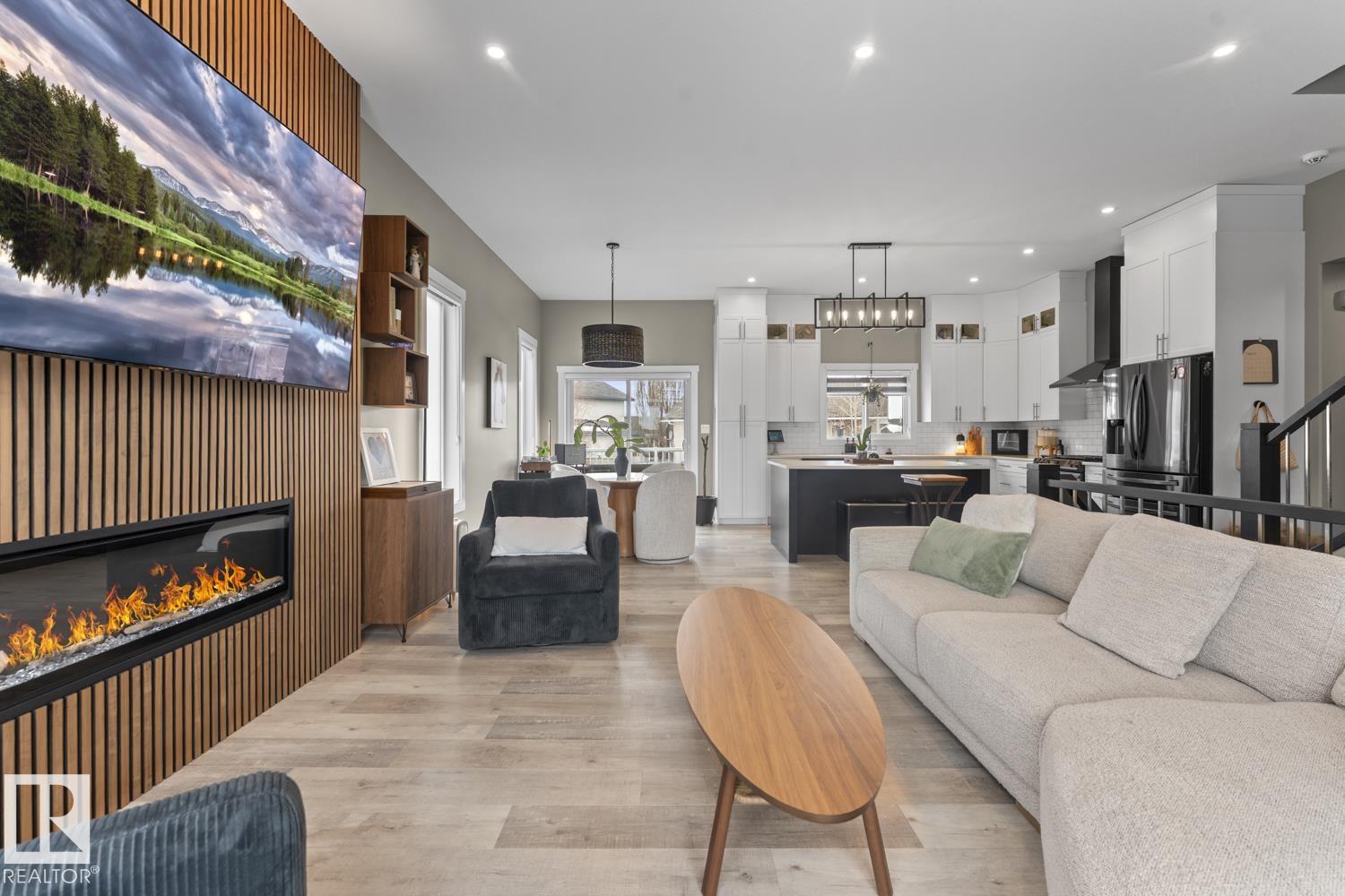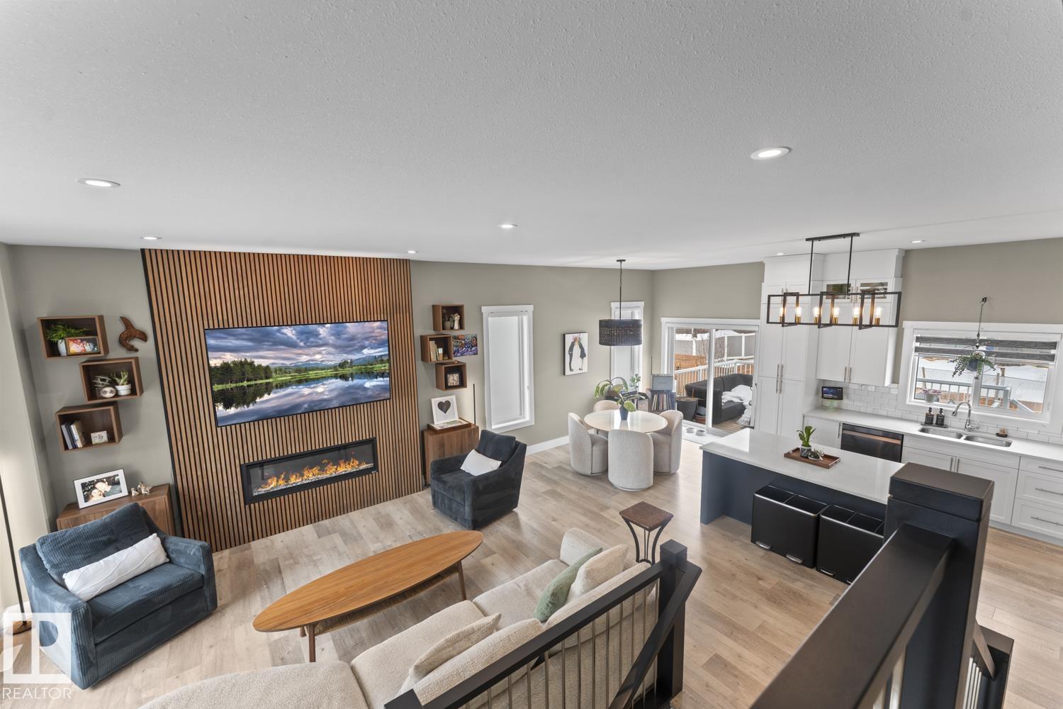 This modern 2021 bi-level in the sought out Nelson Heights neighbourhood has a fantastic location close to Kinosoo Beach & outdoor arena. Open concept with wood slat gas fireplace, spindle railings, custom window coverings, A/C and main floor laundry. 5 bedrooms, 3 bathrooms and a fully finished basement. Gourmet kitchen features a large centre island, quartz counters, SS appliances(gas stove) and chimney vent. Upper floor hosts the SPACIOUS primary bedroom with dual closets and a 4 piece ensuite with tiled shower and his/hers sinks .Lower level features a massive family room with heated floors. Upgrades to this home include NEW light fixtures, fireplace accent wall, custom window coverings, quartz counters throughout, no carpet, and central air. Outside you will find a nicely landscaped yard with trees, perennials & waterproof storage under the deck, fully fenced yard and back alley access. Attached heated double garage and oversized driveway. Basement will be painted before possession. (id:63190)