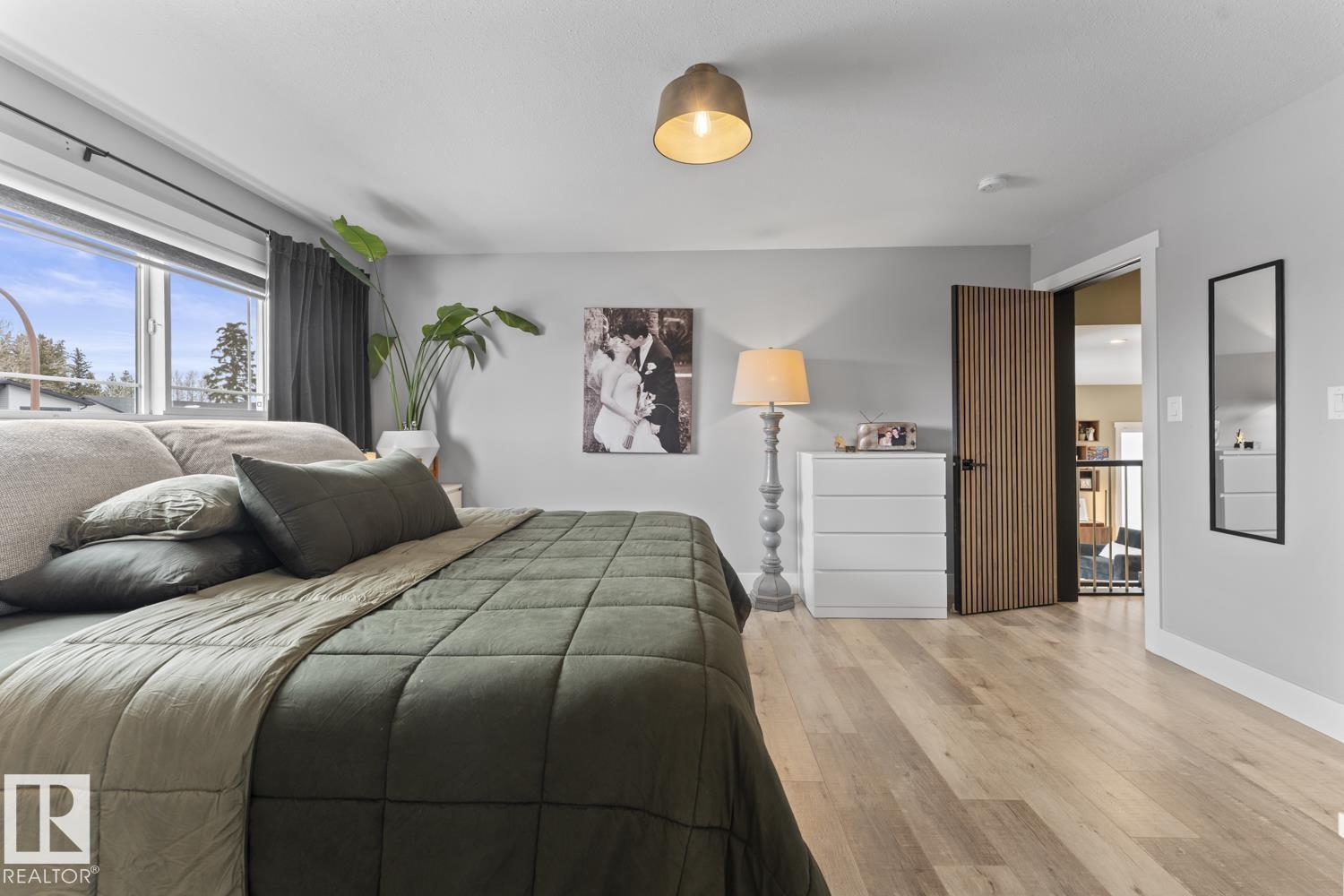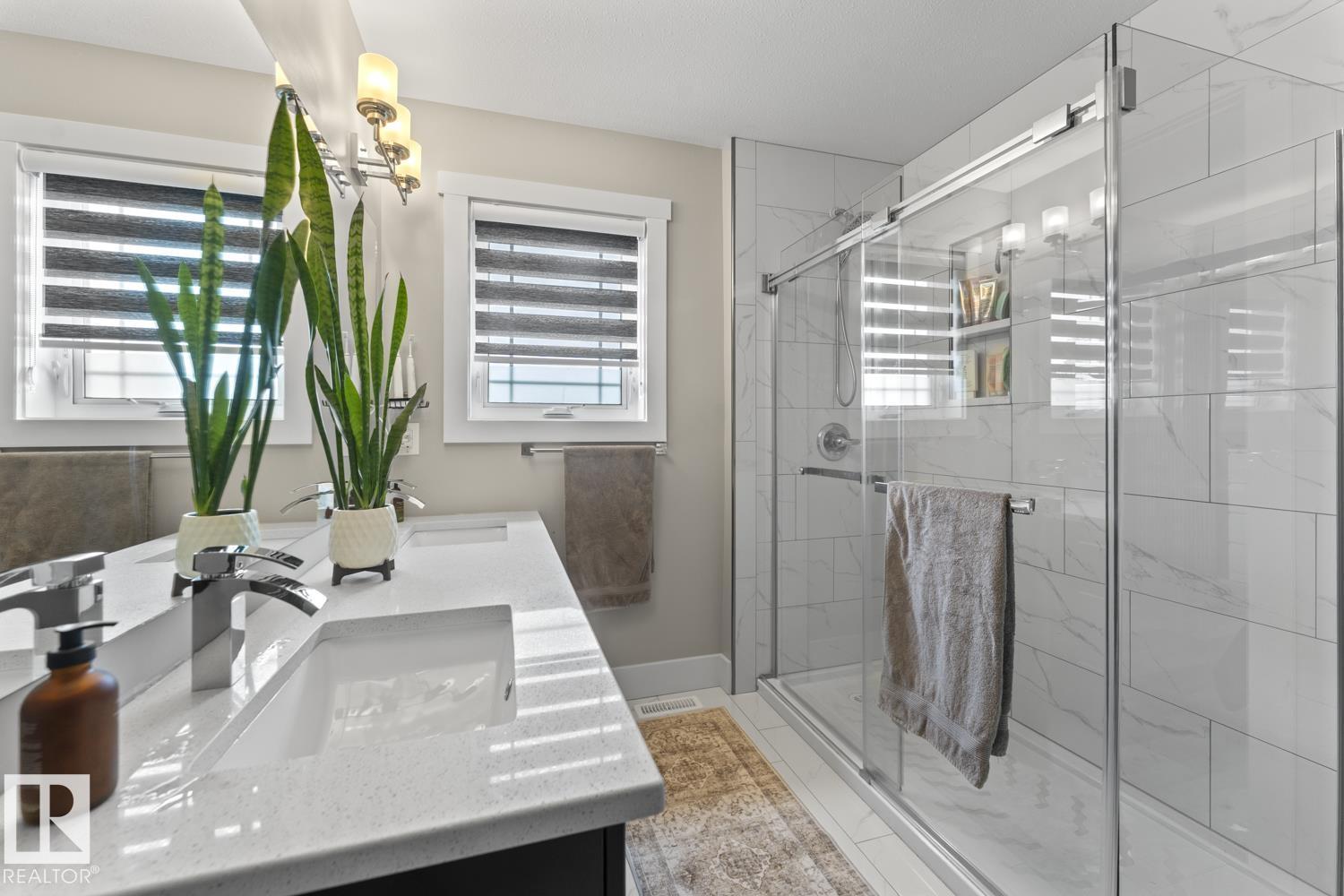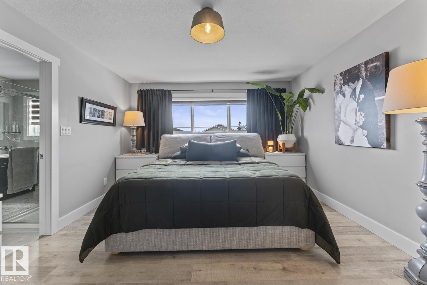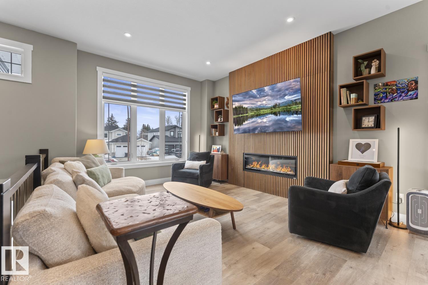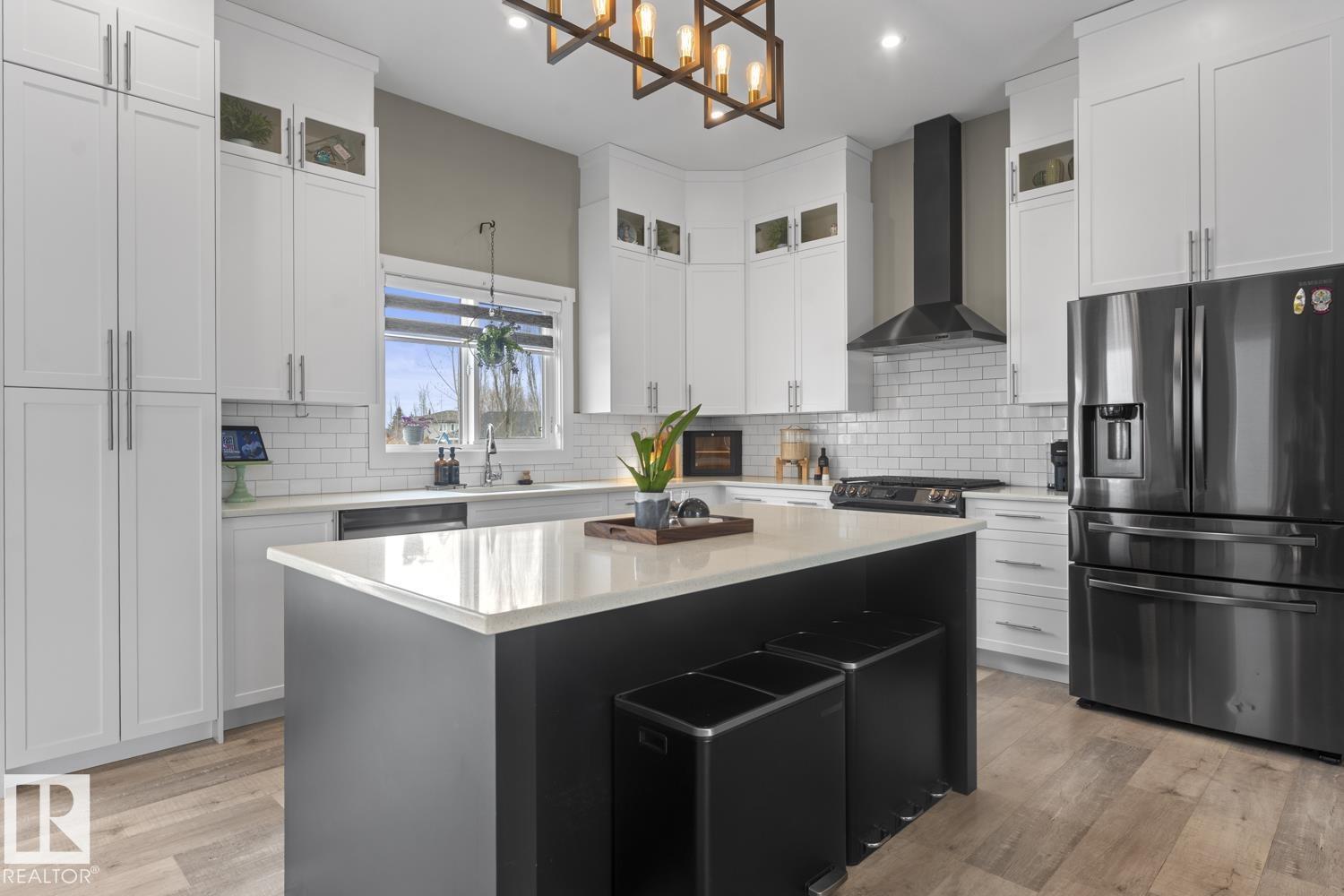 This modern 2021 bi-level in the sought out Nelson Heights neighbourhood has a fantastic location close to Kinosoo Beach & outdoor arena. Open concept with wood slat gas fireplace, spindle railings, custom window coverings, A/C and main floor laundry. 5 bedrooms, 3 bathrooms and a fully finished basement. Gourmet kitchen features a large centre island, quartz counters, SS appliances(gas stove) and chimney vent. Upper floor hosts the SPACIOUS primary bedroom with dual closets and a 4 piece ensuite with tiled shower and his/hers sinks .Lower level features a massive family room with heated floors. Upgrades to this home include NEW light fixtures, fireplace accent wall, custom window coverings, quartz counters throughout, no carpet, and central air. Outside you will find a nicely landscaped yard with trees, perennials & waterproof storage under the deck, fully fenced yard and back alley access. Attached heated double garage and oversized driveway. Basement will be painted before possession. (id:63190)