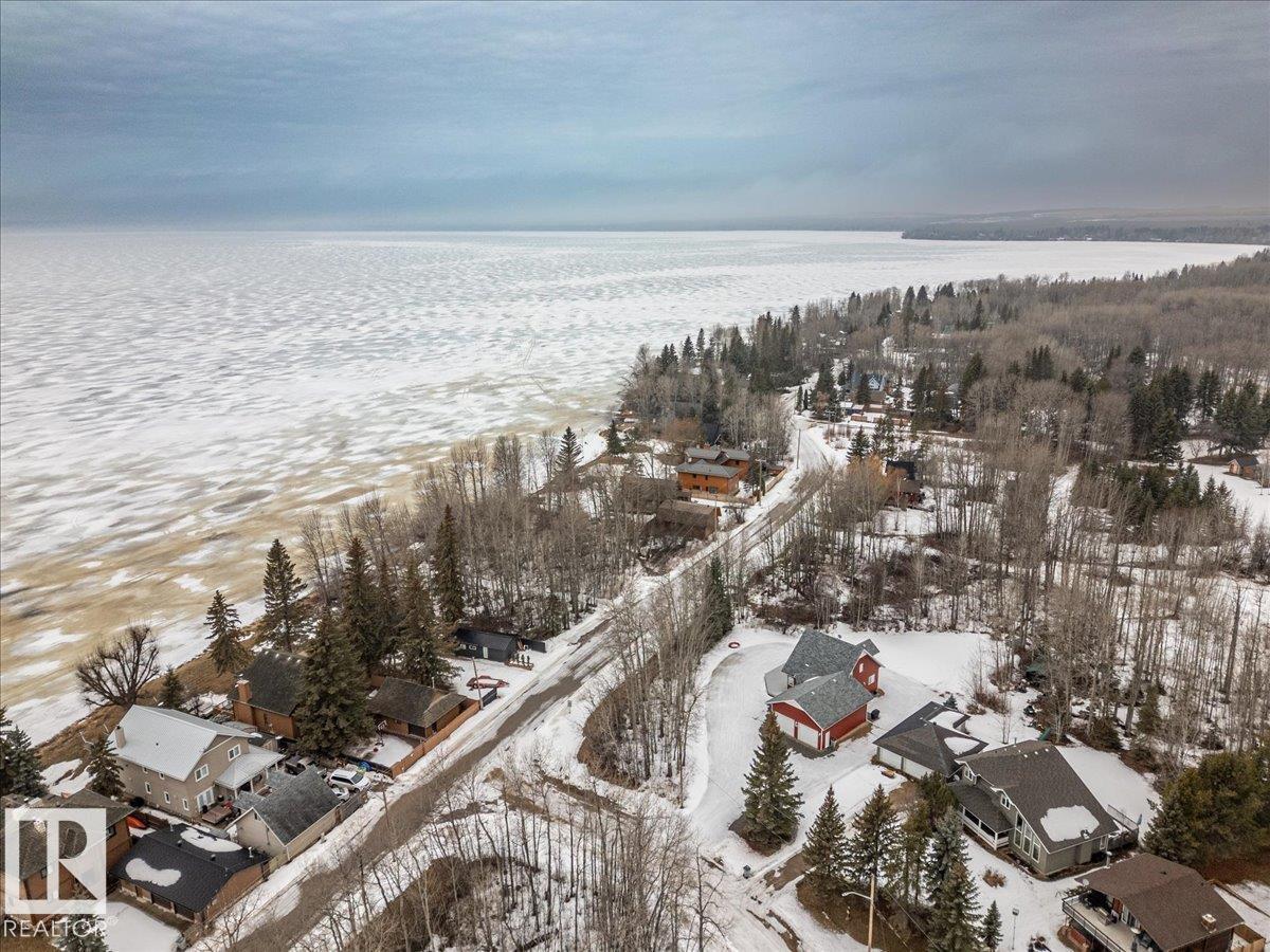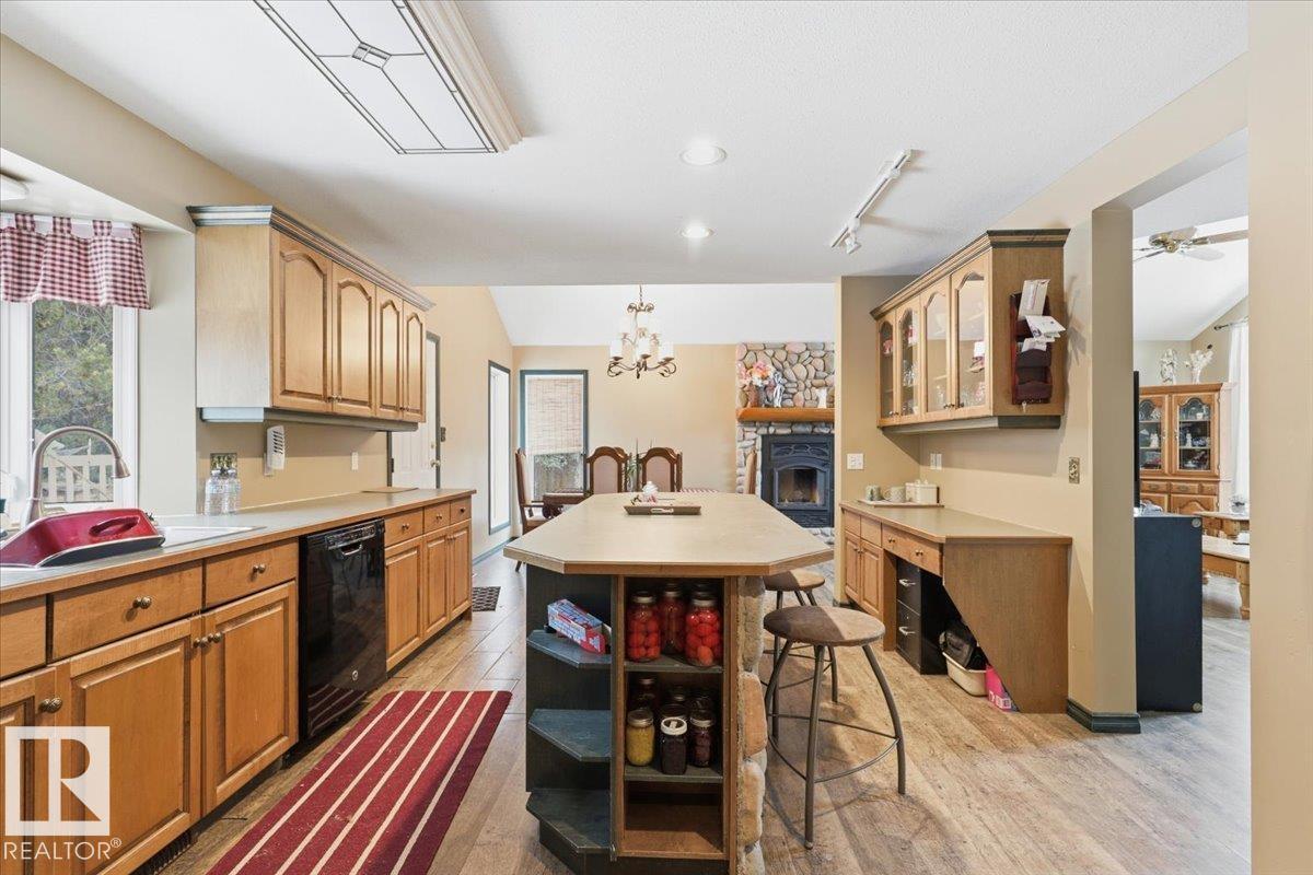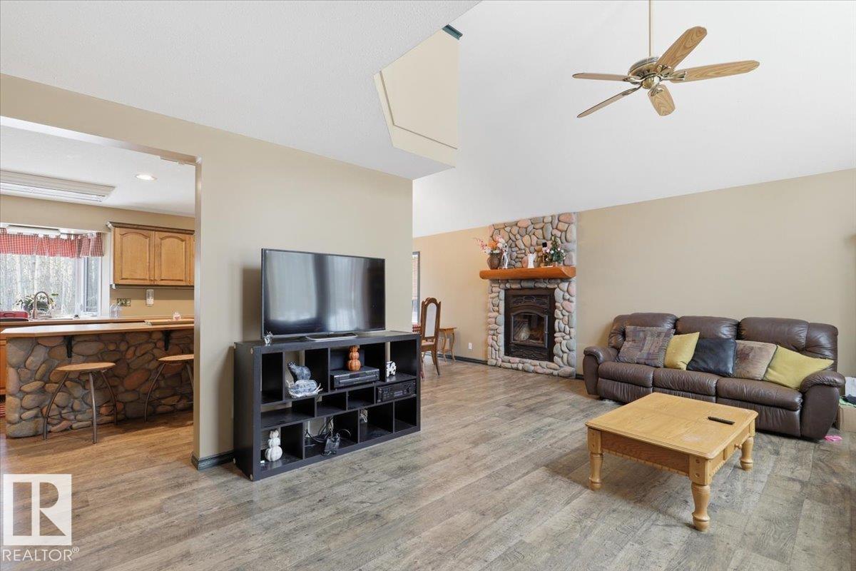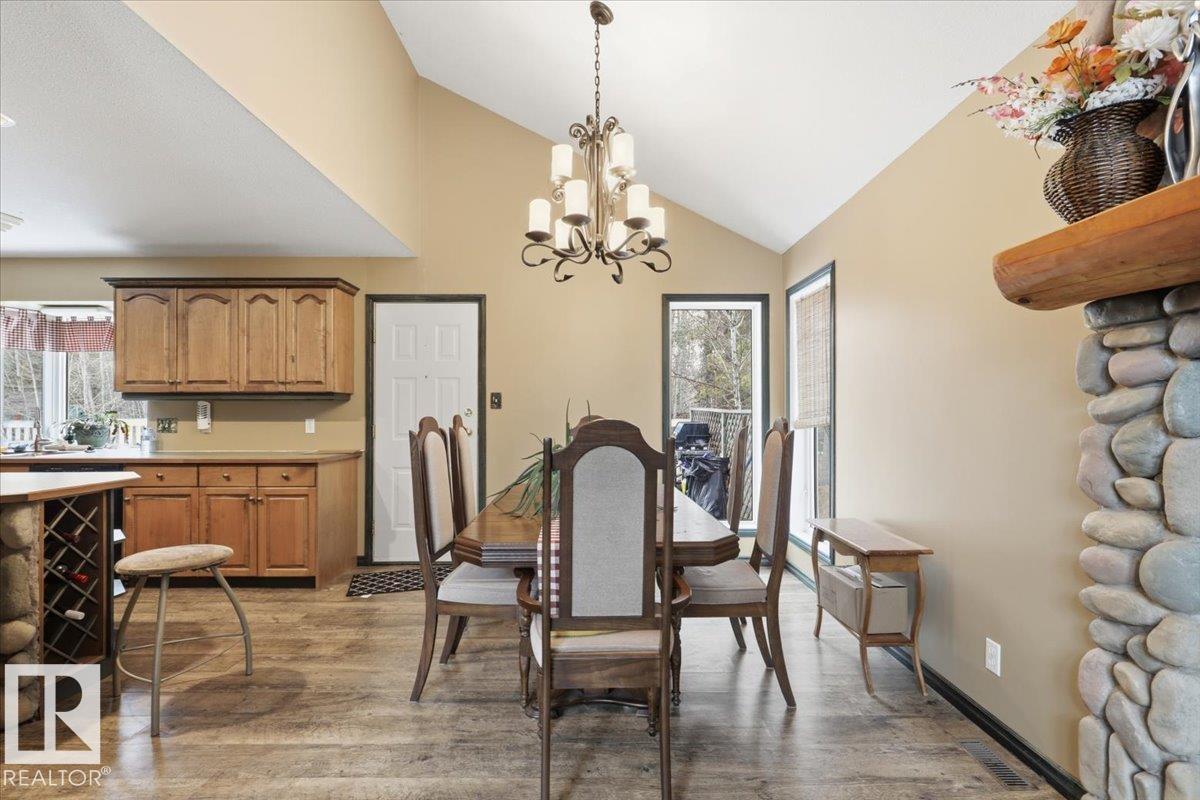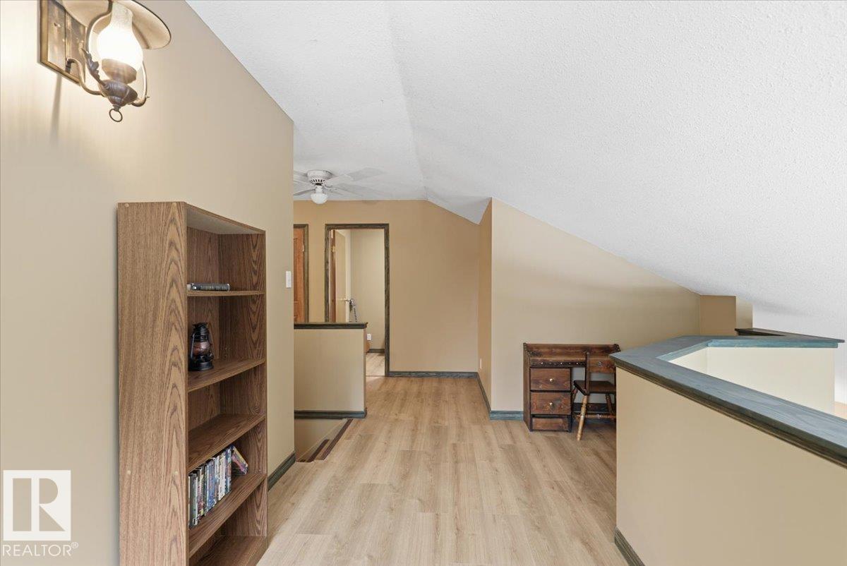 Located within walking distance to the Lake, sits this Country Style 1.5 Storey home with a Triple Detached Garage! Past the front covered deck and inside the home, the spacious living room greets you with large windows, a vaulted ceiling, and a stone fireplace. The kitchen has lots of cabinets, an island, and is open to the dining area. The Primary Bedroom is also situated on the main level with an ensuite bathroom and a make up desk with a sink. Another 2 piece bathroom, and the laundry room conclude the main floor plan. The upper level hosts a loft, office, two more bedrooms, and a 4 piece bathroom. A large deck off the back of the home overlooks the spacious, treed backyard. The large Triple detached garage is heated with a cement floor, power, and has a guest suite off the back. This Property is the perfect blend of country living, and life at the lake! (id:63190)